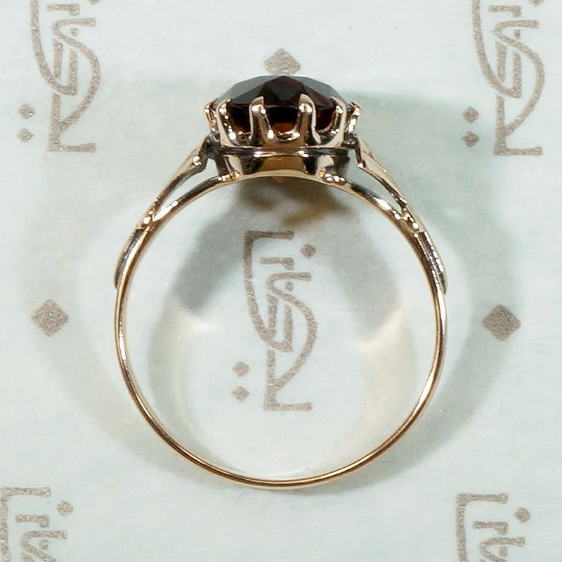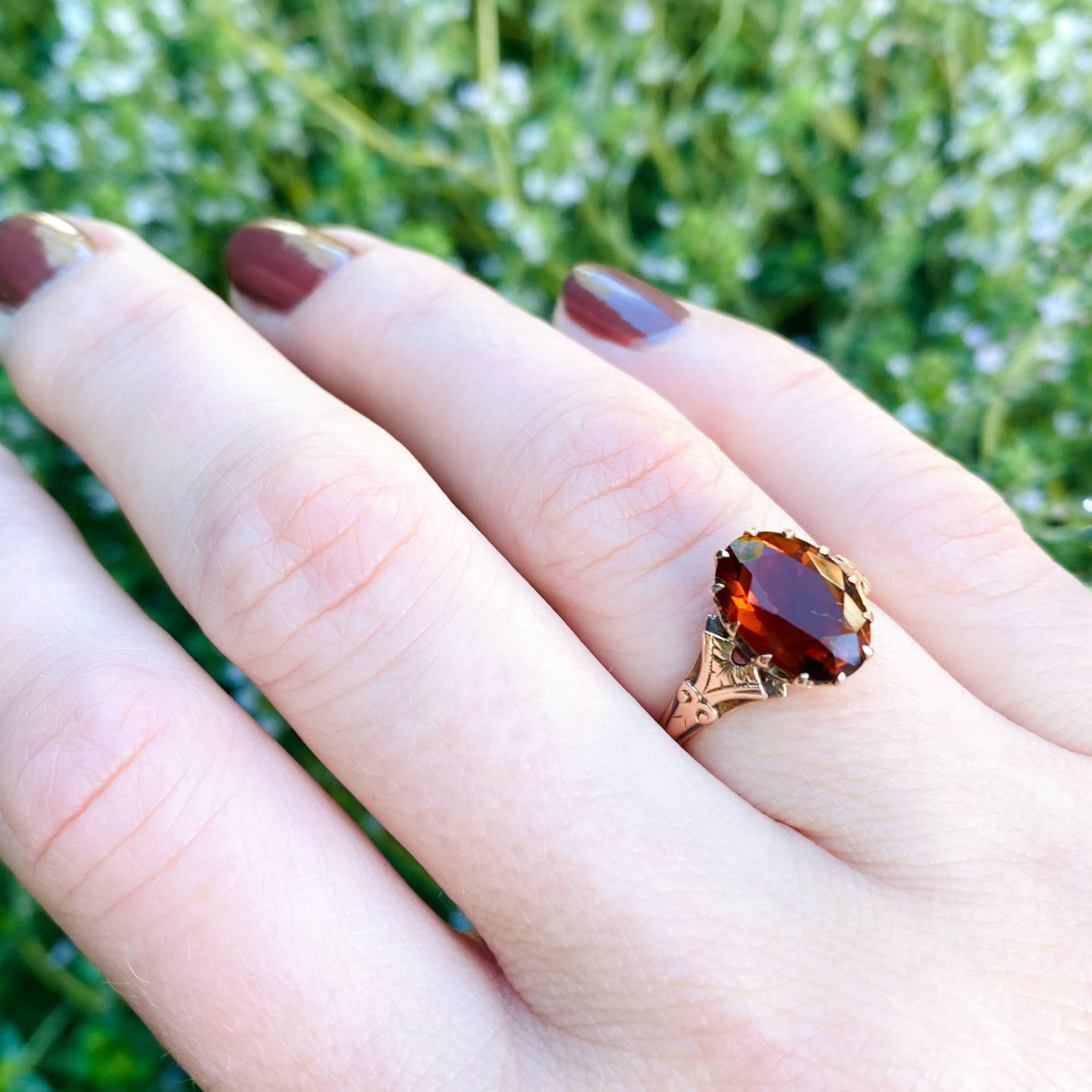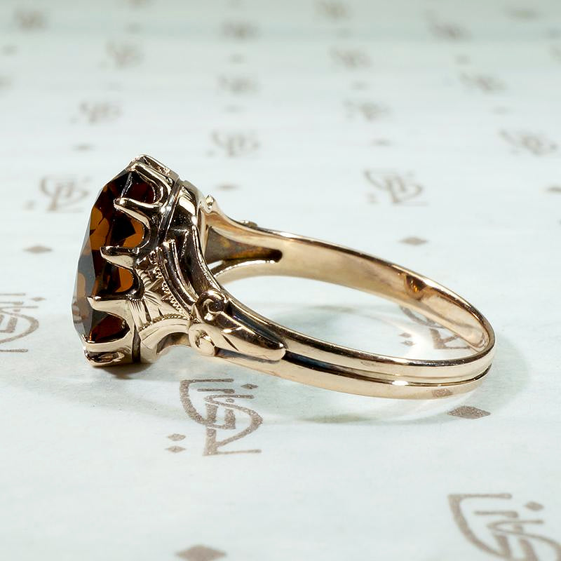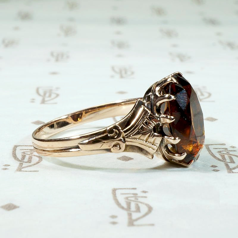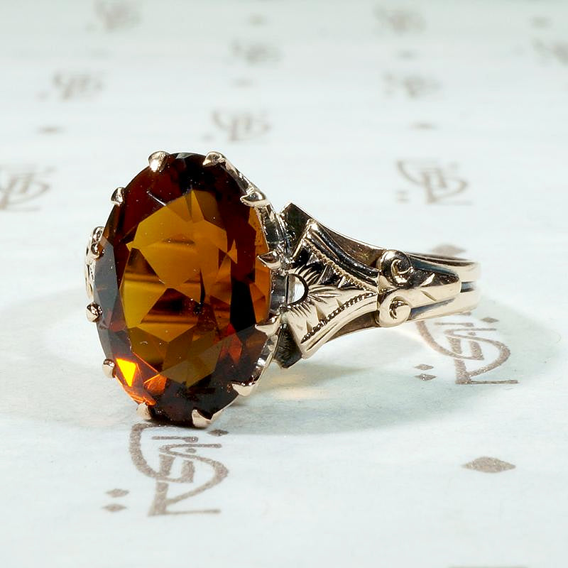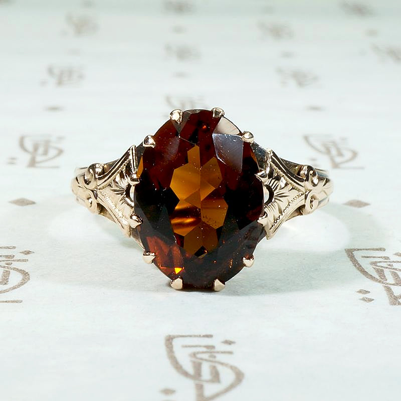 This gorgeous Madeira citrine glows in a classically Victorian ring. The oval citrine is mouthwatering, such a deep, rich red-gold-orange color. The gem is beautifully displayed in a 12-prong claw setting. The 14k rose gold setting is exquisitely engraved with acanthus leaves and scrollwork at the cathedral shoulders. The band is grooved around the shank. A fabulous gift for your favorite Scorpio. Circa 1890.