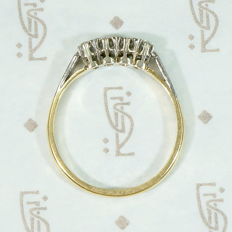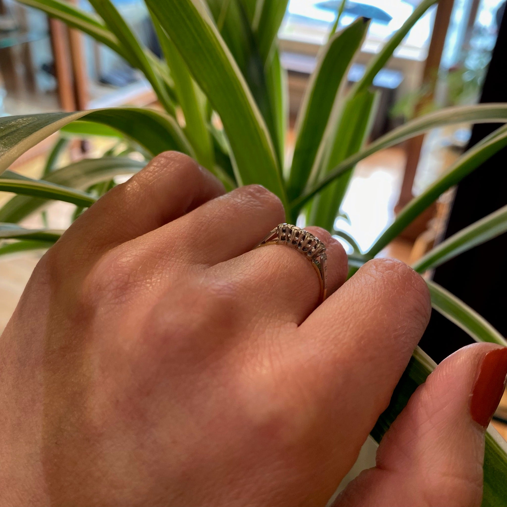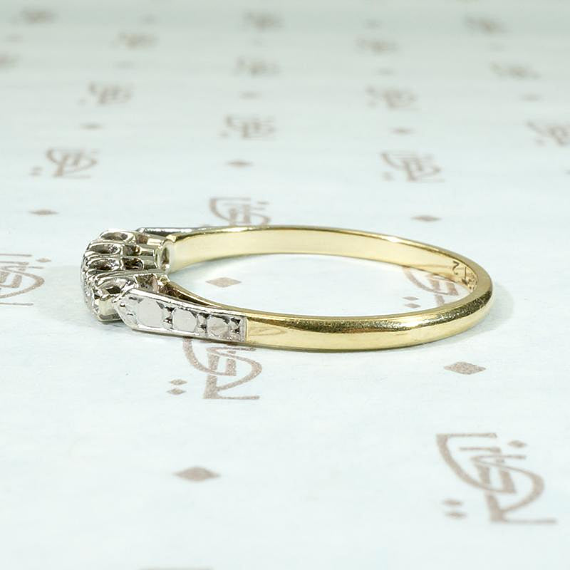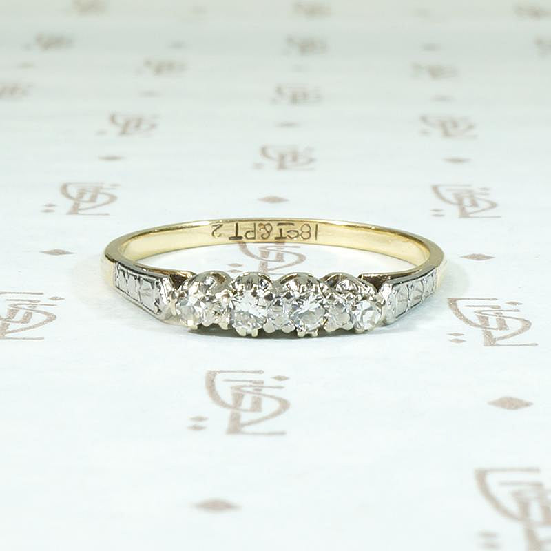 A scalloped arc of four bright diamonds are set in platinum over an 18ct yellow gold band. The pinched cathedral shoulders are overlaid with panels of engraved platinum. The gold body of the ring tapers back into a slim band. Gorgeous, there is something particularly refined about this one. This band will pair with your vintage engagement ring, and it has the strong presence that will stand alone beautifully. Circa 1920.