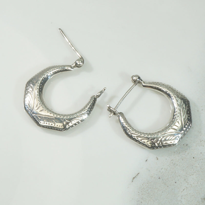 Hand engraved with the hinged bar snap closure that makes them easy to wear. These hoops make a dramatic statement, yet remain surprisingly lightweight. Circa 1980s.