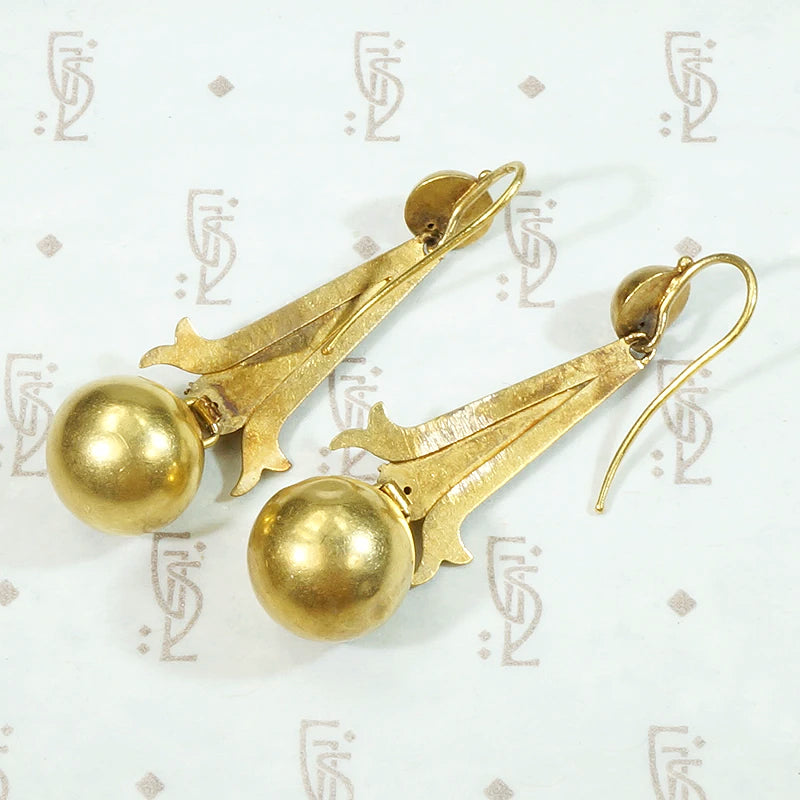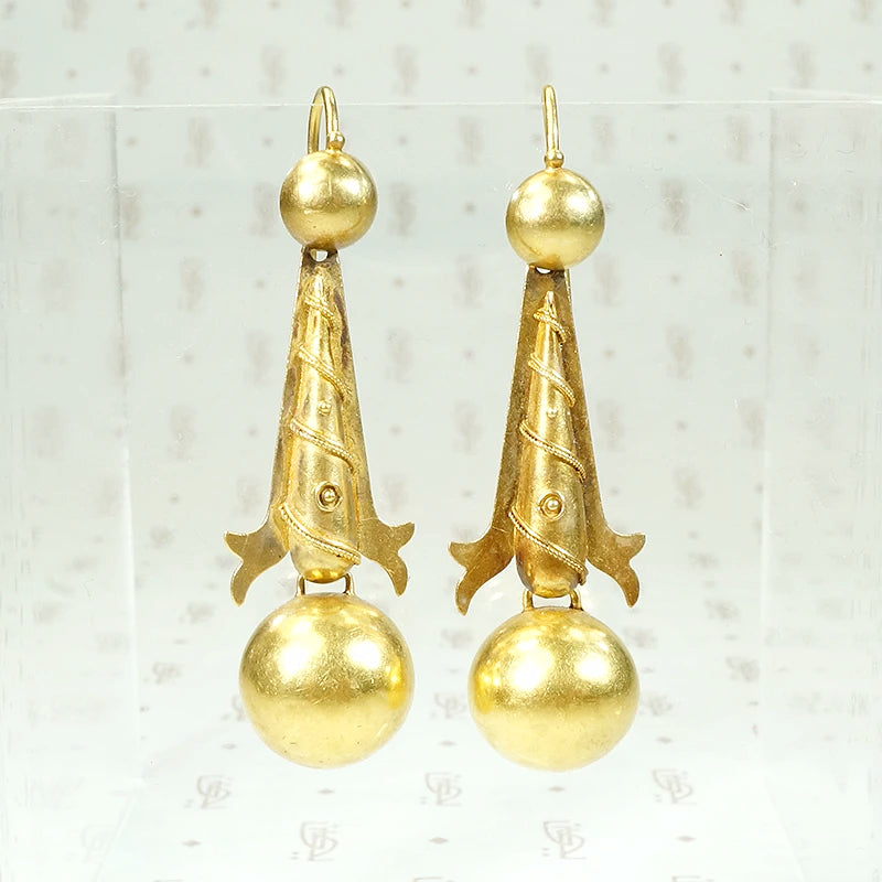 Lovely Victorian earrings are getting harder to find, and this pair is especially fine. The top of the 15ct gold earrings are half-spheres on French ear wires. The body of the earring is a decorative panel, shaped rather like a half-torpedo with flourished wings and embellished with Etruscan Revival designs of applied wire and bead work. A gold ball is suspended from the bottom. The earrings are hinged at the top and the bottom of the panels. They move beautifully when worn, and they aren't too heavy on the ear. A light gold bloom covers the surface. Bloom is an alluring iridescent effect that occasionally develops on antique gold. These are marvelous, as dramatic as they are wearable. Circa 1870.