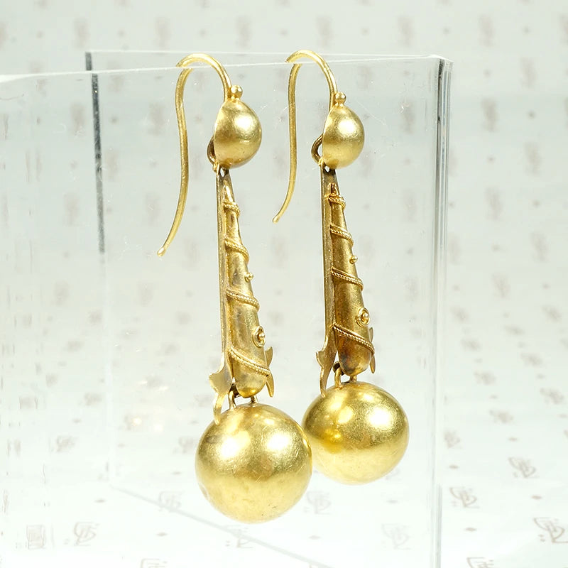 Details.....The earrings measure 1.91" by 0.55" and the ball is 12.2mm in diameter. In Very Good Antique Condition. Some wear is to be expected on vintage and antique jewels, it a part of their charm.