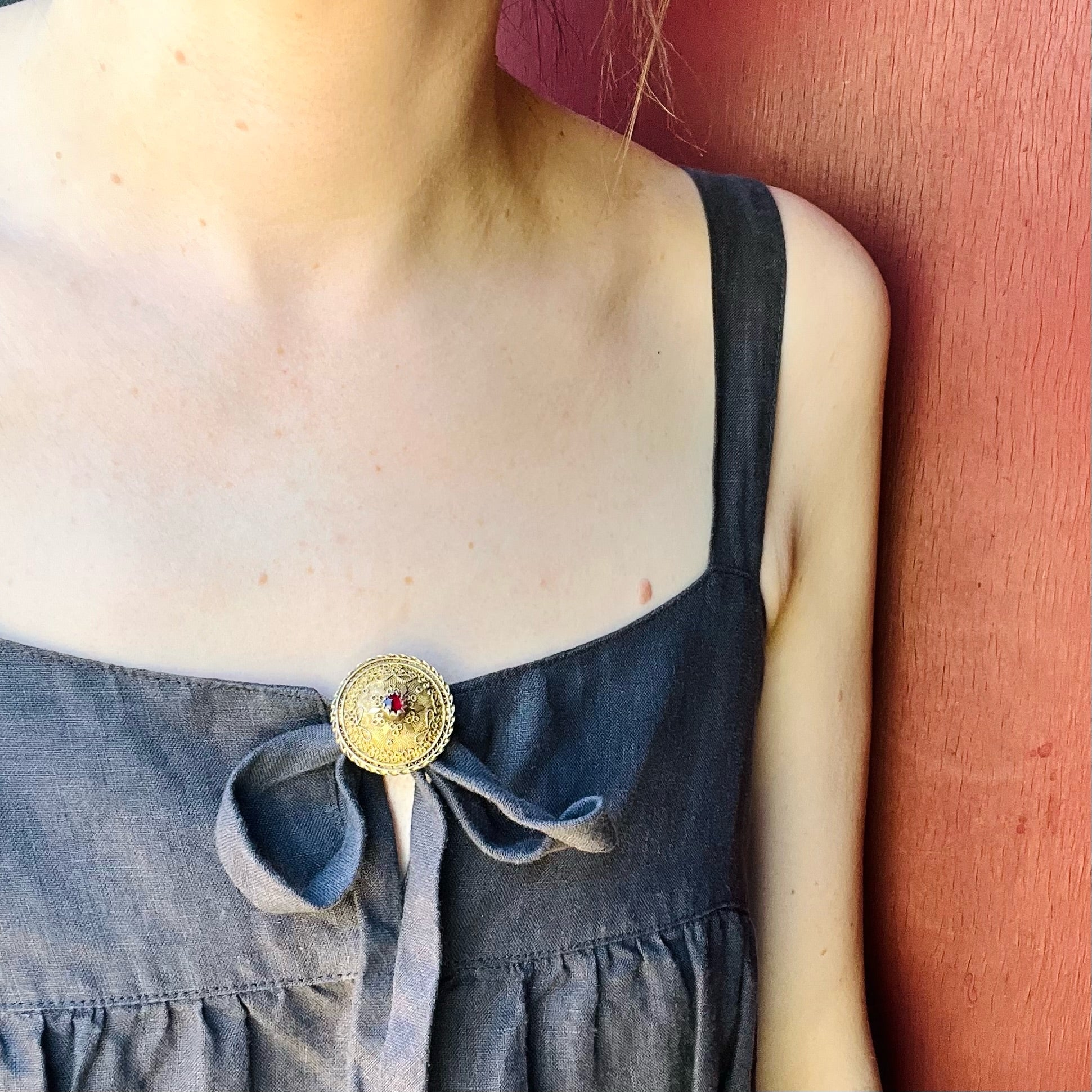 An Etruscan Revival shield brooch in delicate 800 silver gilt filigree. The archeology-inspired design of wirework, granulation and applied details is wonderfully ornate. A faceted garnet sits at its center in a raised sawtooth bezel. The piece secures with a safety clasp. Circa 1900.