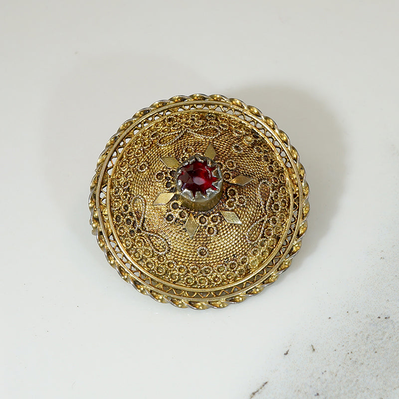 Etruscan Revival Garnet in Silver Gilt Filigree Brooch