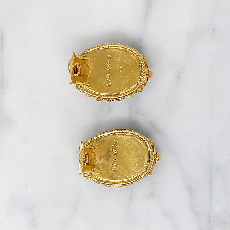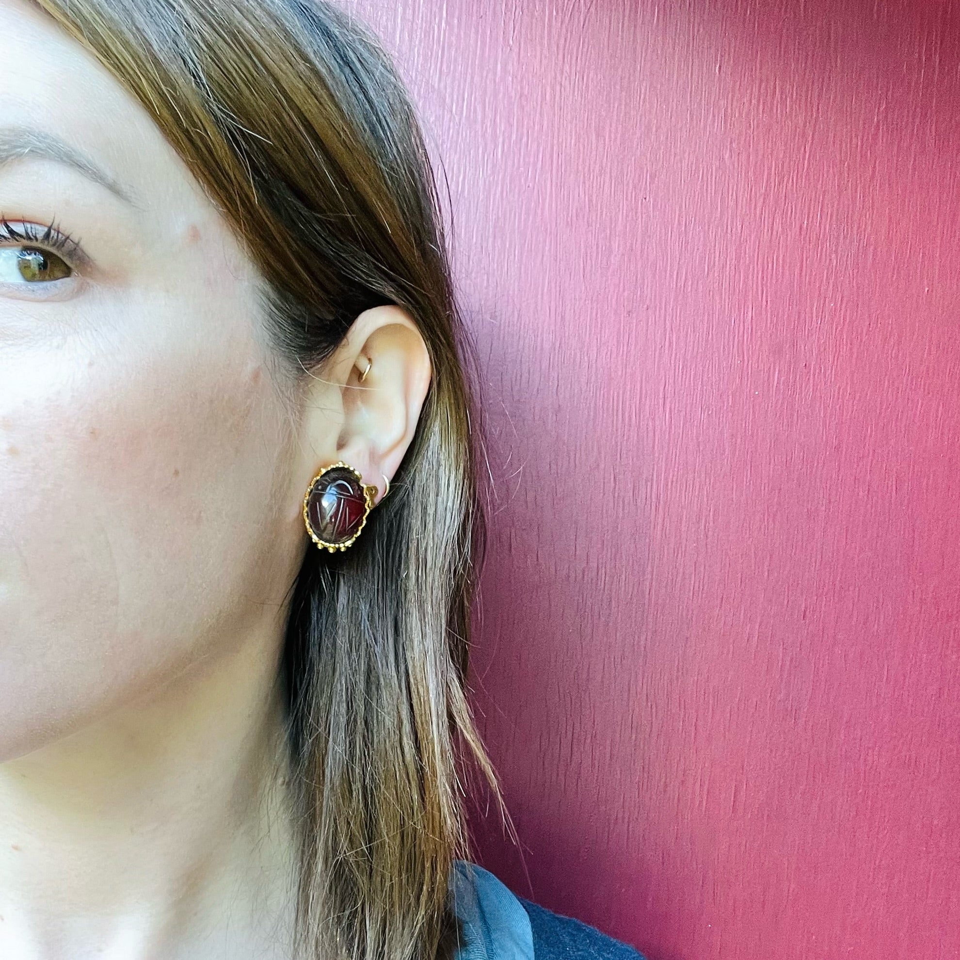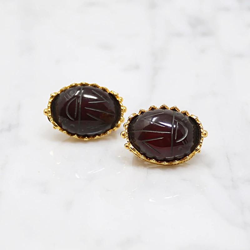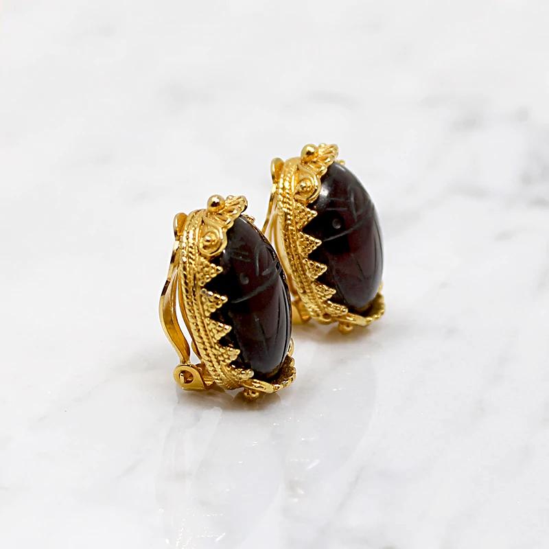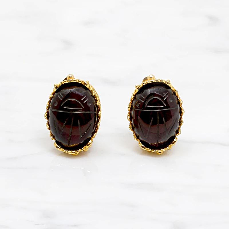 Delicious vintage archeological reproduction scarab earrings from the Metropolitan Museum of Art. Garnet carbuncles have been carved with the perennially popular scarab motif. The garnets are set in exquisite Etruscan Revival clip earring settings. The settings are gold-filled metal, with the look of ancient 24k gold. The back of the earrings are signed "MMA WAG". A gorgeous memento of a spectacular exhibit. Circa 1980.