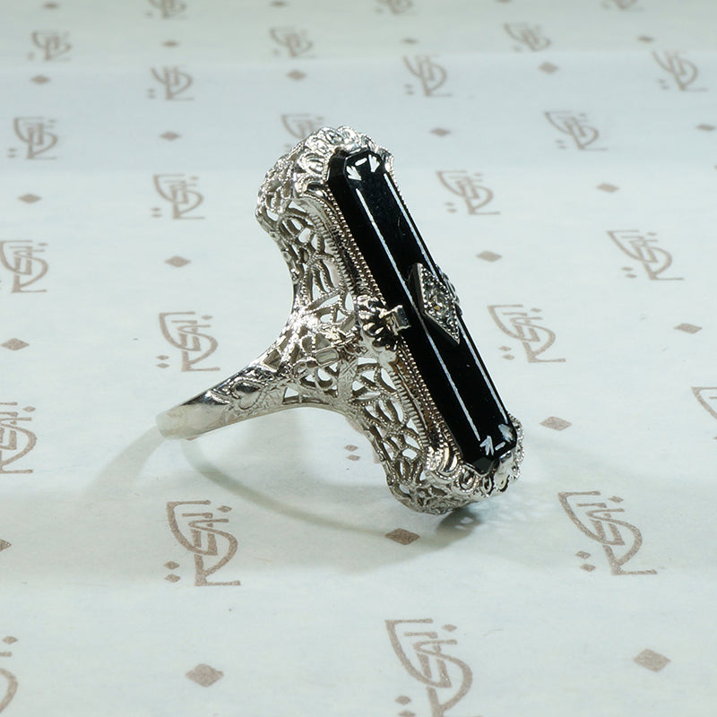 orgeous from every angle. A long, narrow slab of onyx sits in an ethereal filigree ring. The entire 14k white gold setting is covered with engraved details and lacy embellishments. This onyx is painted with white enamel decoration and a tiny diamond set in a diamond-shaped central plaque. This fabulous ring is Art Deco to its core. Circa 1920.
