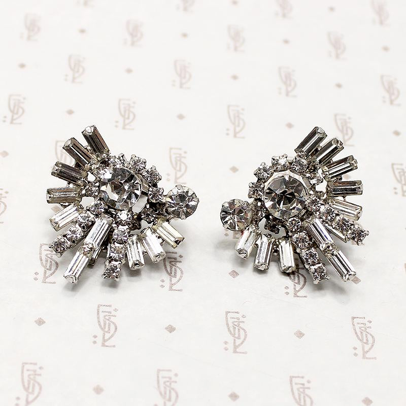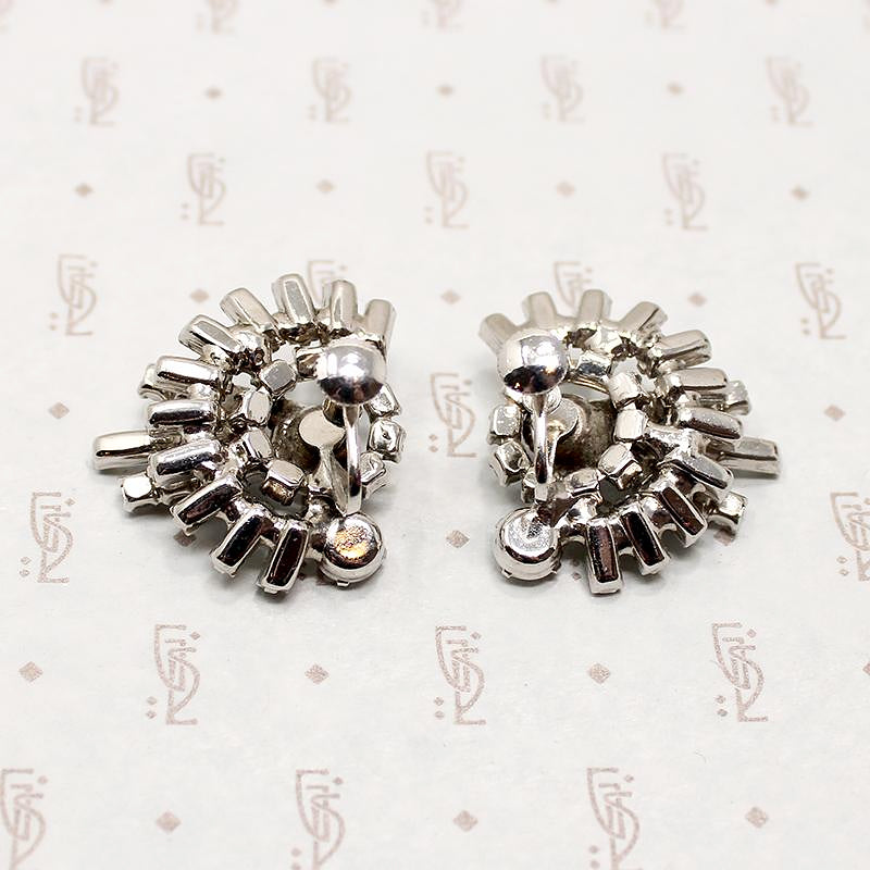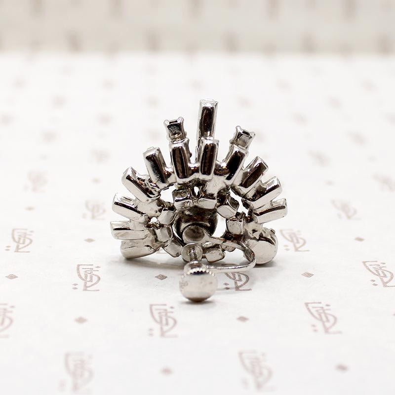 Absolutely dazzling...these magnificent costume earrings are a spectacular explosion of round and baguette white rhinestones. They are asymmetric, with a three-dimensional quality that gives them a sense of vitality and motion. The rhinestones are set in icy silver-tone metal that elevates their sparkle. These earrings are screw back, allowing you to wear earrings if your ears are not pierced. Screw back earrings were the fashion of the time, clip or screw on earrings were predominantly a 20th Century trend. The screws have a fascinating mechanical construction that allows you to adjust the pressure on your ear lobe. Circa 1960.