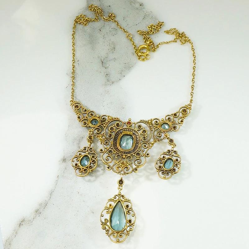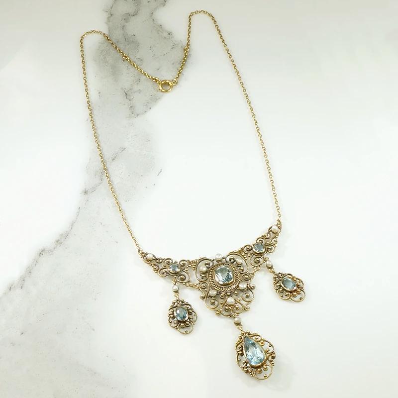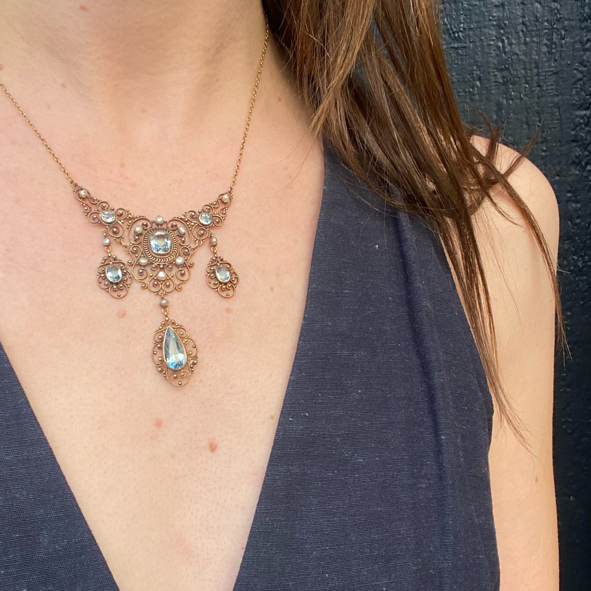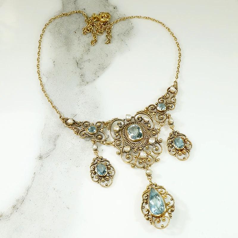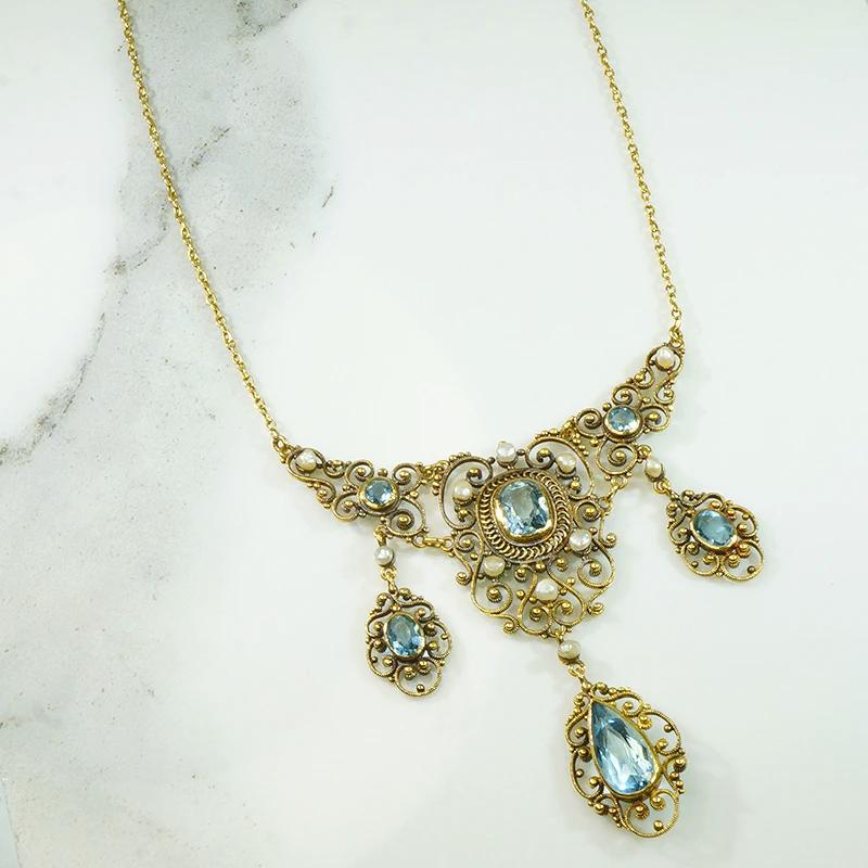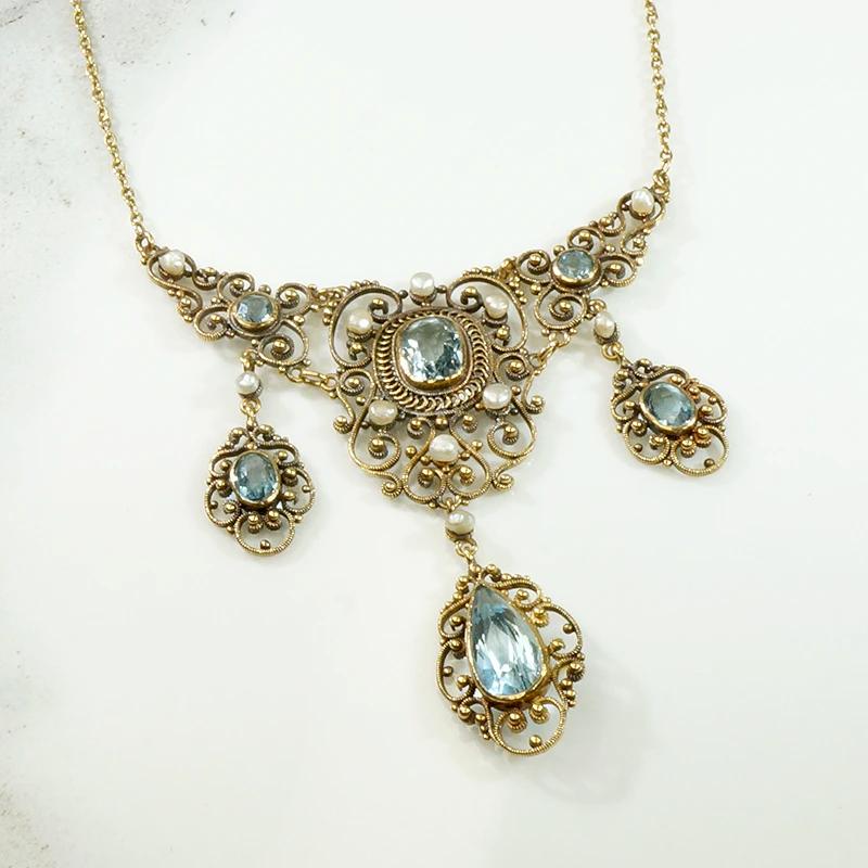 Curlicues of gold and an abundance of rich blue Aquamarines make this necklace stunning! Elaborate hand-worked details on every surface, over 6 carats of natural vibrant Aquamarines and natural American River Pearls, this filigreed beauty will become the centerpiece of your jewelry collection.