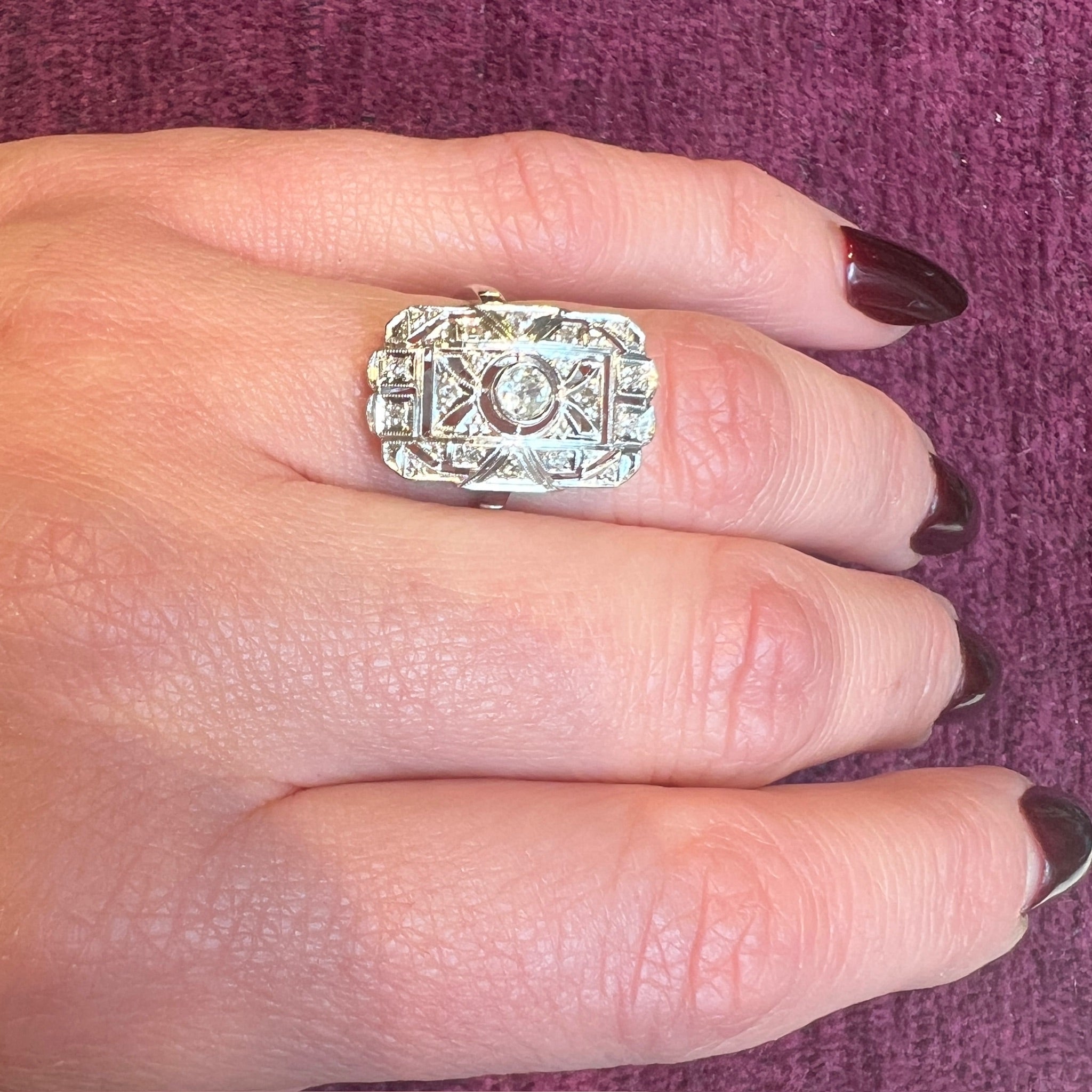 The exquisite symmetry of this Art Deco panel ring is delightful. Diamond-spangled platinum is light and lacy with complex geometry. The rectangular platinum panel is pierced and engraved with a delicacy resembling an icy cobweb. The diamonds have a .40tcw; a larger center stone is bezel set with a bevy of small glittering stones frosting the metalwork. Cathedral shoulders and a fabulous openwork gallery lift the ring slightly above the finger. There is a lot of glamour here, and this ring's artistry elevates it above the fray. Circa 1920.