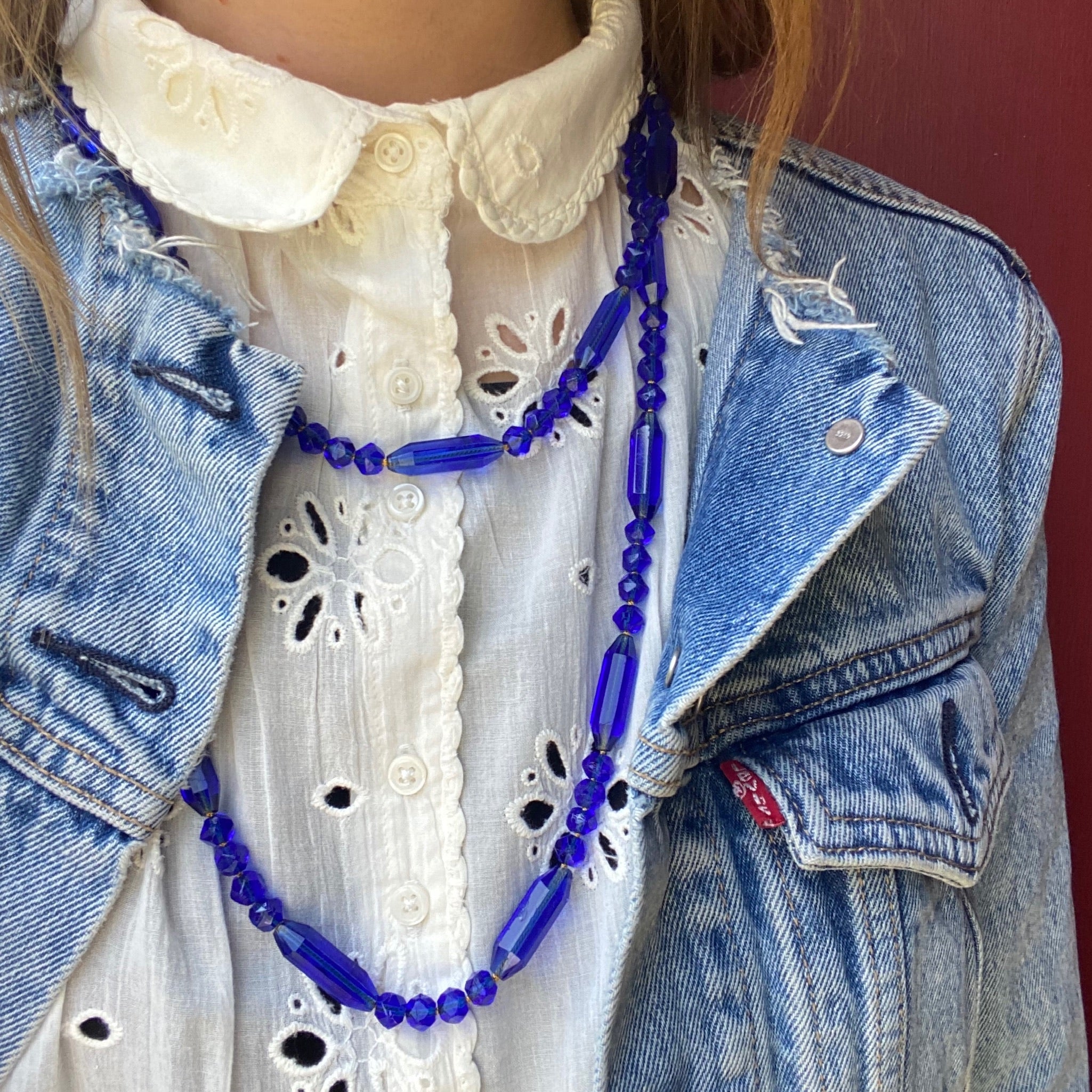 This exquisite strand of bright blue glass beads is extra long and extra gorgeous. These fabulous beads are crisply faceted beveled tubes separated by smaller spacer beads. The spacer beads have an interesting irregular shape. They are freshly hand knotted on gold-colored silk. The contrasting colors are lovely. Circa 1920. Just imagine the parties this necklace has attended.