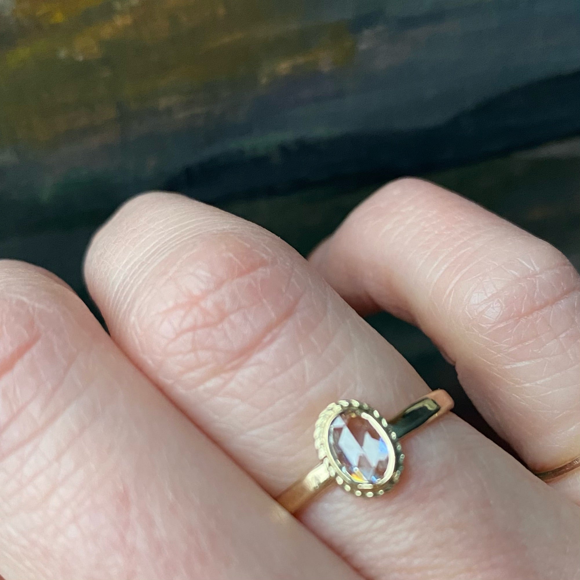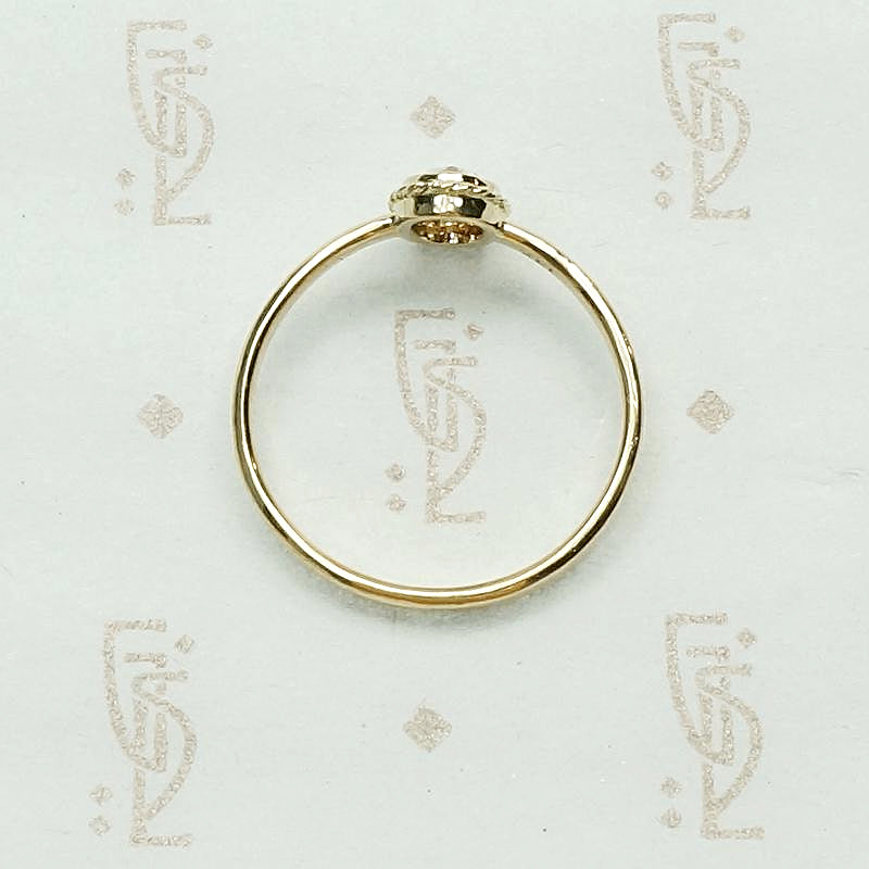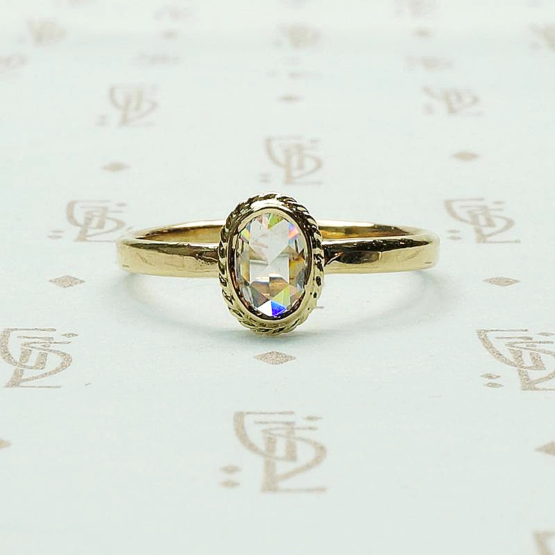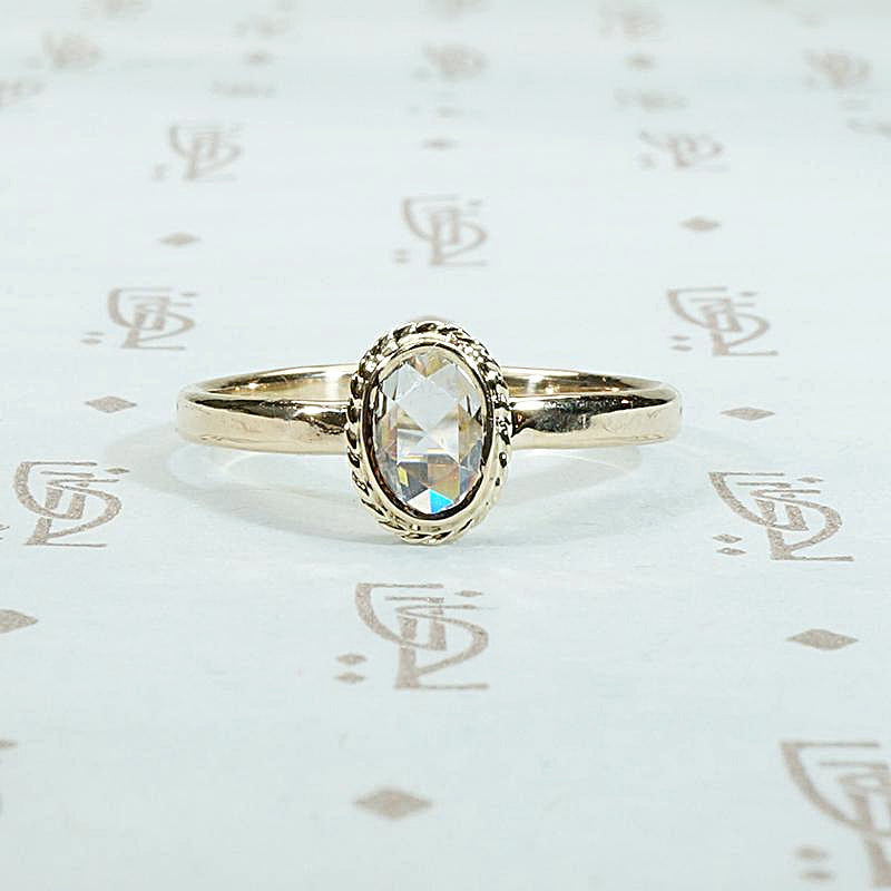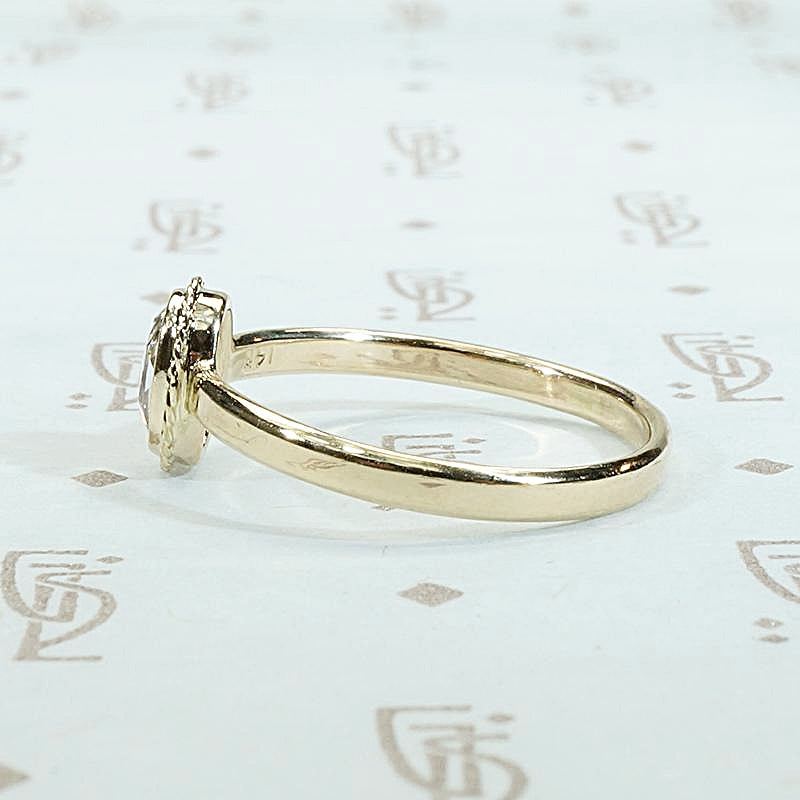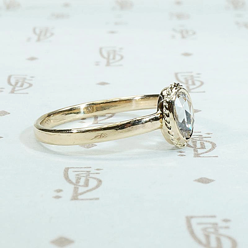 A fancy light brown oval rose cut diamond in an elegant gold setting. This delightfully unique engagement ring was lovingly handmade in our studio. The antique 0.38ct diamond is bezel set, with a lovely frame of twisted gold wire, above a slim band. This beautifully cut, fancy light brown diamond sparkles brilliantly with all the colors of the spectrum. The gorgeous antique diamond sits close to the finger with a low profile that makes this ring practical and easy to wear. The diamond hails from our own collection of vintage stones and the 14k yellow gold is recycled.