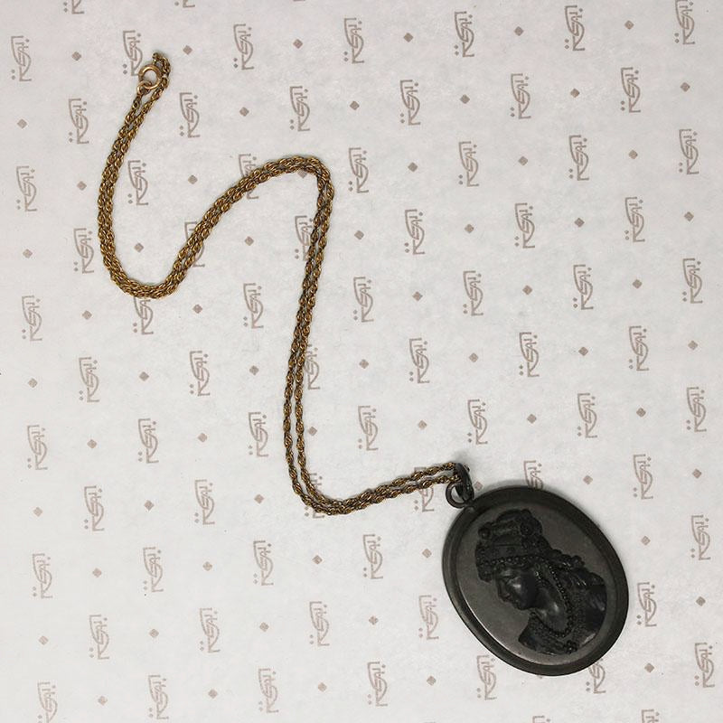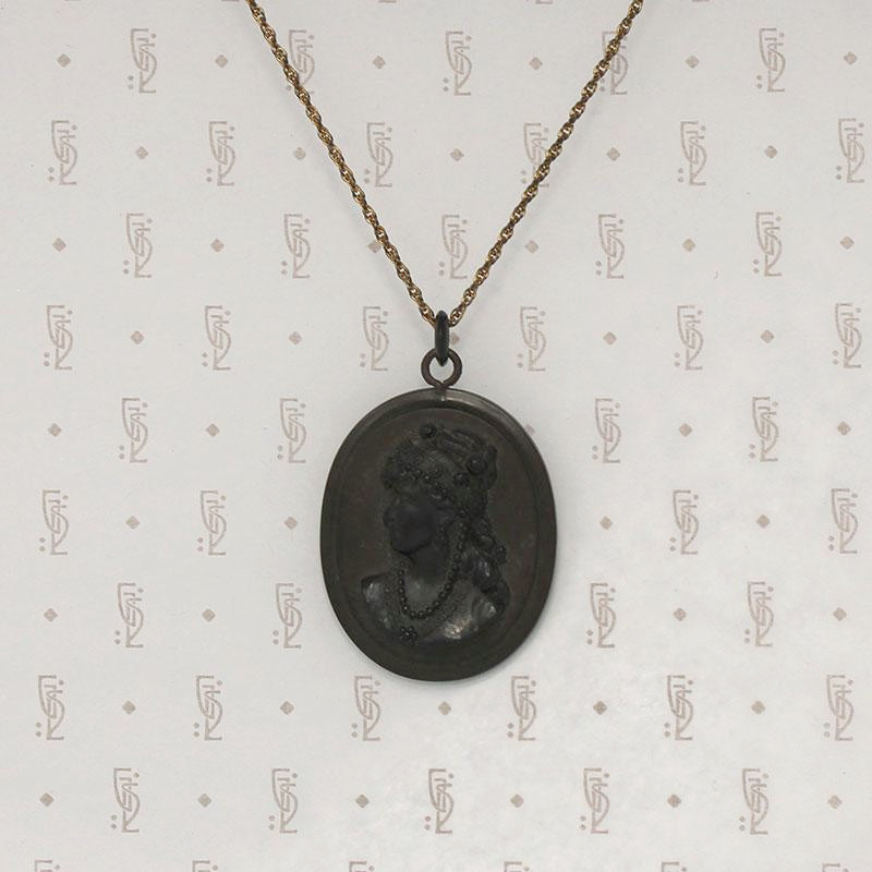 This fabulous cameo pendant features the profile of a beautiful woman wearing an elaborate coiffure, exquisite jewels and a lovely gown. The woman is sensitively carved from jet. The jet carving is attached to a plaque of gutta percha. This wonderful Victorian pendant hangs from a vintage gold filled rope chain. Circa 1880.