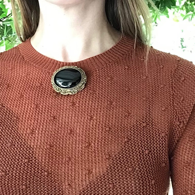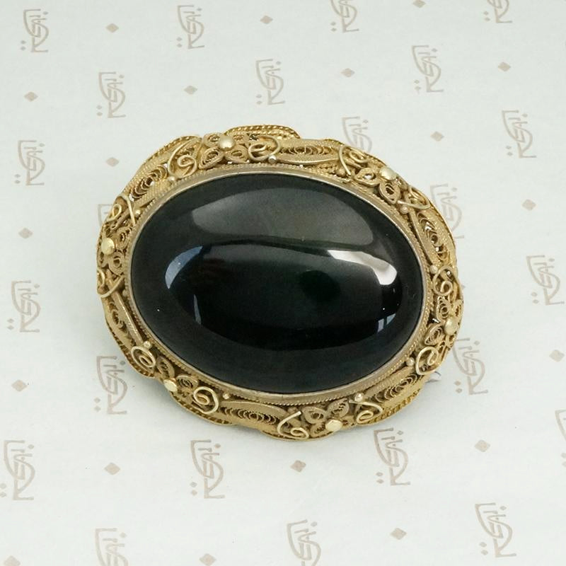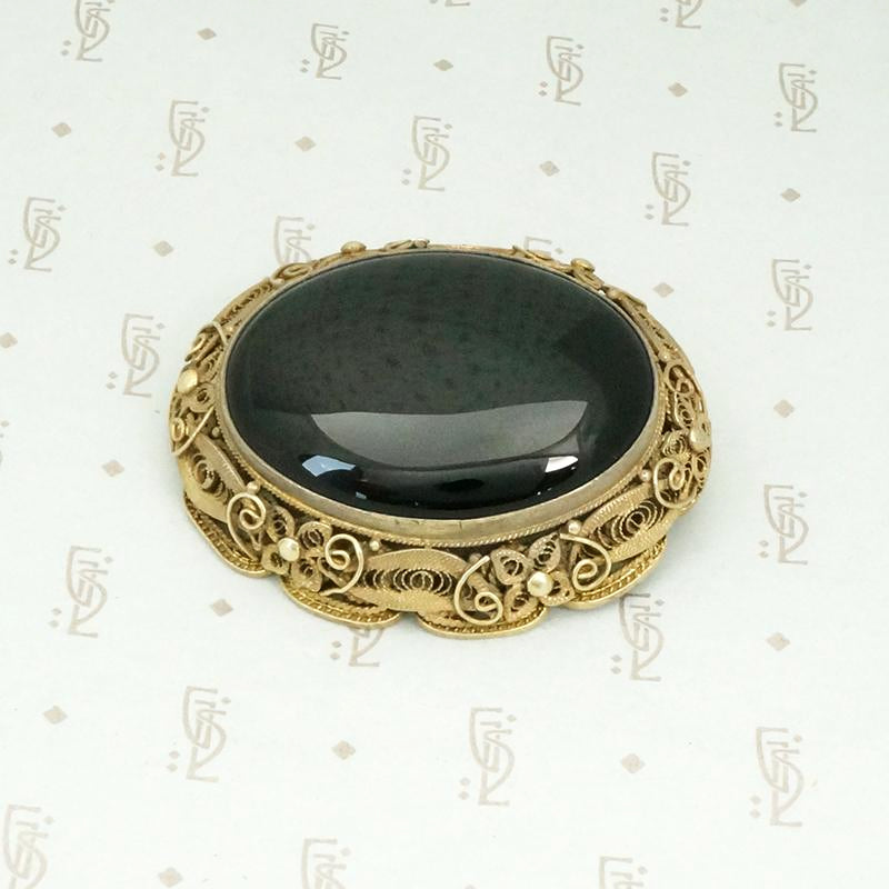 A glossy oval of cabochon cut onyx is framed in a wonderful filigree sterling silver gilt setting. The filigree is exquisitely lacy, beautiful on the back as well as the front. The pin is a secure safety clasp. The generous size of this brooch makes it ideal for wear on a coat or jacket. Circa 1920.