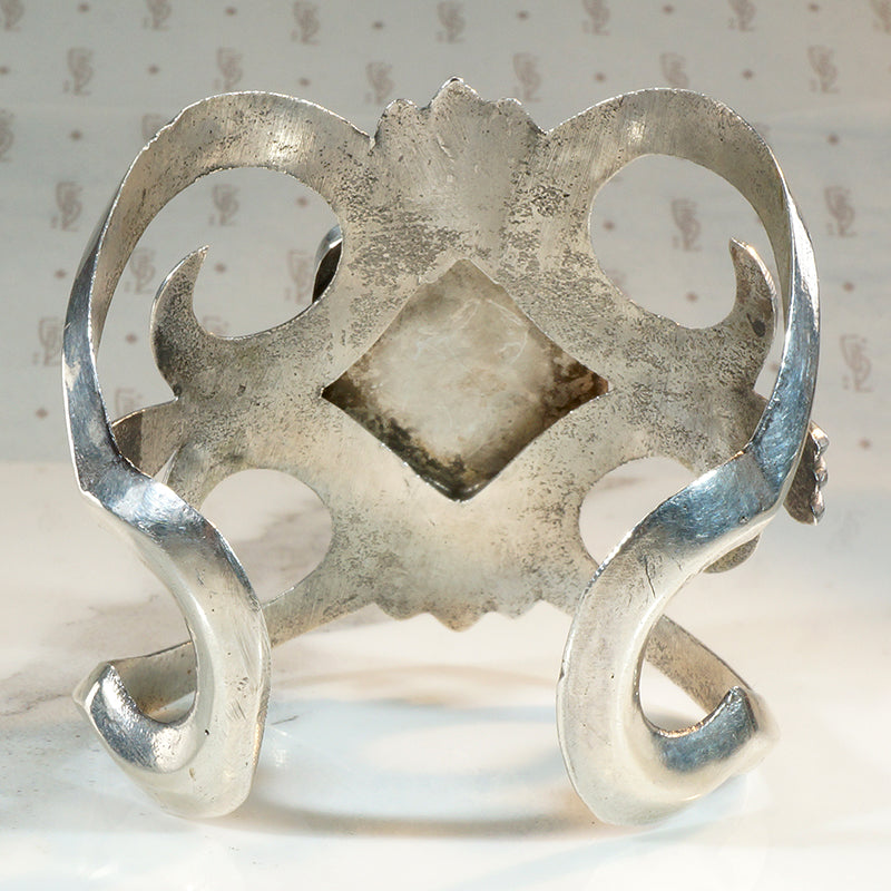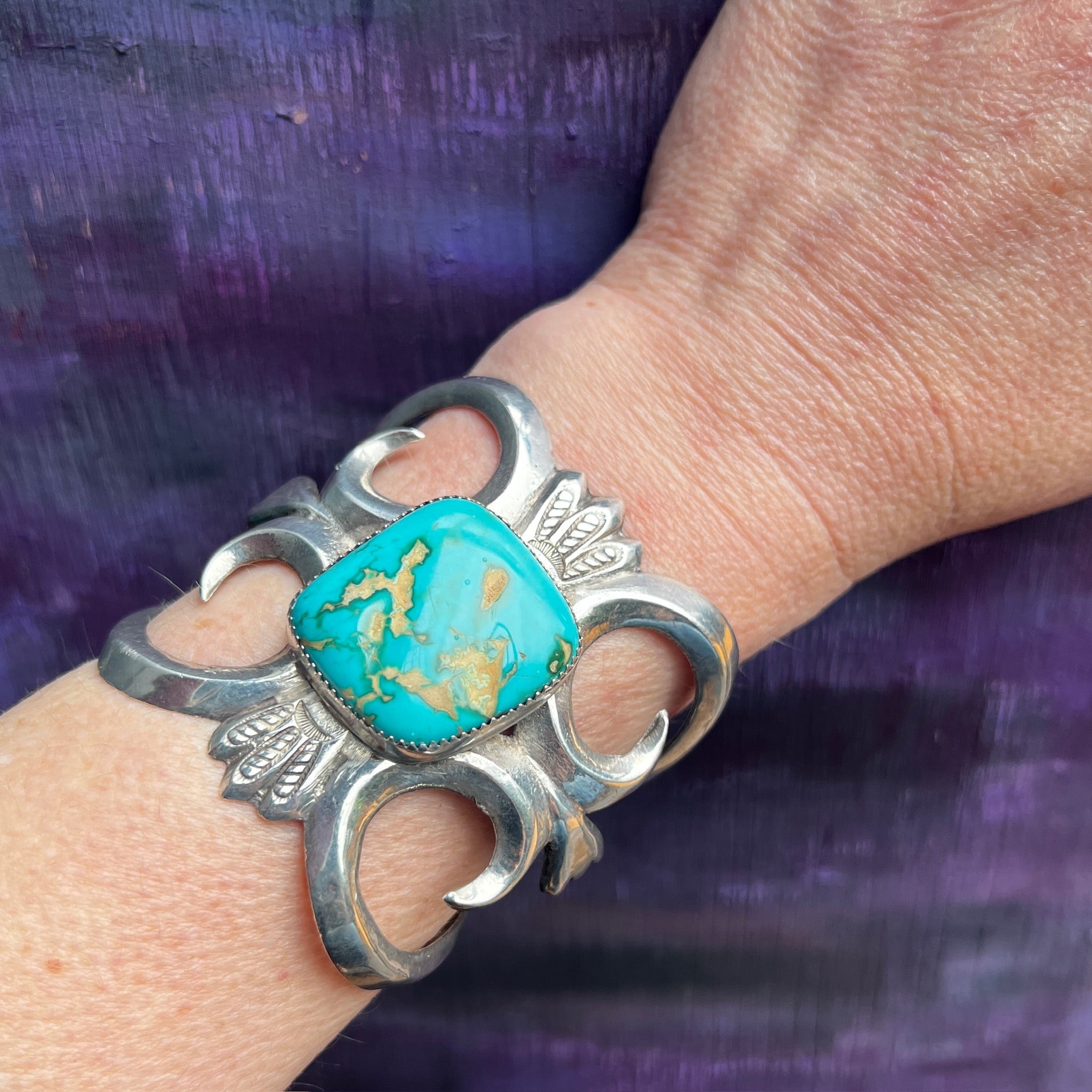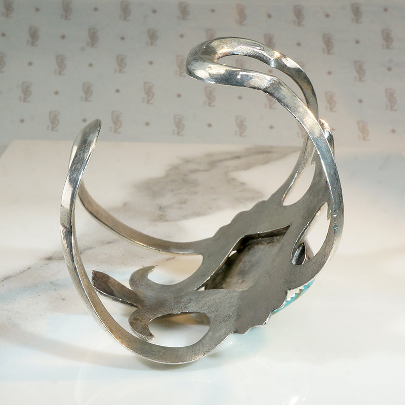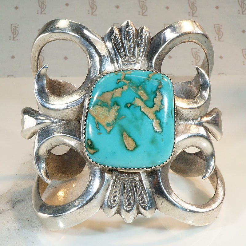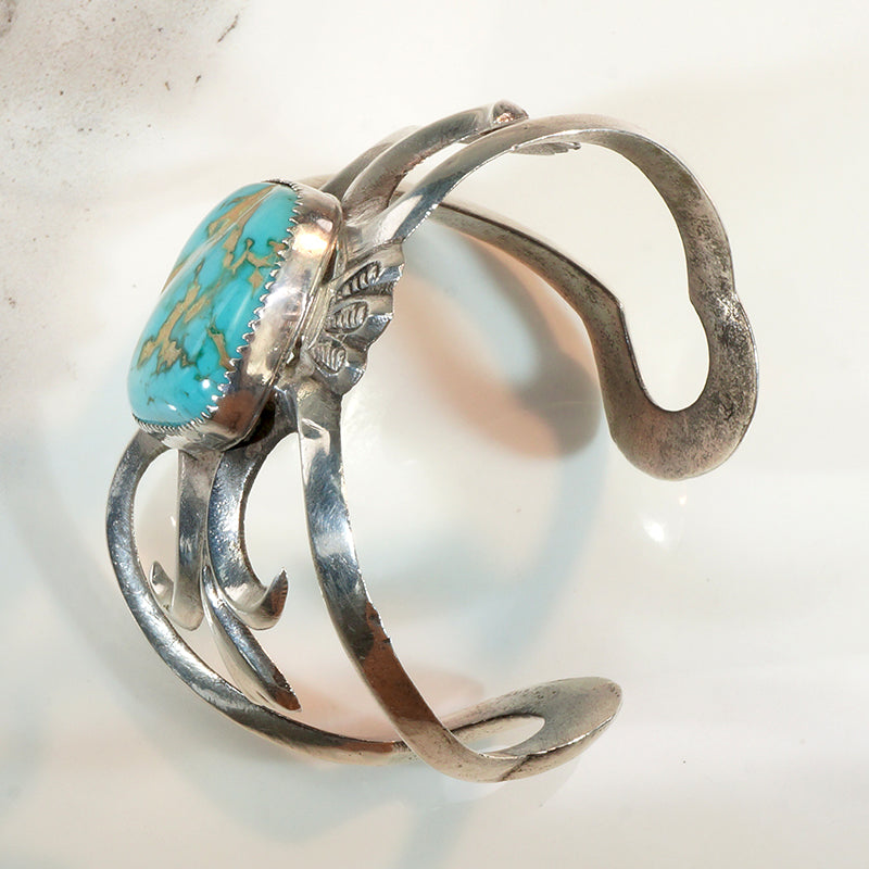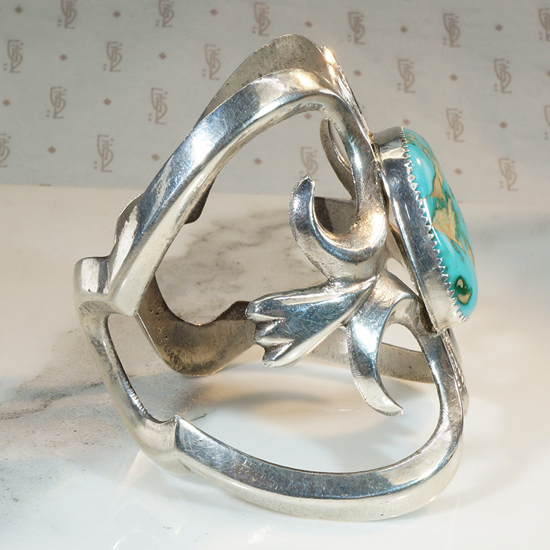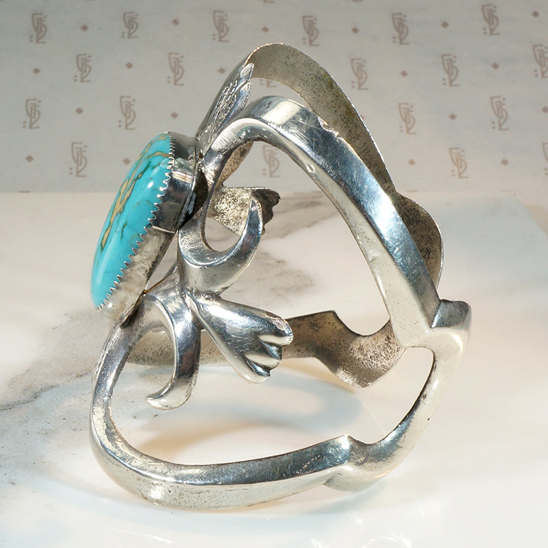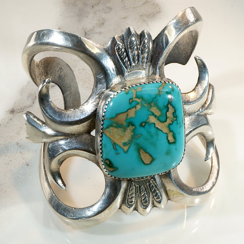 This grand Navajo cuff bracelet is composed of exuberant curves and magical color. Coin silver is sand cast into big, sweeping swoops that curl around the wrist. The turquoise nugget is a tropical ocean blue, shattered with crystalline matrix, like froth on the surf; it sits in a hand-cut sawtooth bezel over the cuff's graceful scrollwork. Tufts of sculpted silver feathers crown the stone. Romance and gravitas are beautifully balanced in this bold bracelet. Circa 1970.