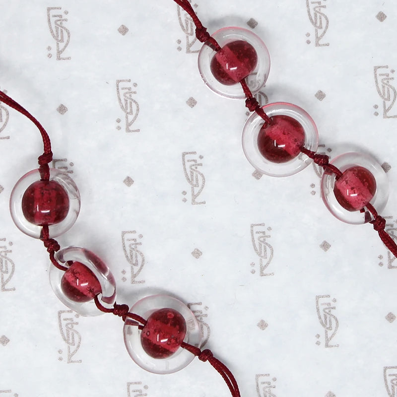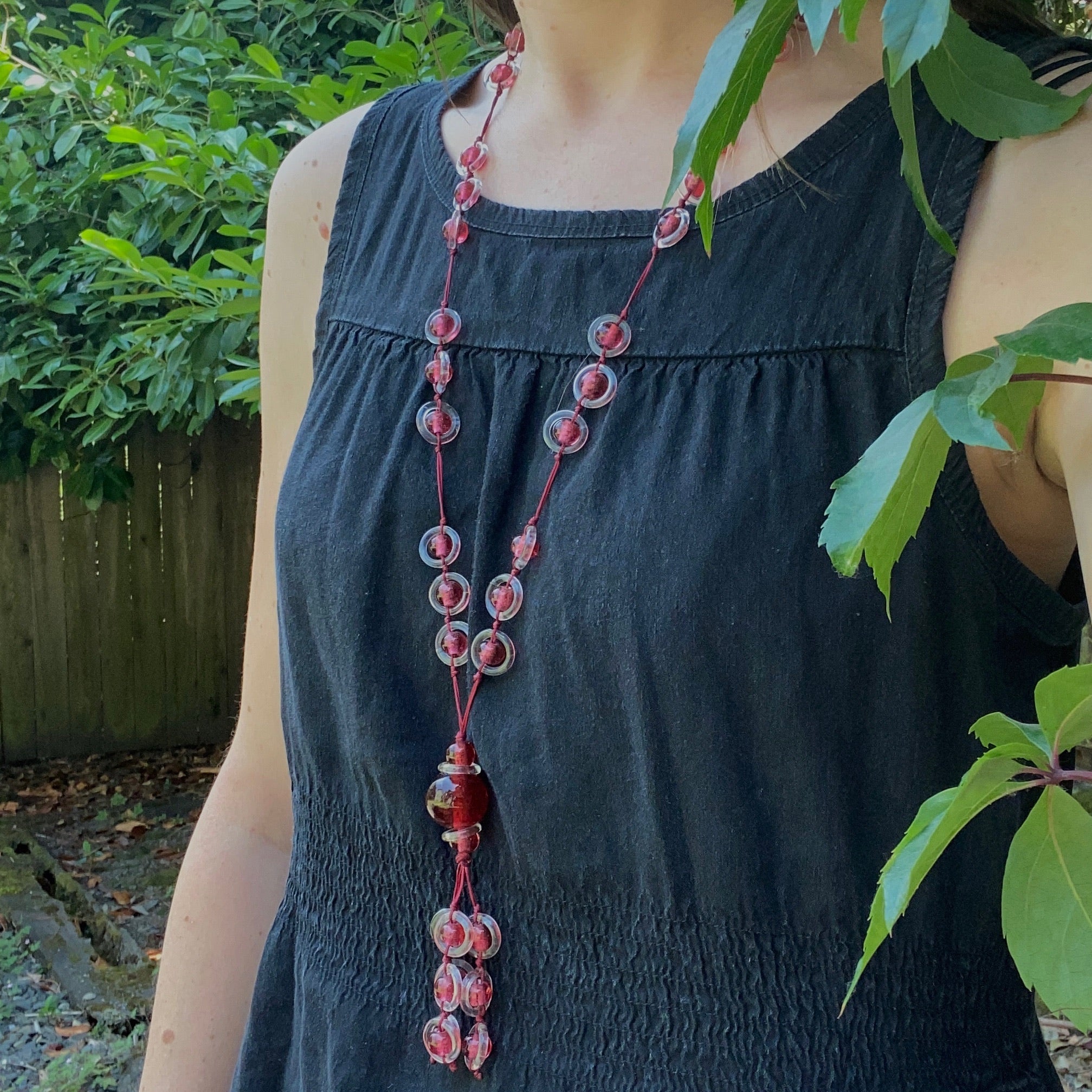 An absolutely fabulous necklace of Peking glass beads in dramatic blood red. Small round red beads are girded with clear glass "O" shaped beads, like Saturn and her rings. The beads are strung on deep red silk, and terminate in a beaded tassel. Bold and graphic with great movement, they really knew their beads in the 1920s.