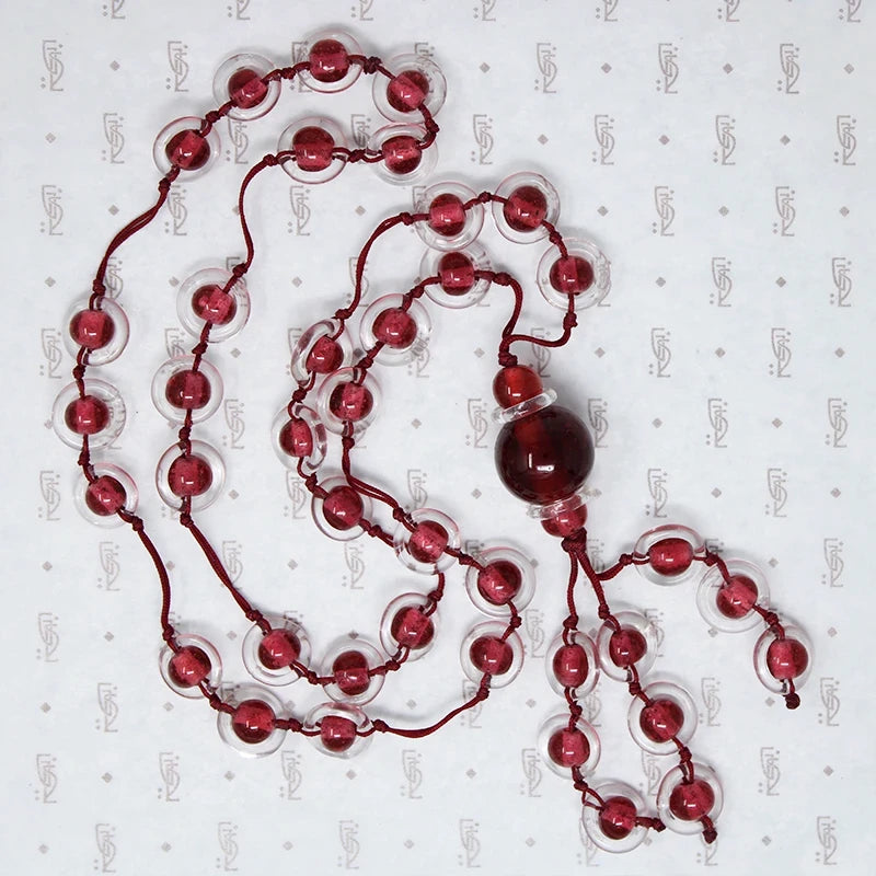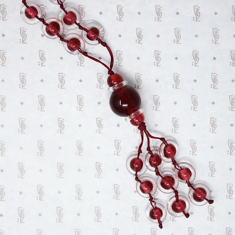 Details.....Measures 30" wearable length and the tassel is 4.25" long. The large bead measures 21mm, the red and clear beads measure 15.5mm by 9.5mm. In Very Good Antique condition. You should always expect some wear on vintage and antique jewels, we consider it part of the charm.