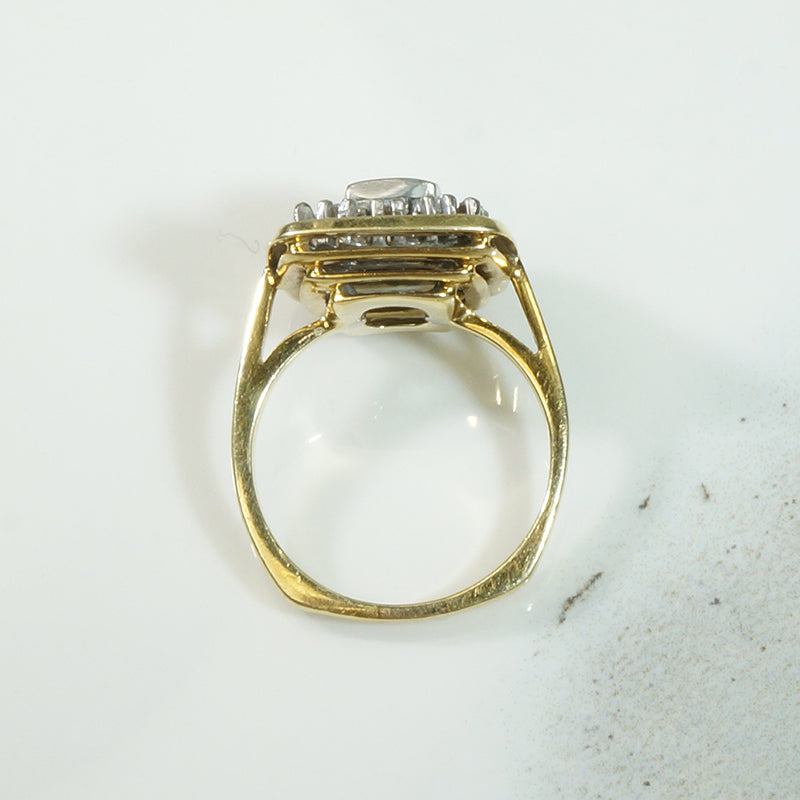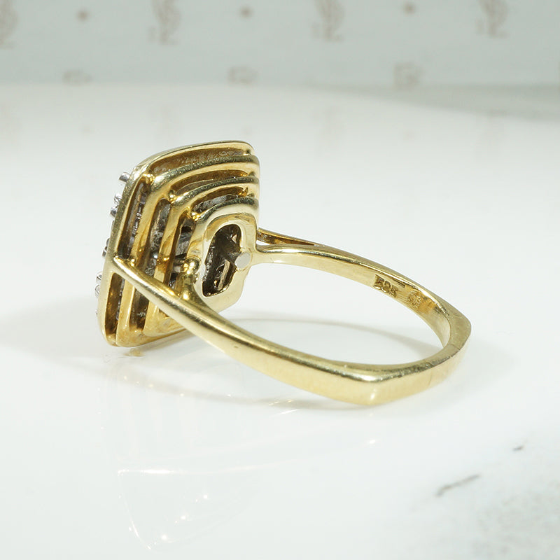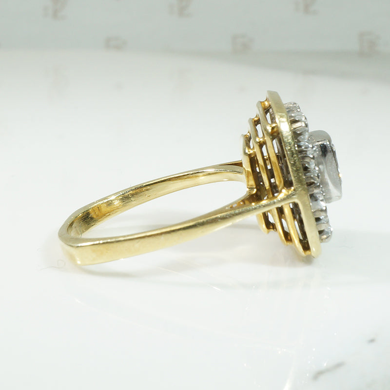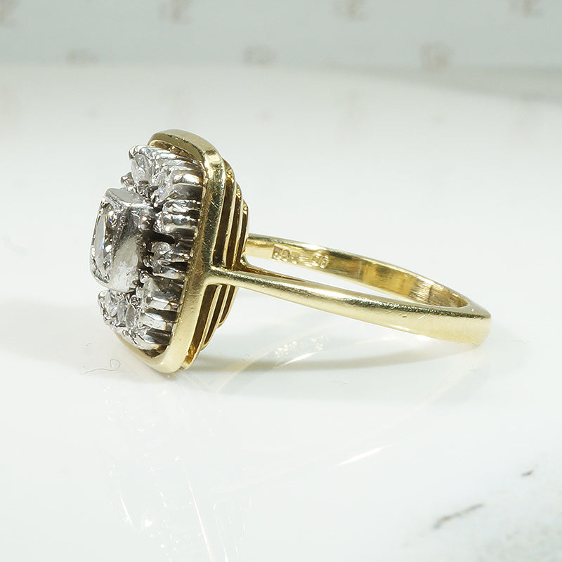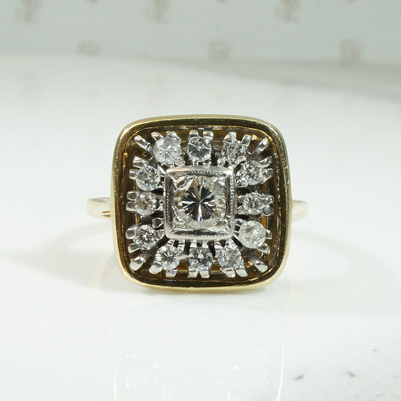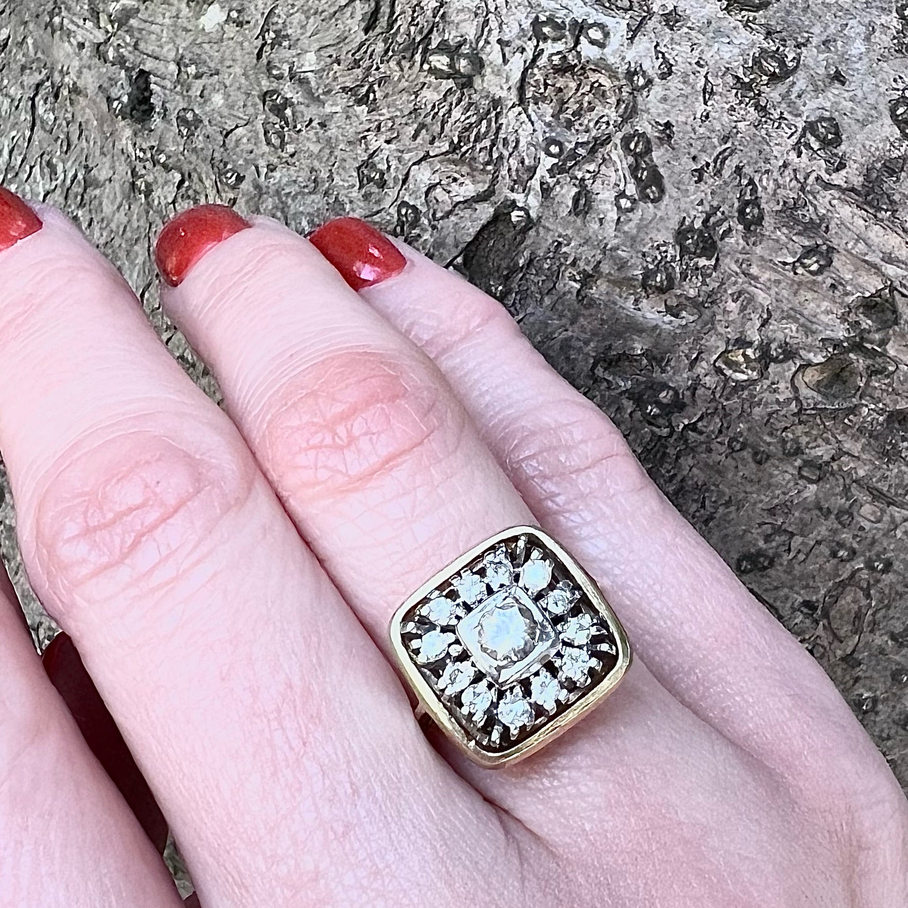 Details.....Currently a size 6. This ring may be sized up or down two sizes free of charge. Please contact us if you need this ring sized more than two sizes, it may be possible for a fee. The ring measures 13.9mm x 14.4mm at the diamond set top, and 1.9mm at the band. Excellent Vintage Condition. You should always expect some wear on vintage and antique jewels; we consider it part of the charm.