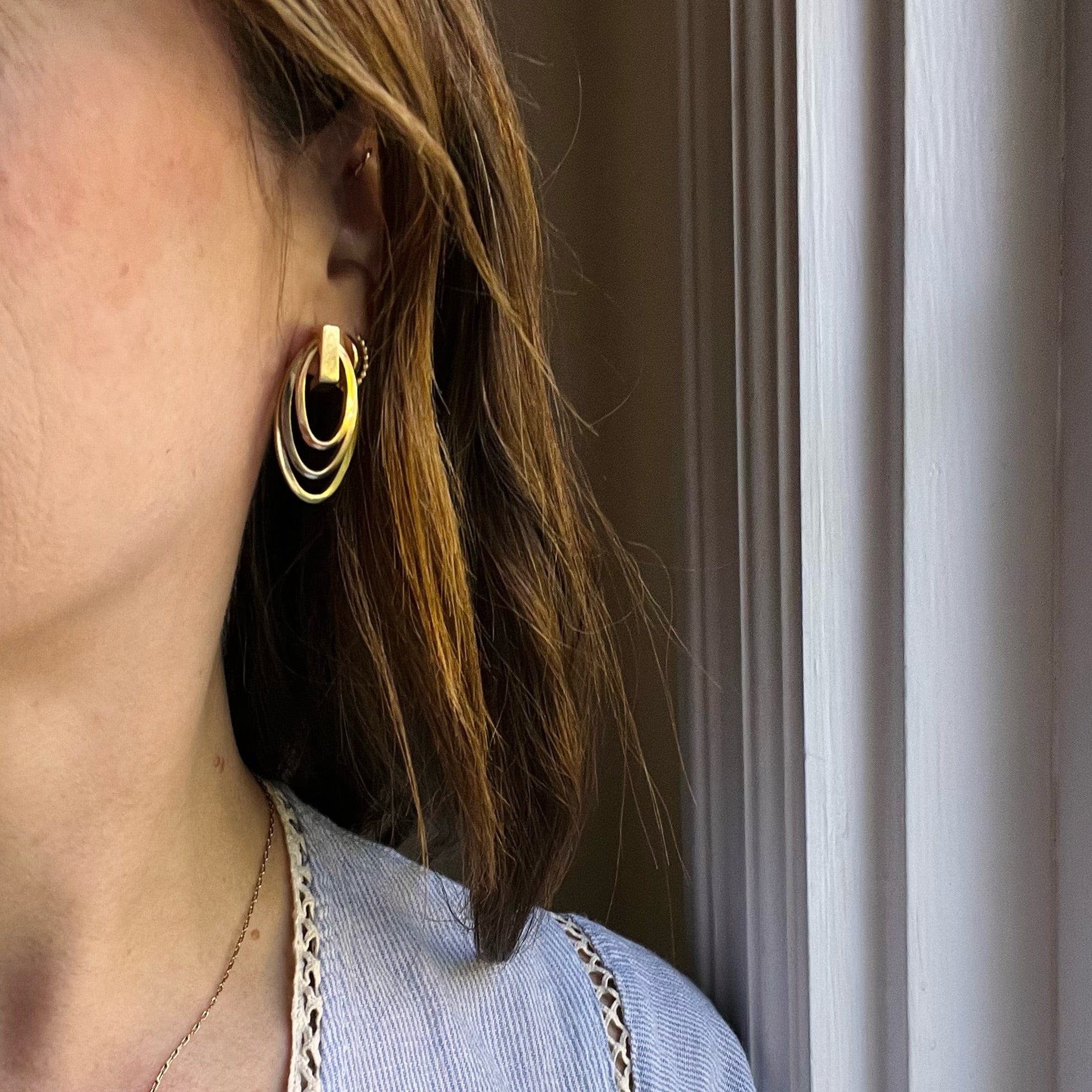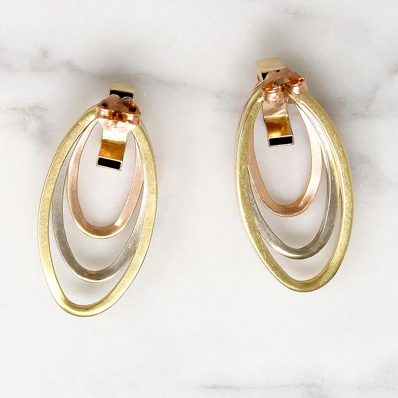 Fabulous Retro statement earrings in four colors of 14k gold. Bold in size with a graphic, three-dimensional design, three graduated oval hoops in green, white and rose gold depend from a yellow gold hook. The stationary hoops are lightweight, making these post earrings comfortable to wear. The earring backs are rose gold, a sweet detail. Gorgeous, with the Machine Age flair that makes Retro jewels so fascinating. Circa 1940.
