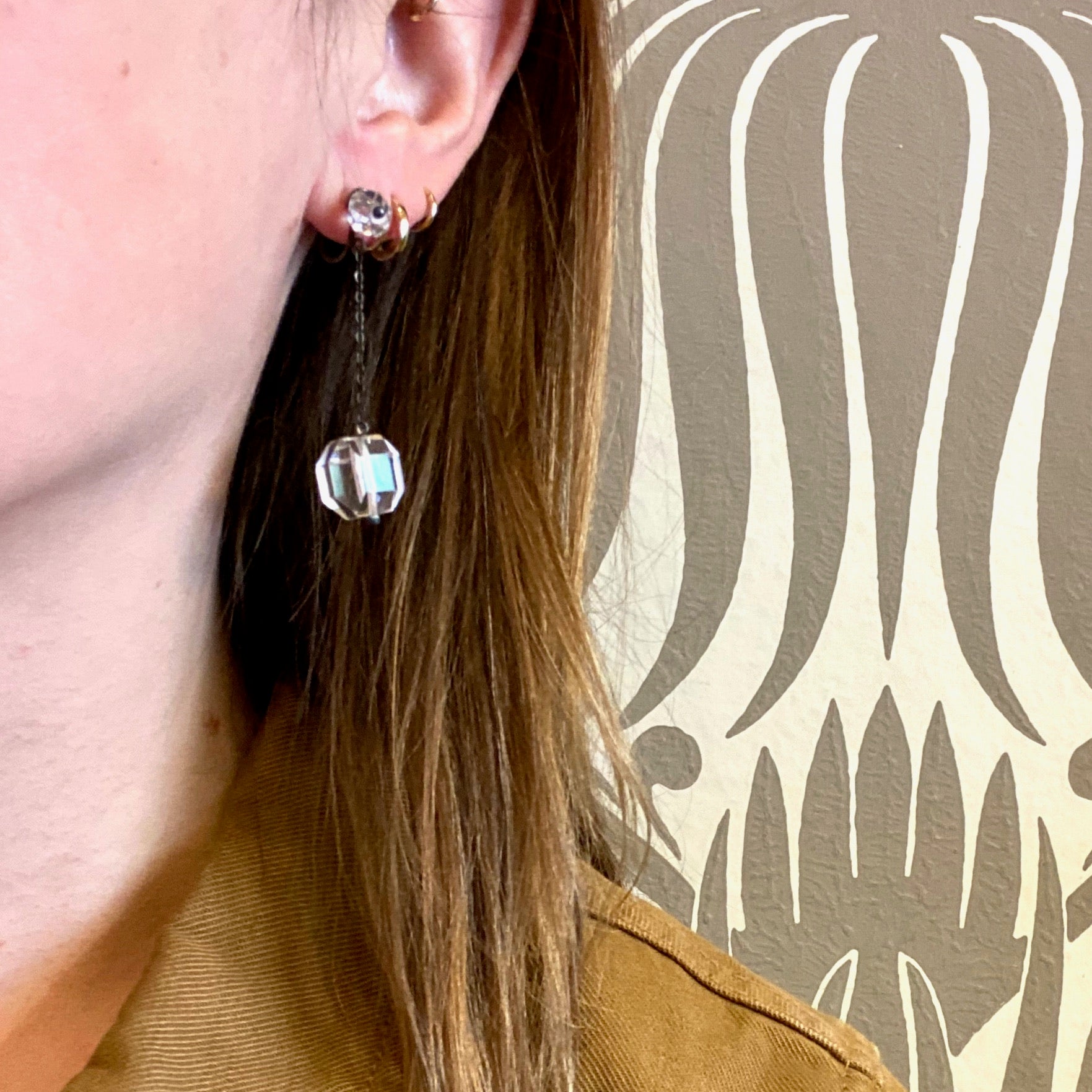 Details.....These earrings are 1.85" long and the crystal measures 11.7mm by 11.8mm. In Very Good Antique condition. You should always expect some wear on antique and vintage jewels, we consider it part of their charm.