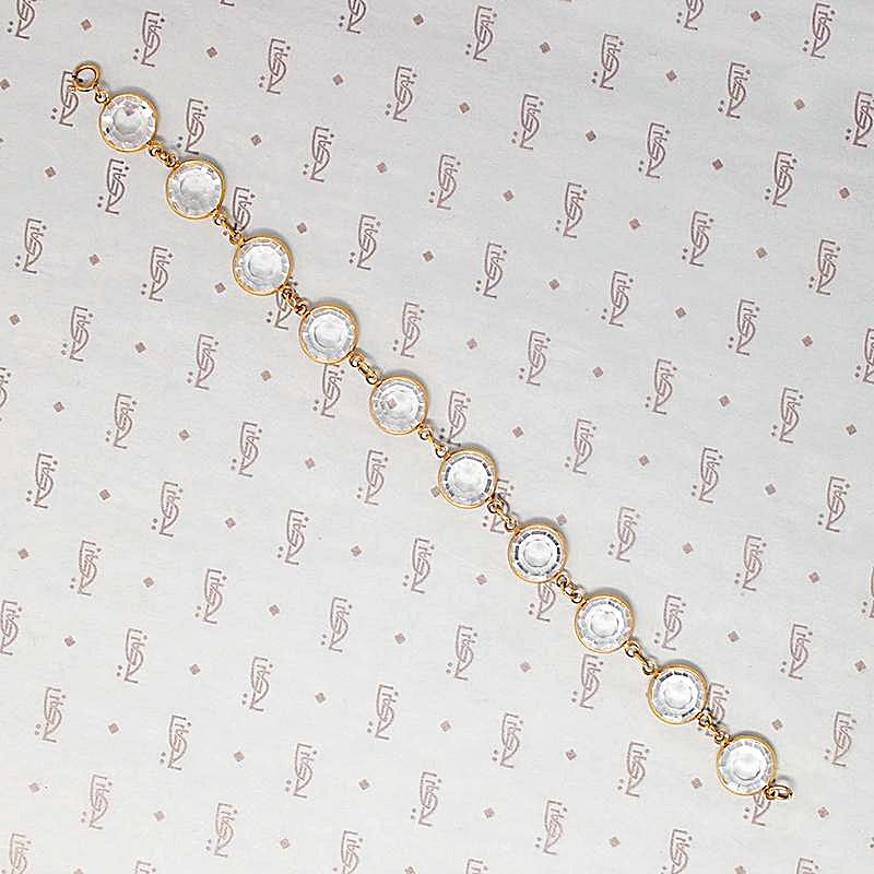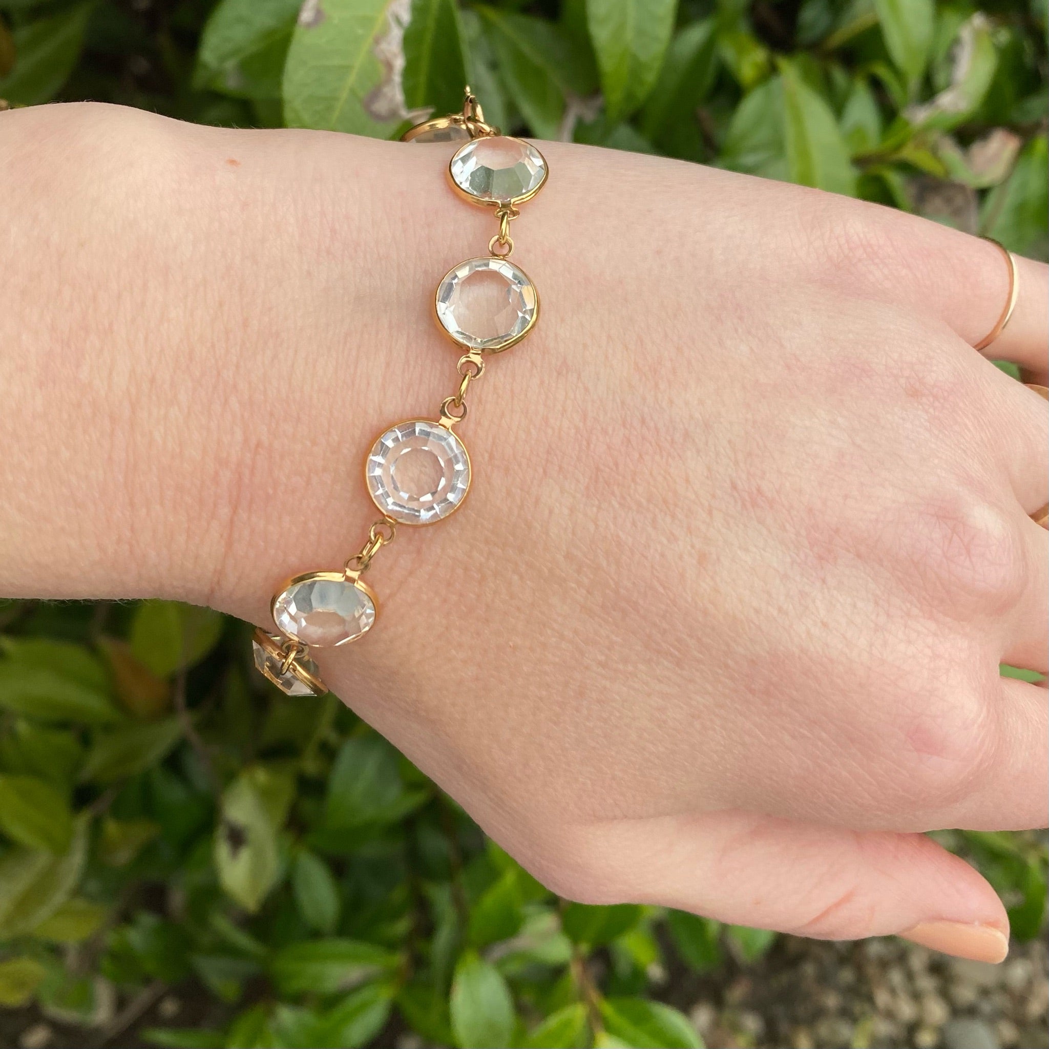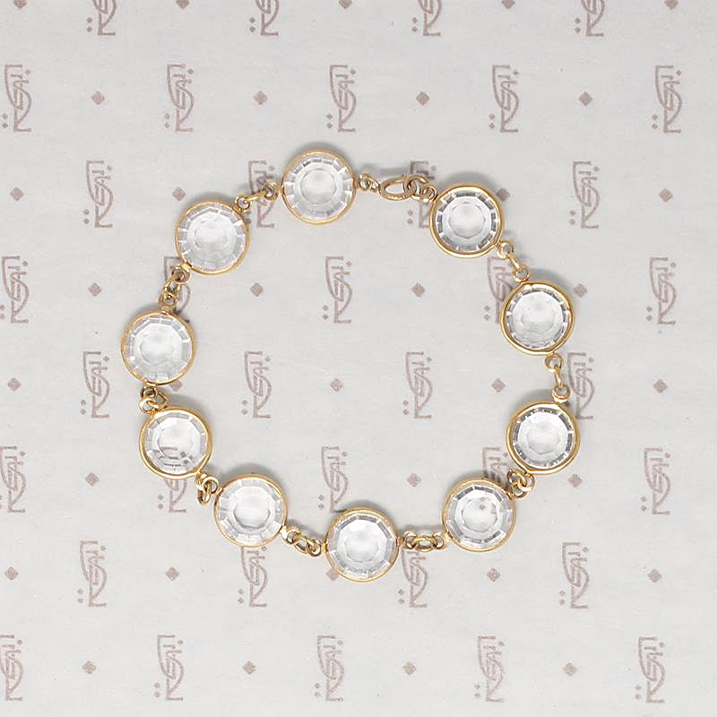 This elegant costume bracelet will bring light and sparkle to your ensemble. Faceted crystal discs in gold tone bezels form the links. Dress it up or dress it down, this piece is very versatile. It will make a pretty bridal bracelet for your vintage inspired wedding, too. Circa 1960.