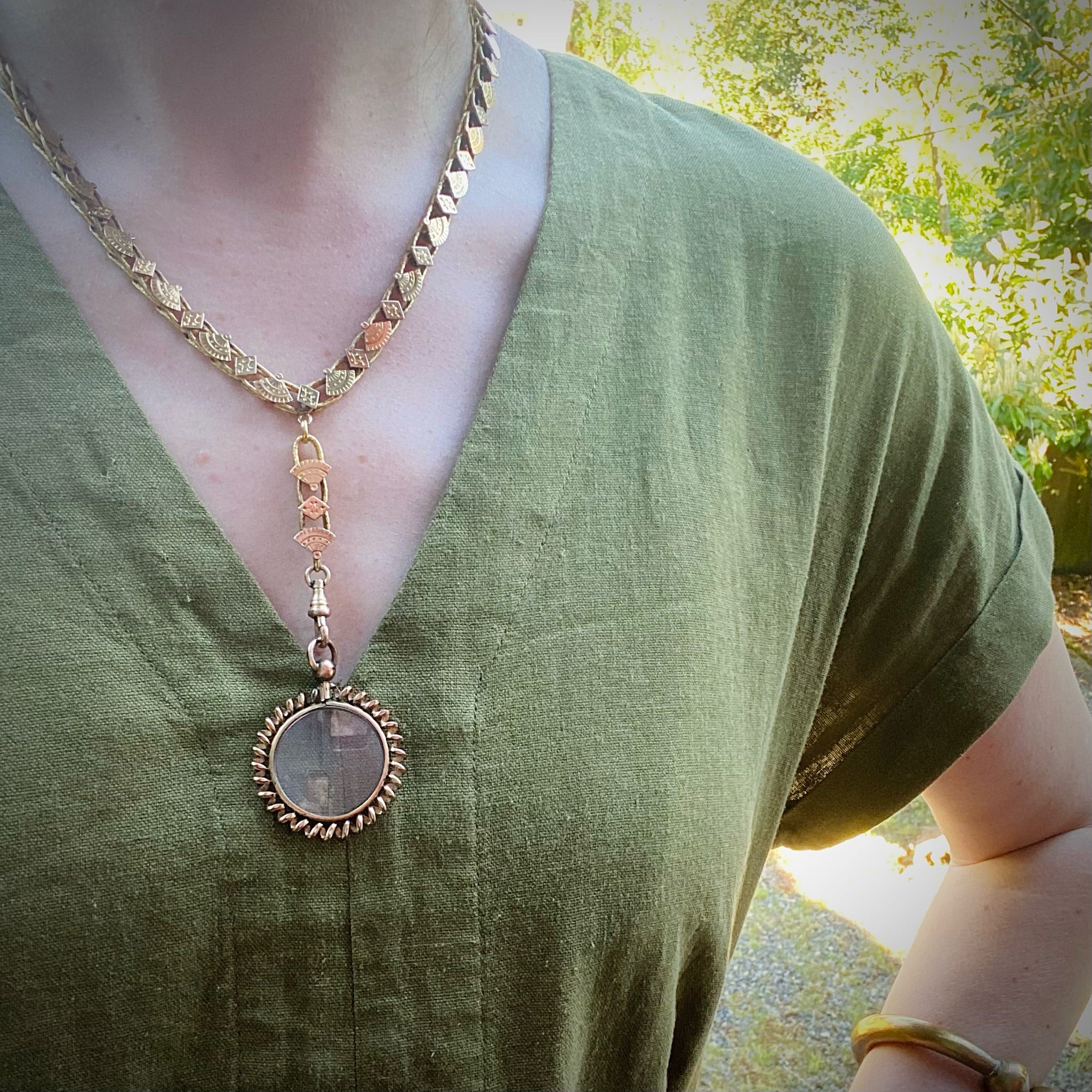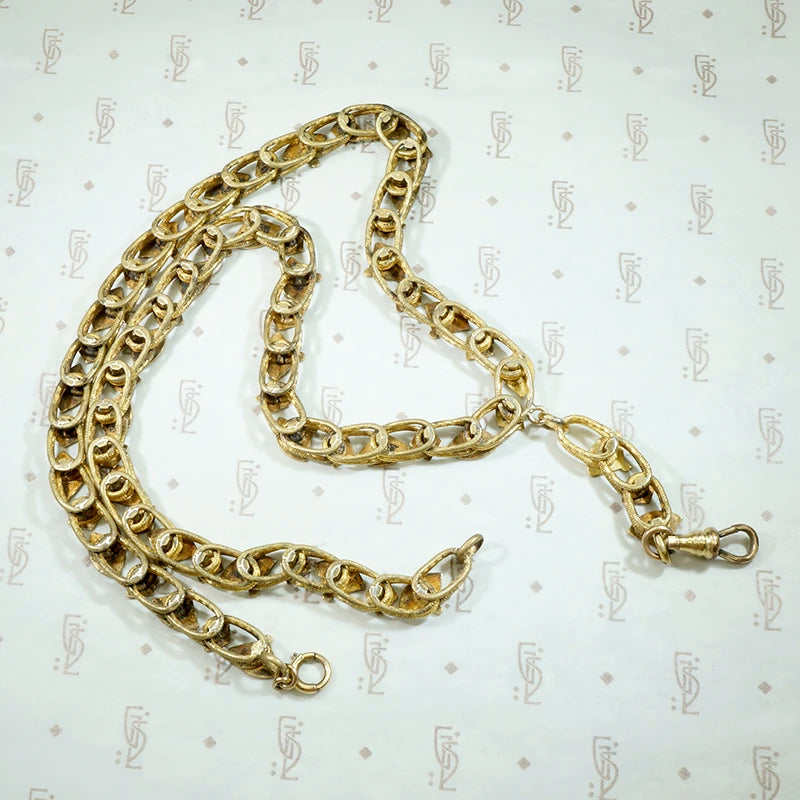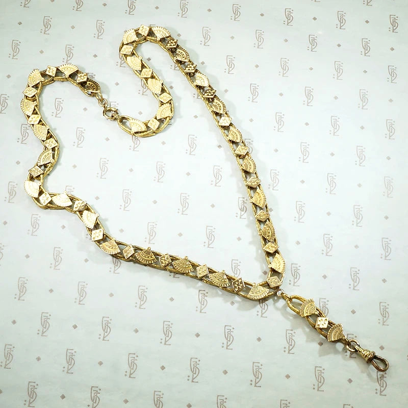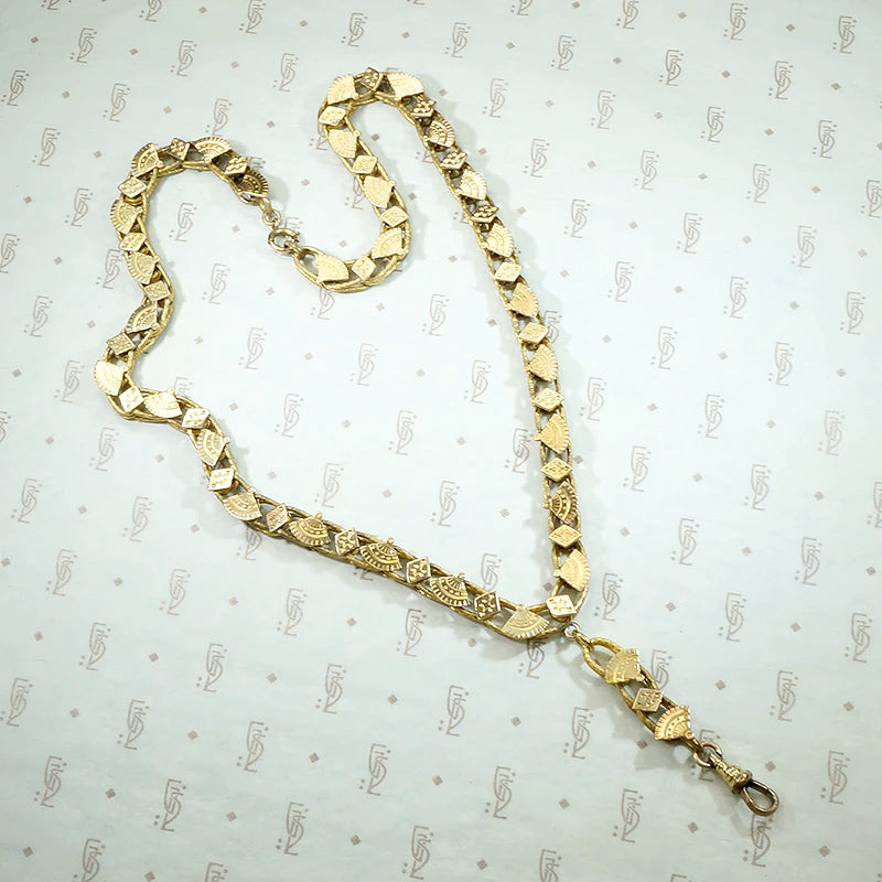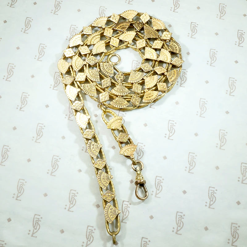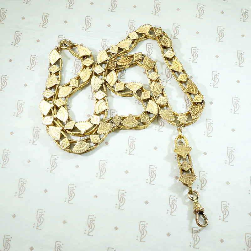 A dramatic Victorian book chain with bold and graphic links. Gold filled links are sculpted and engraved to resemble alternating fans and diamonds . A short drop ends in a versatile watch hook, ideal for displaying all of your favorite pendants, lockets or fobs. The chain clasps at the back with a classic spring ring. So many fun options with this unusual necklace. Circa 1870.