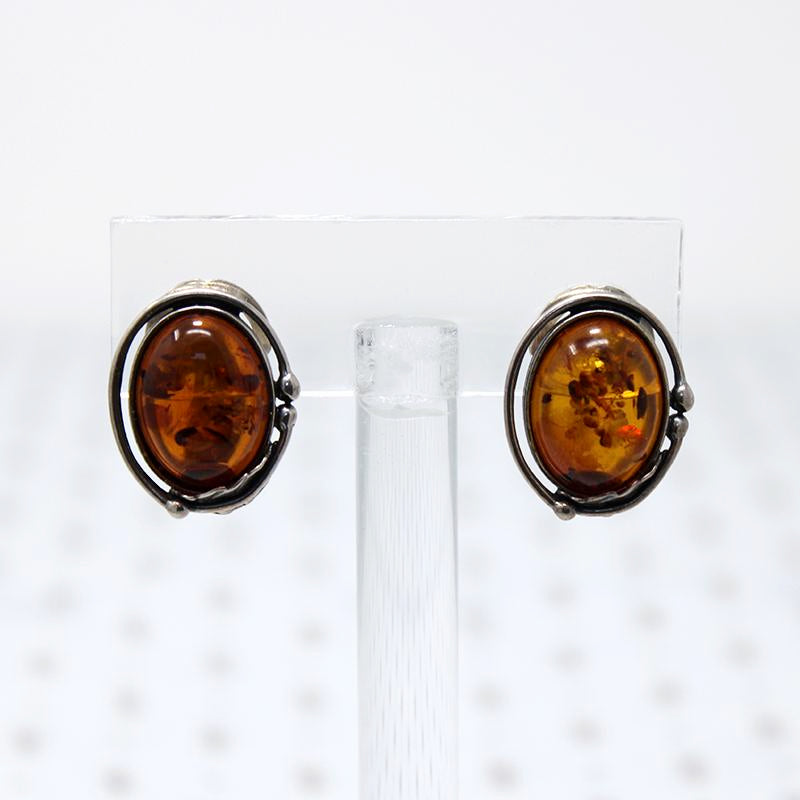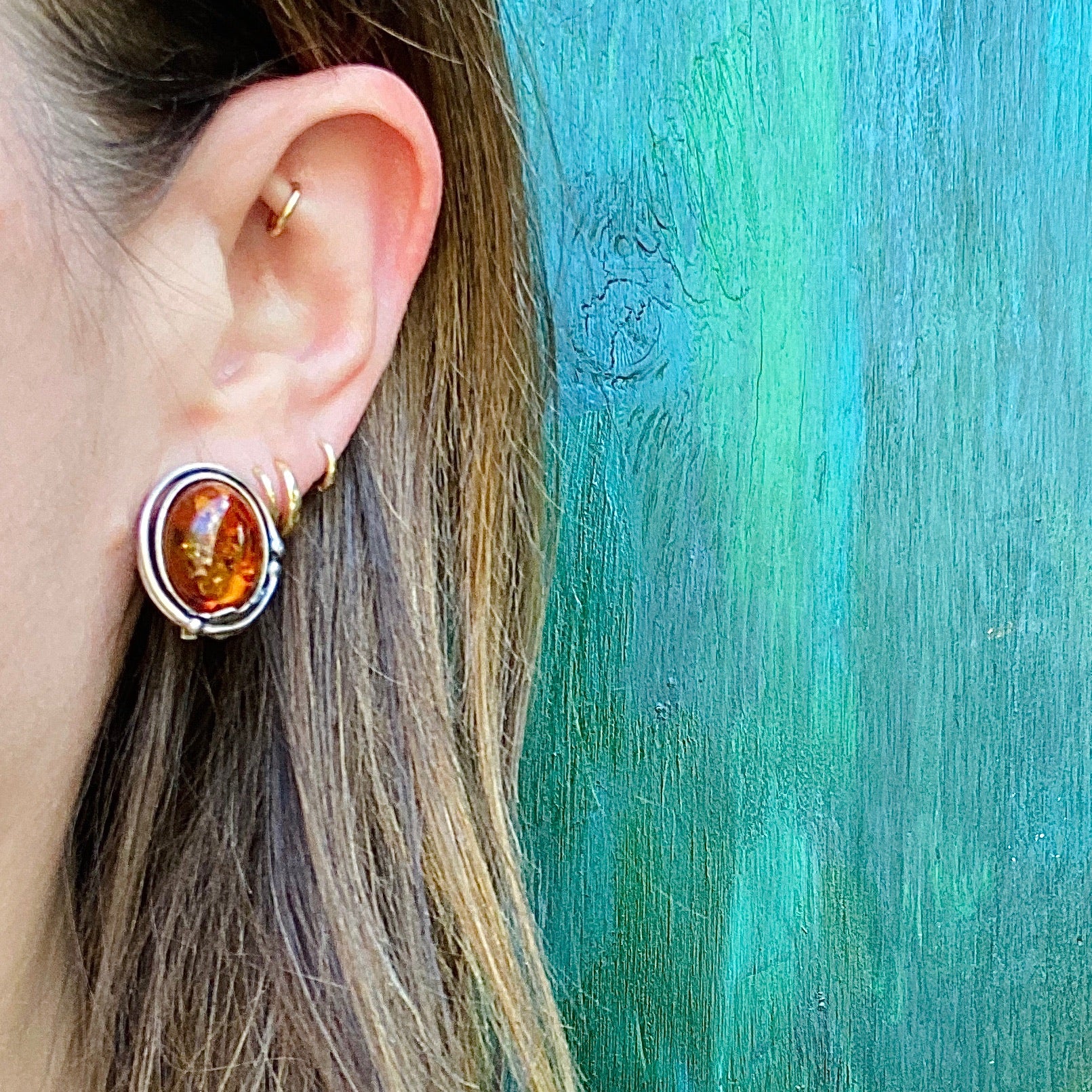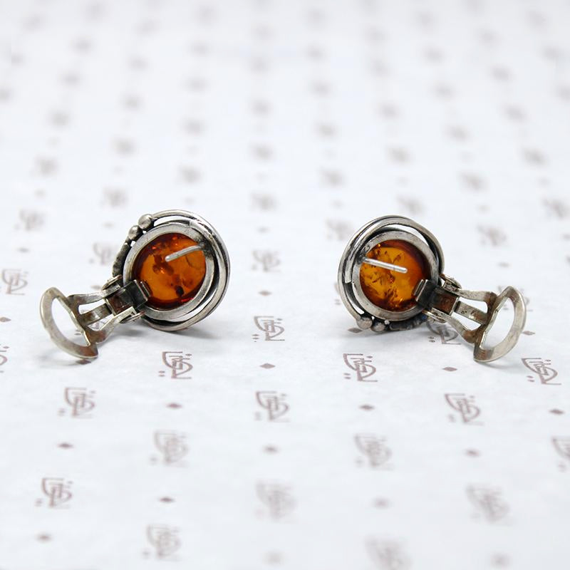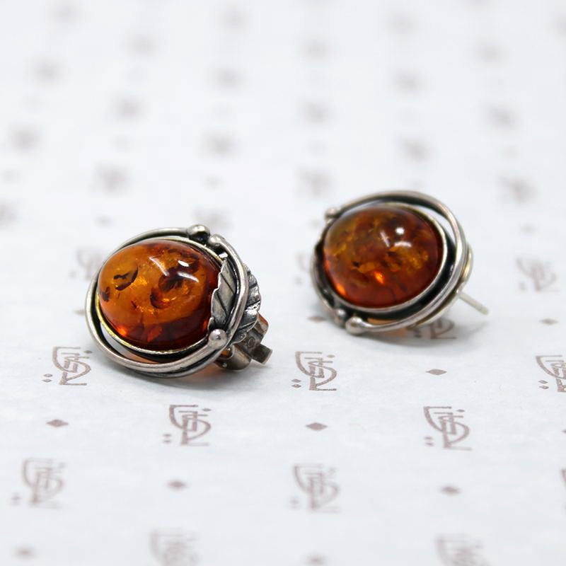 Beautiful vintage earrings made of gorgeous amber cabochons set in sterling silver bezels and wrapped in curling silver leaves. These earrings are hypnotic, the amber is filled with fossilized pollen and bits of vegetation so you can gaze into their depths for hours. The hinged posts are secure and comfortable. Circa 1970.
