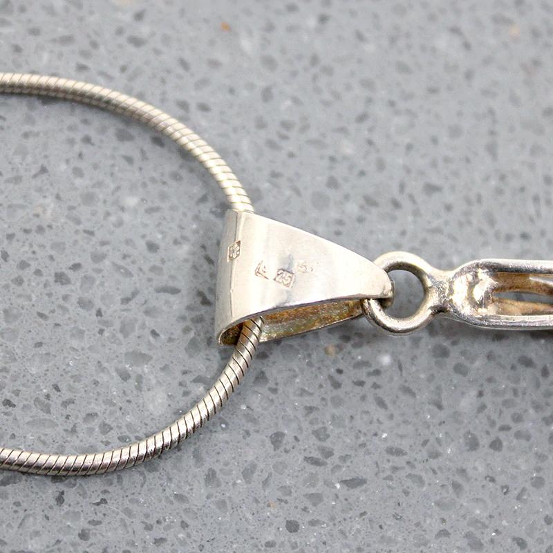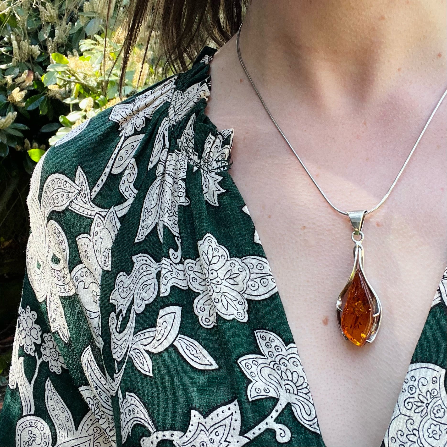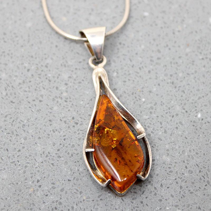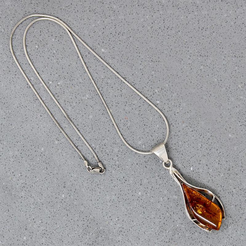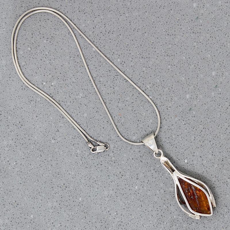 A fascinating Modernist pendant of natural amber cradled in sterling silver, like an industrial reimagining of a calla lily. The amber is richly colored with interesting inclusions, petrified pollen, and fragments of vegetation. A decorative bale suspends the pendant from a sterling silver snake chain. The bale bears a number of hallmarks. Circa 1970.