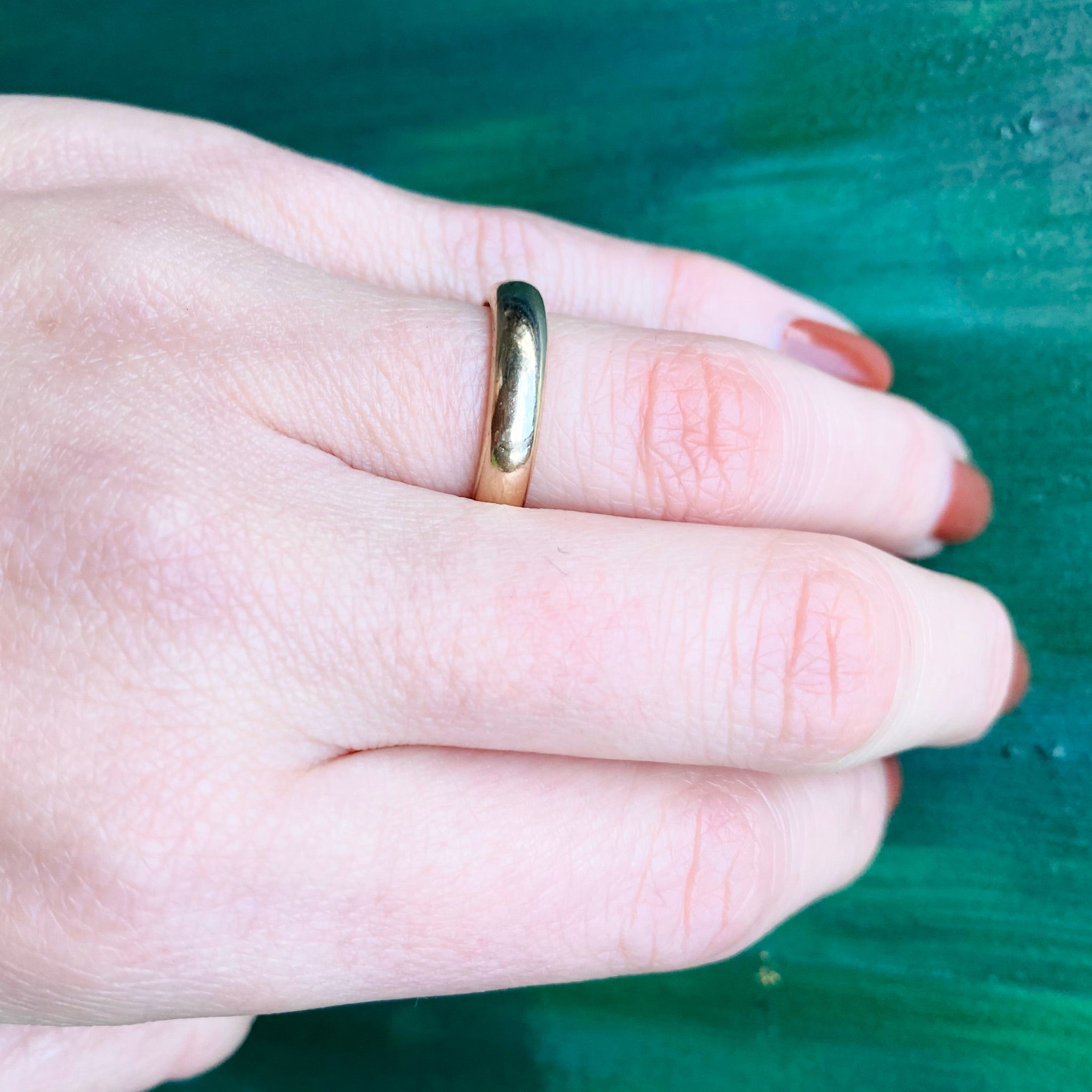 Such a delightful wedding band, a classic shape with a lovely weight. Cast in mellow, glowing 14k yellow gold. This chubby half round band has a rounded interior, also known as a comfort fit. A band with a half round exterior and a rounded interior has a lovely substantial feel on the hand, fat and luxurious. Circa 1960.