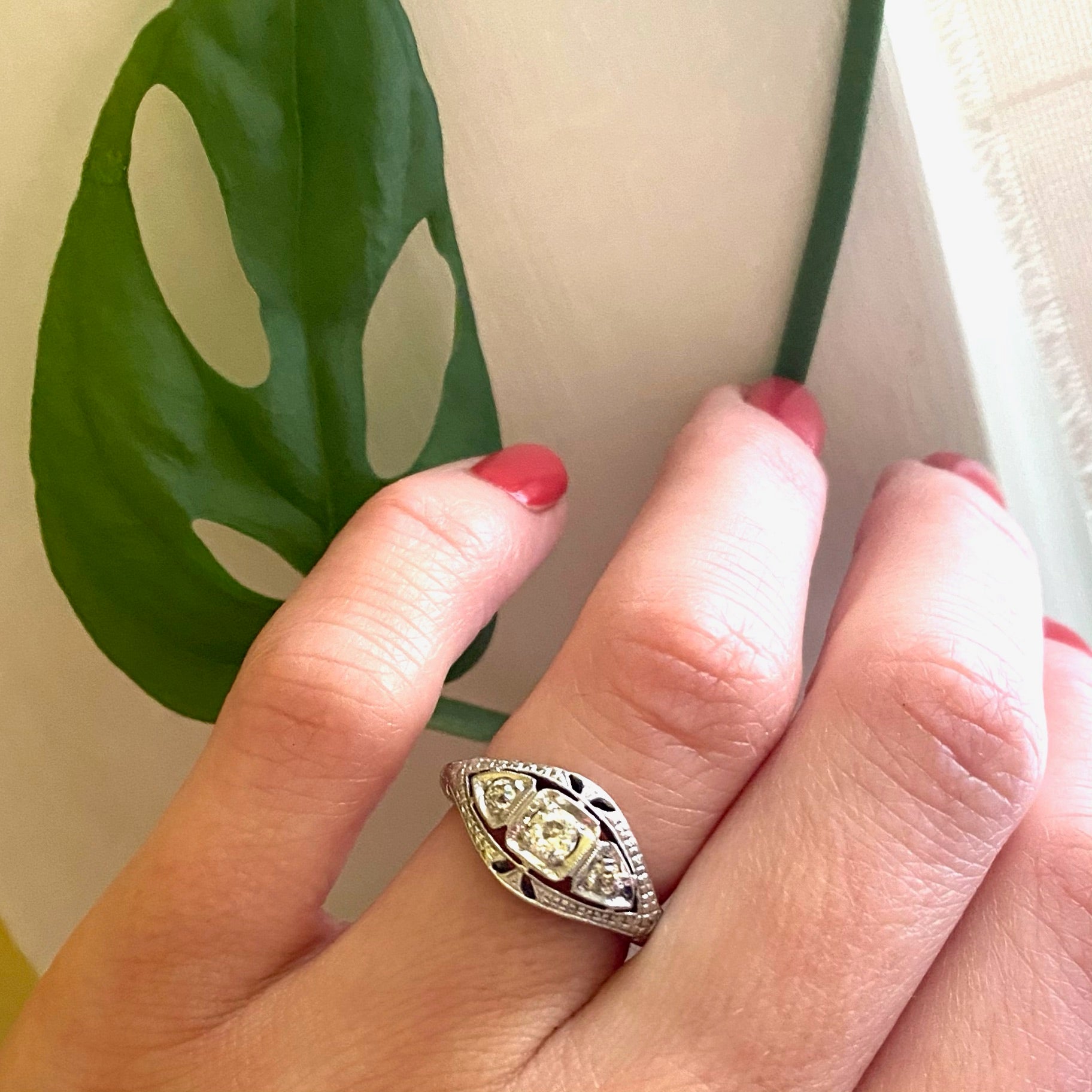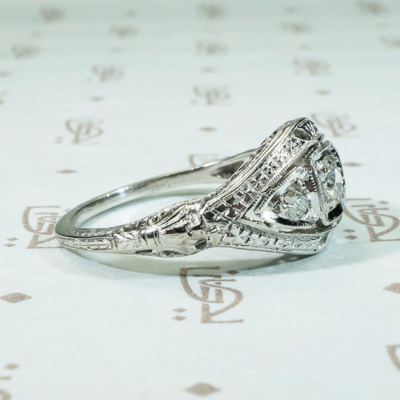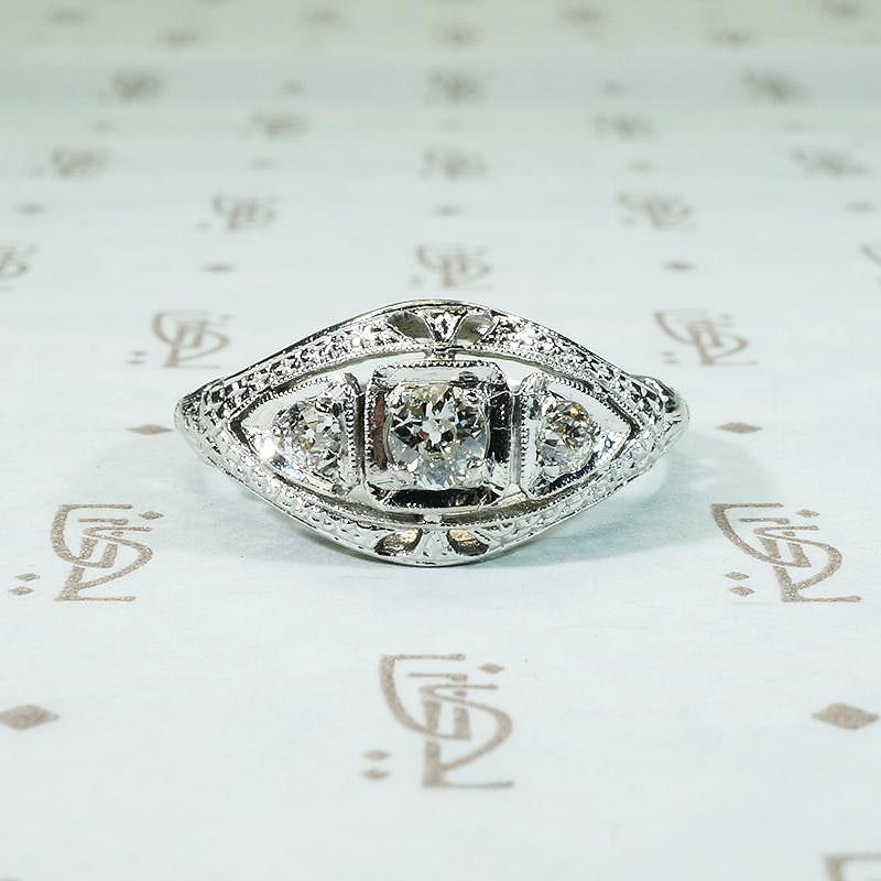 A gorgeous Art Deco diamond engagement ring with interesting transitional late 1920s, early 1930s design details. Three old mine cut diamonds are set in square and triangular boxes across an 18k white gold navette top. The chunky, sparkling diamonds have a 0.40tcw. The navette has a low profile and an east/west orientation, easy-wearing features we see in rings of the 1930s. Delicate engraving, milgrain and pierce work decorate the top of the ring, which sits above an exquisite gallery of filigree and engraving. The shoulders and band are engraved with elegant Neo-Classical elements. You will never tire of discovering the details of this wonderful ring. Circa 1930.