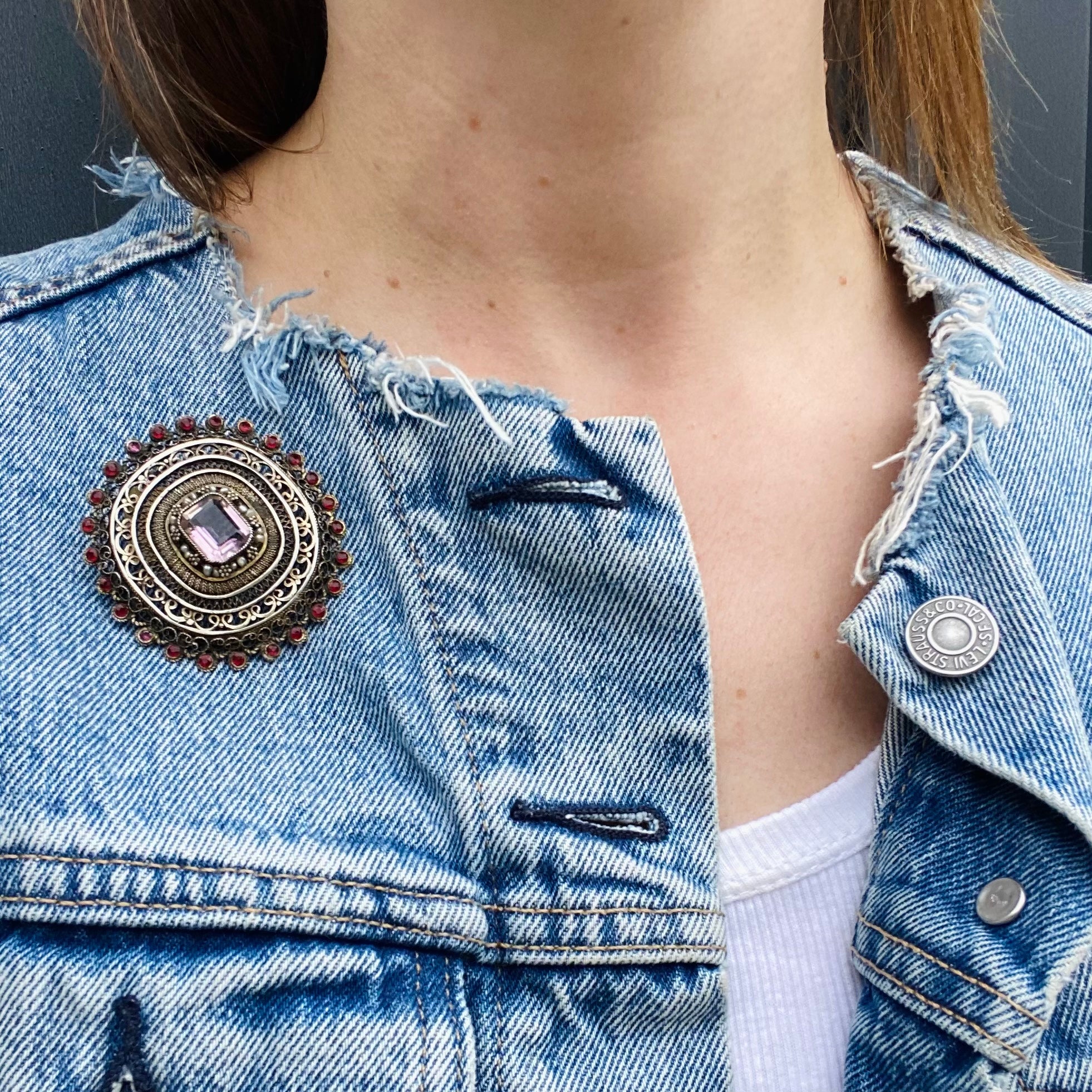 This delightful vintage brooch was influenced by the exquisite jewels of 19th Century Austro-Hungaria. Beautifully wrought silver gilt filigree forms the lacy body of the piece. A pale lavender glass gem sits at the center of the piece, set in a silver bezel and framed with tiny seed pearls and engraved forget me nots. Red garnet-colored glass gems encircle the brooch's edge. The brooch is secured with a safety clasp and has a jump ring bale so the piece may also be worn as a pendant. Bring a little drama to your favorite jacket with this ornate jewel.