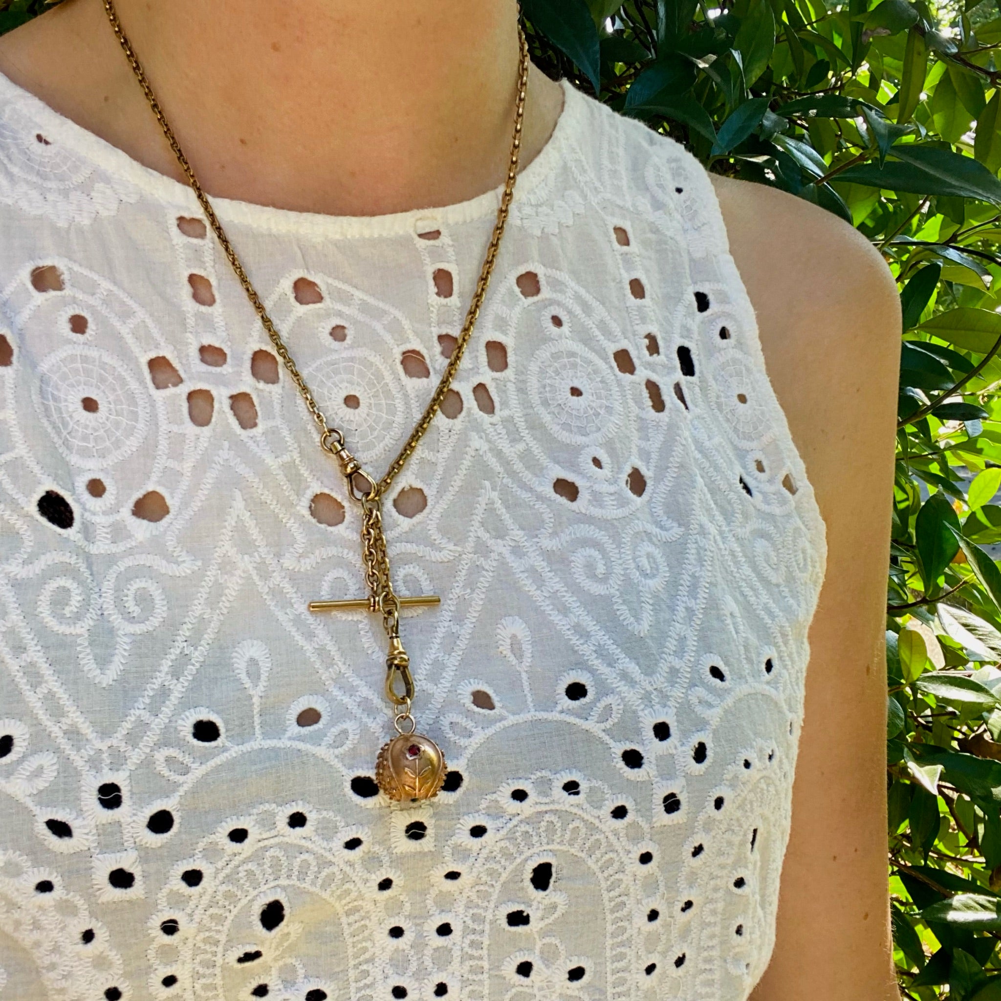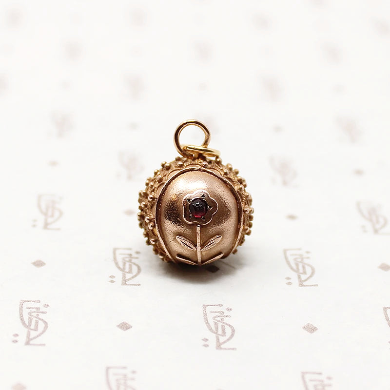 A charming Etruscan Revival ball fob with designs of applied wire and bead work. The gold filled ball depicts, on front and back, a sweet flower with a wee cabochon garnet set at its center. The sides of the ball are decorated with Archeological-inspired filigree, and a tiny quatrefoil of bright green glass sits at its bottom. A warm patina gives the fob that irresistible antique glow. This Victorian fob makes a pretty pendant, its integrated bale and jump ring make it easy to hang on anything you like. Circa 1890.
