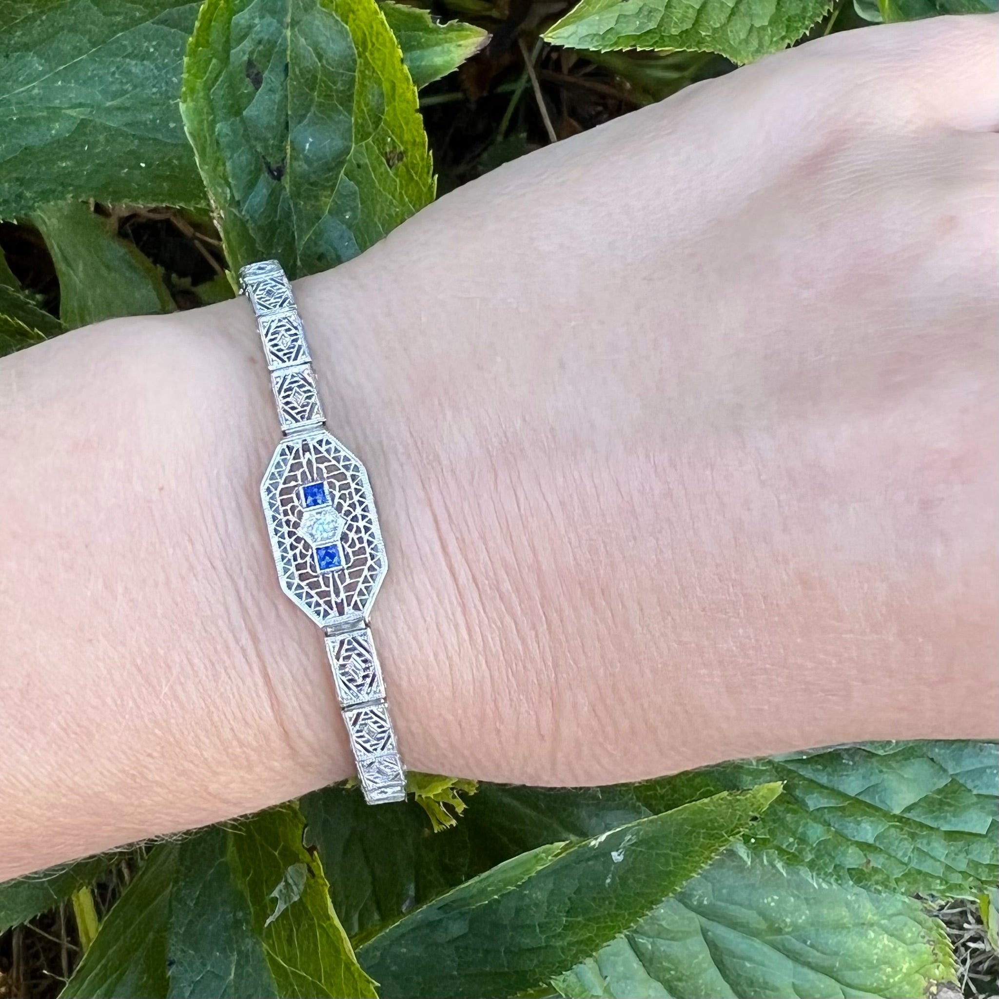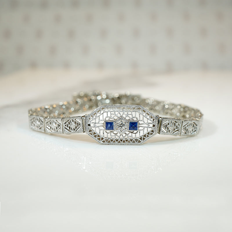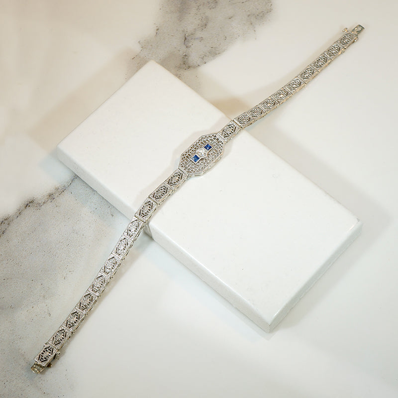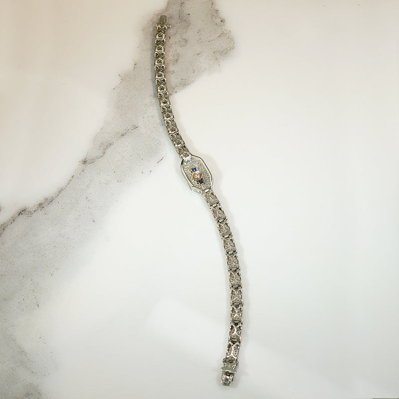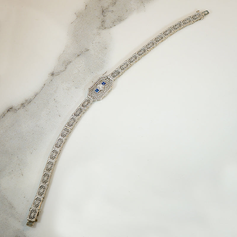 This Art Deco bracelet of delicate 14k white gold filigree centers a gem-studded decorative panel. A classic line bracelet supports an elongated hexagon set with a diamond flanked by French cut sapphires. The lacy filigree is very fine, with meticulously rendered geometric patterns. The piece secures with an integrated slide clasp and safety latch. The filigree line bracelet is an Art Deco staple, this example is elevated by its craftsmanship and refined design. Circa 1920.