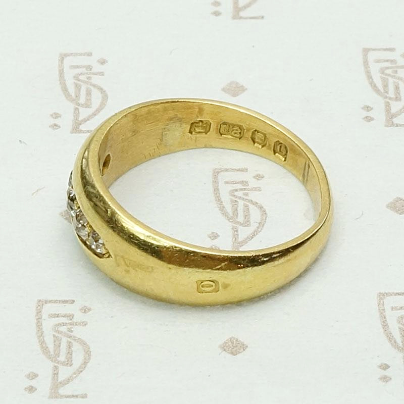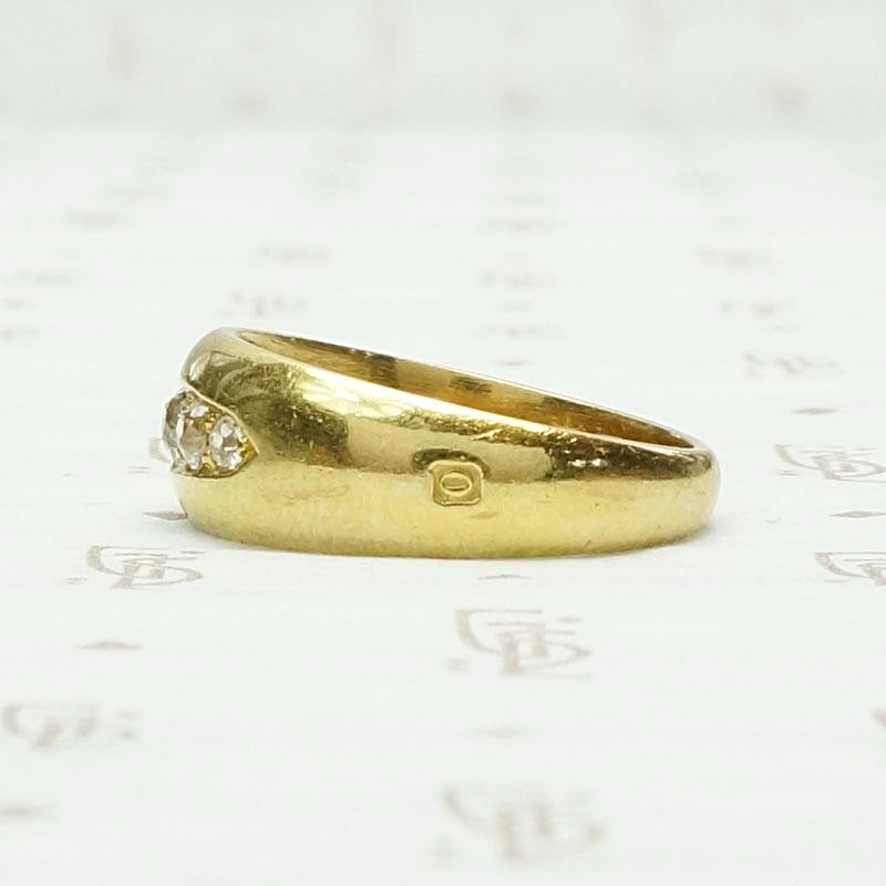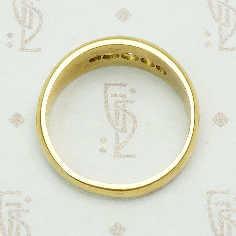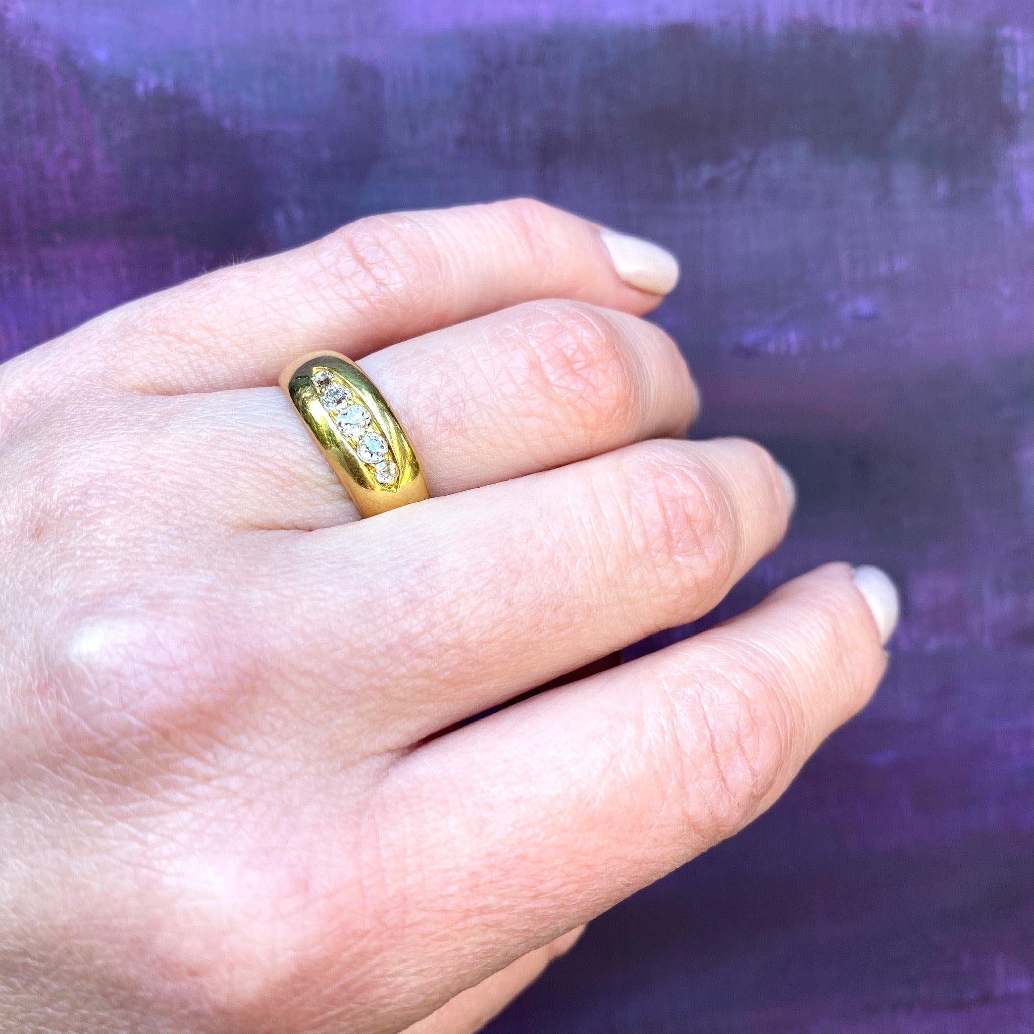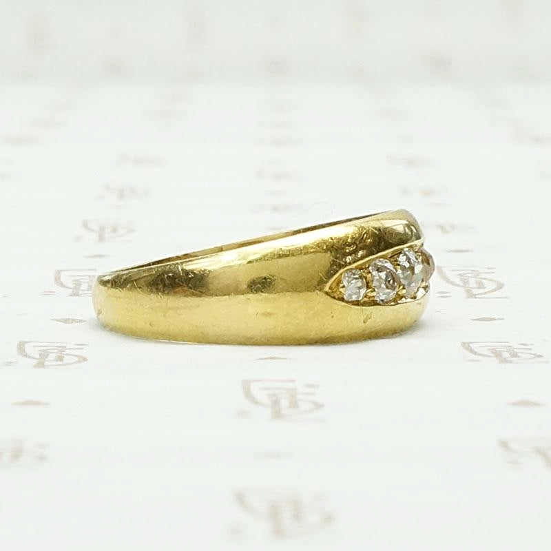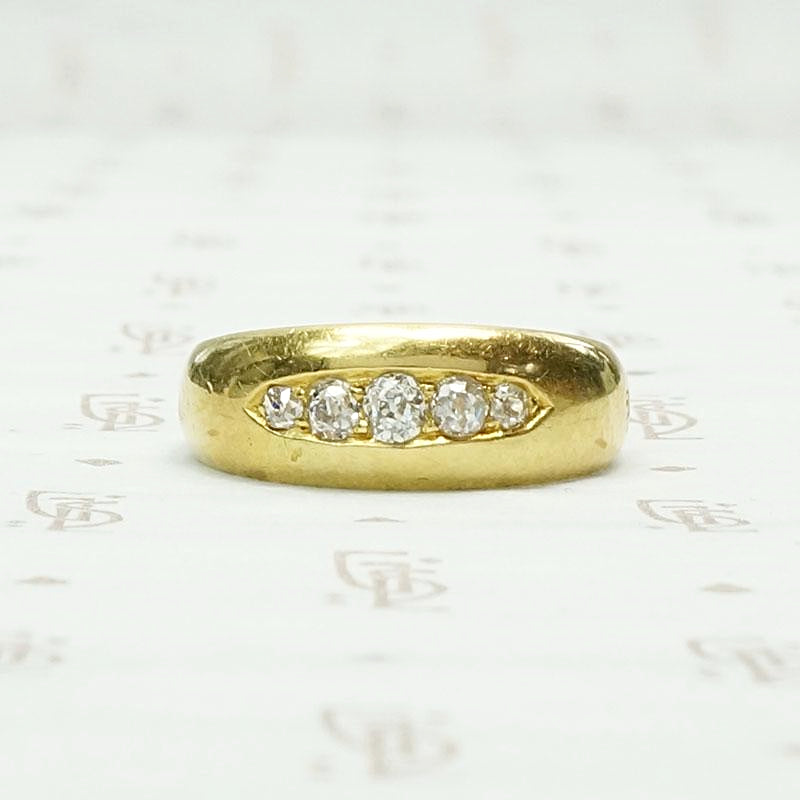 We just love a gypsy band. This one dates to the Edwardian era and was made in London. Five graduated old mine cut diamonds are set in a boat-shaped groove across the top of a 18ct gold band. The sparkle of chunky old mine diamonds is delightful and the band is heavy, smooth and feels great on your finger. The ring is hallmarked for London, 18ct and 1909-1910.