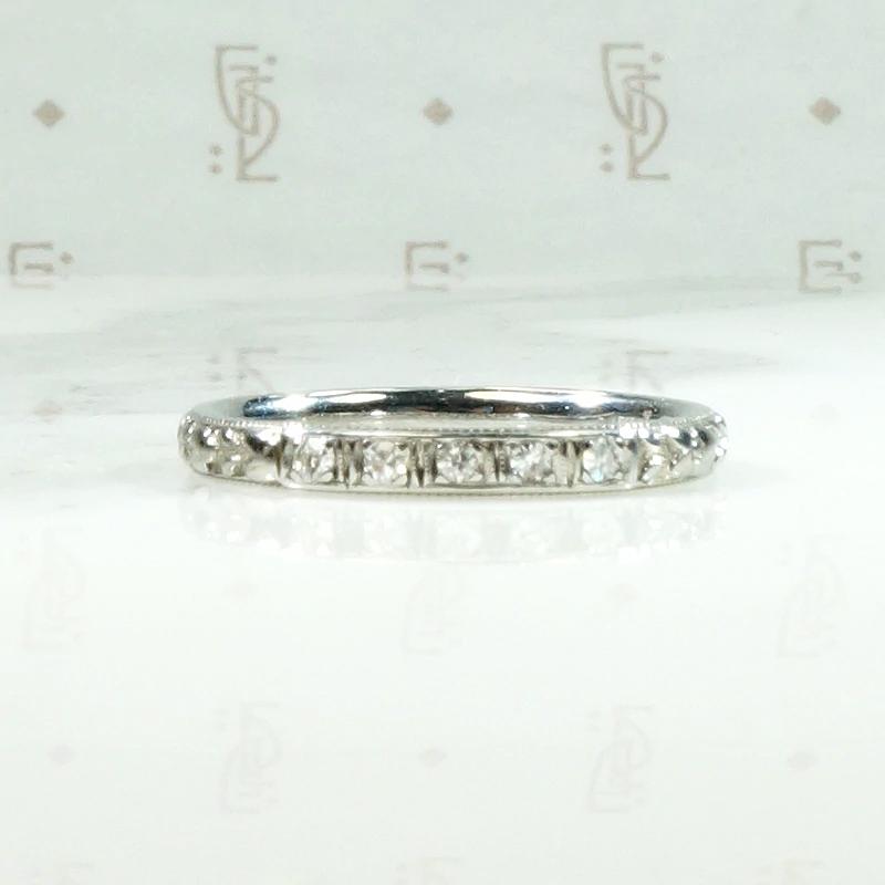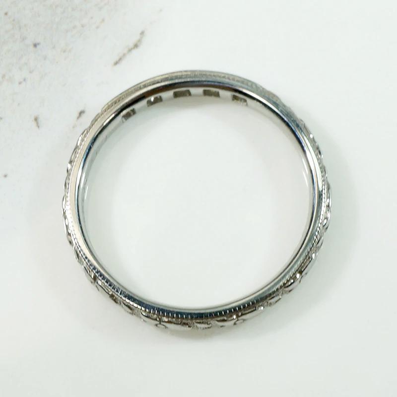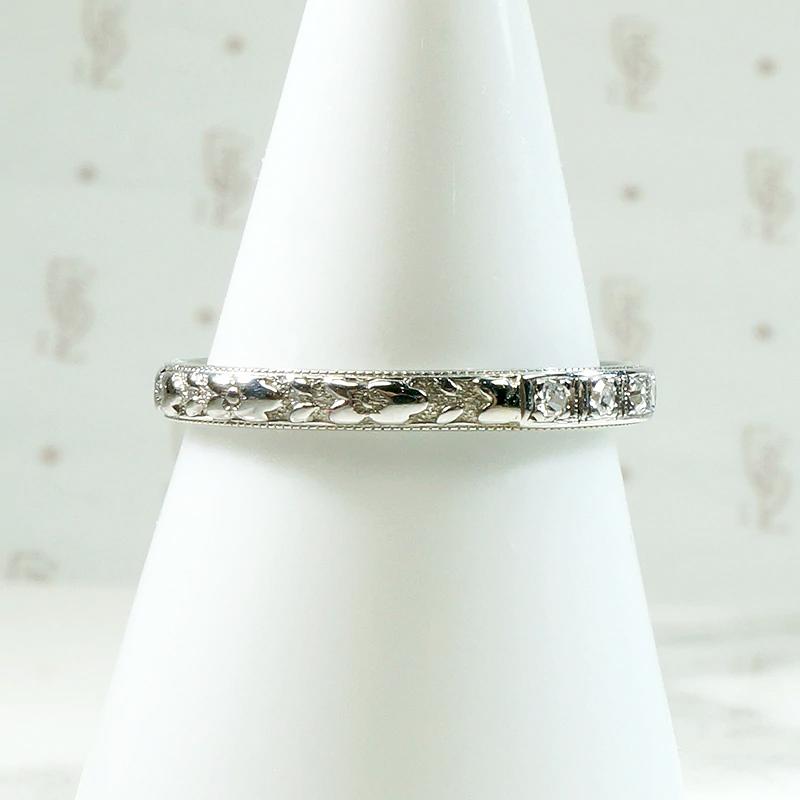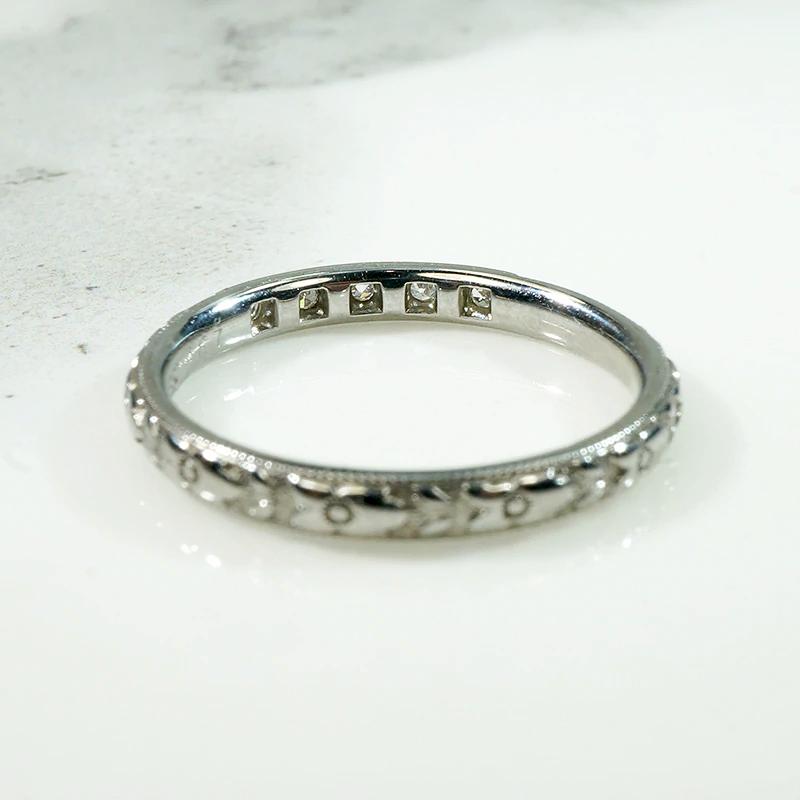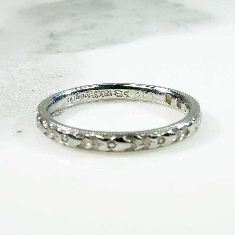 Five pretty diamonds sparkle across the top of this beautifully engraved 18k white gold band. The diamonds are each set in a tiny box and the band is engraved with sweet orange blossoms. Delicate milgrain edges the ring. This versatile beauty will elevate anything you pair it with. Signed "Lohengrin". Circa 1930.