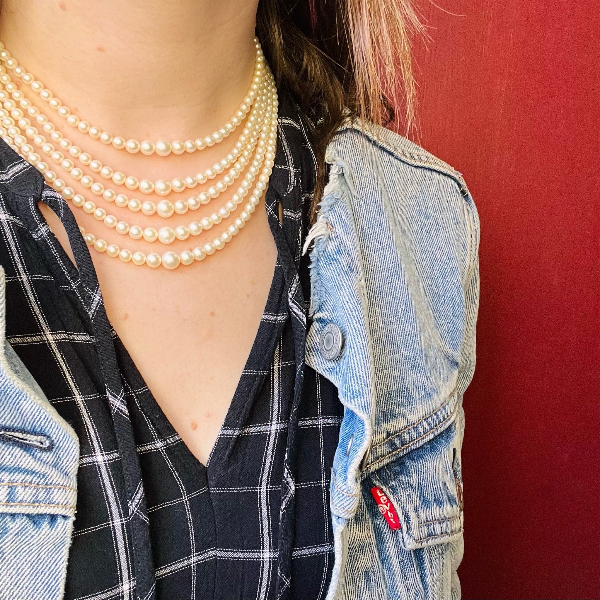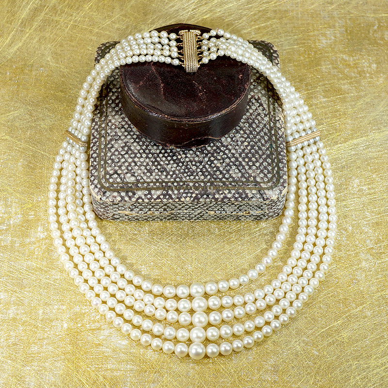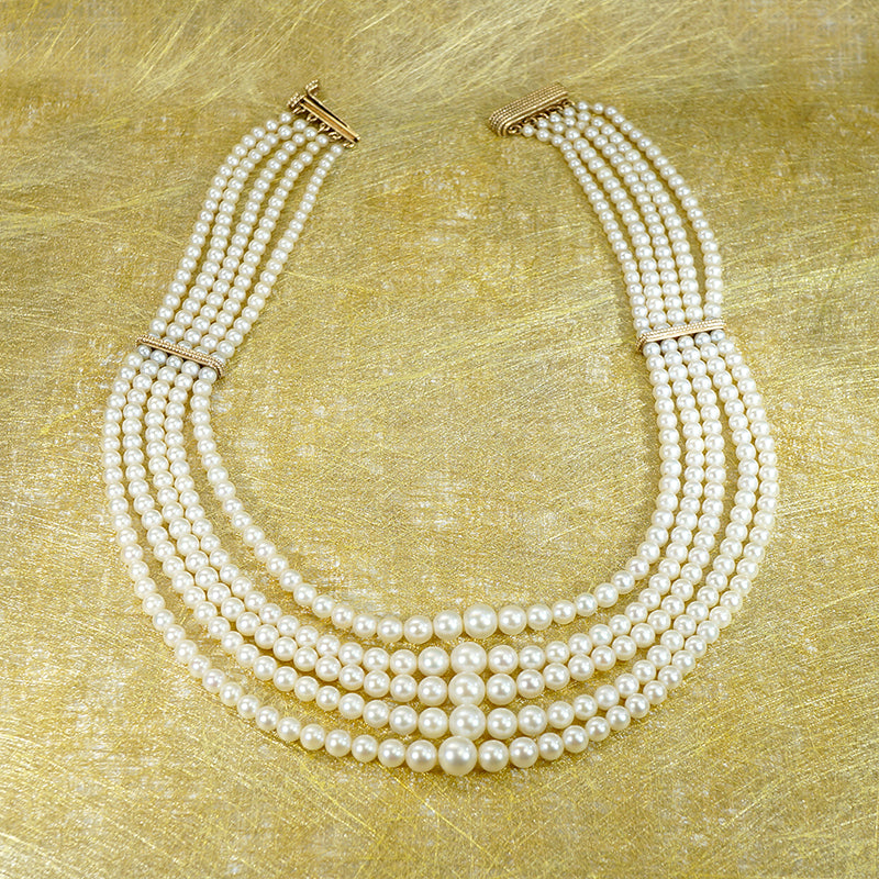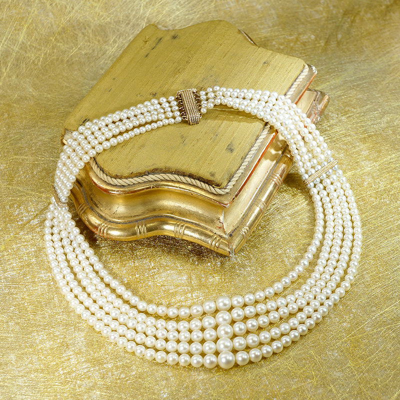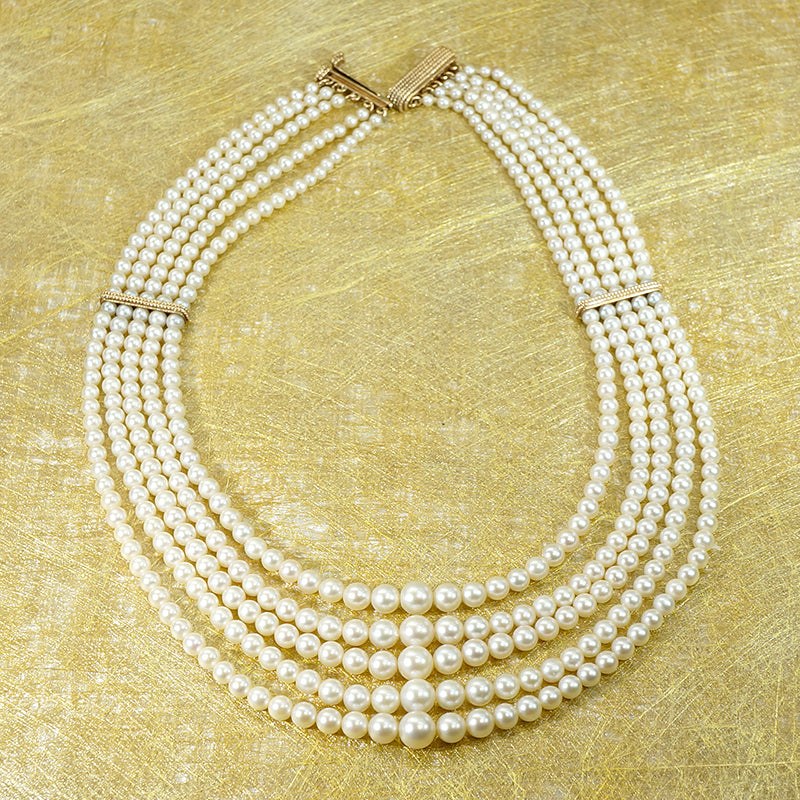 Oh my Atlantis...this pearl festoon necklace has all the mermaids gasping. Five strands of lustrous cultured pearls are gently graduated and held in place with 14k yellow gold spacers and clasp. The beautifully engraved findings ensure that the pearls lay just right along your collar bones. Multiple strands give this collar substance, but the design remains elegant and feminine. This necklace is a true statement piece, it reminds us of Audrey Hepburn in just about everything. Circa 1950.