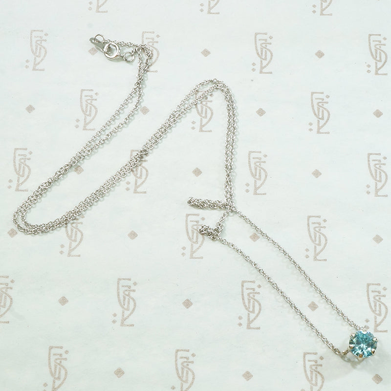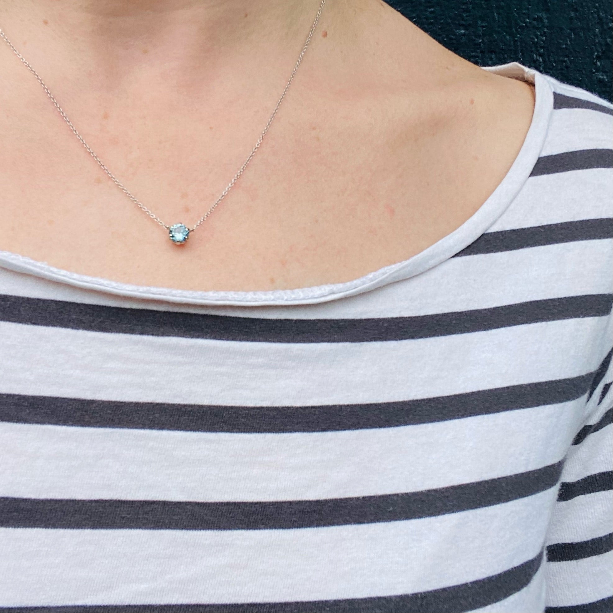 This classic 6 prong 14k white gold solitaire necklace is set with a Natural Blue Zircon. A wonderful addition to your jewelry wardrobe this beauty sits at that perfect spot making it easy to wear solo or with other necklaces. Classy, beautiful, and unique. The stone comes from our stock of vintage gems and the necklace is crafted of recycled gold. Made right here in our Portland, Oregon studio.