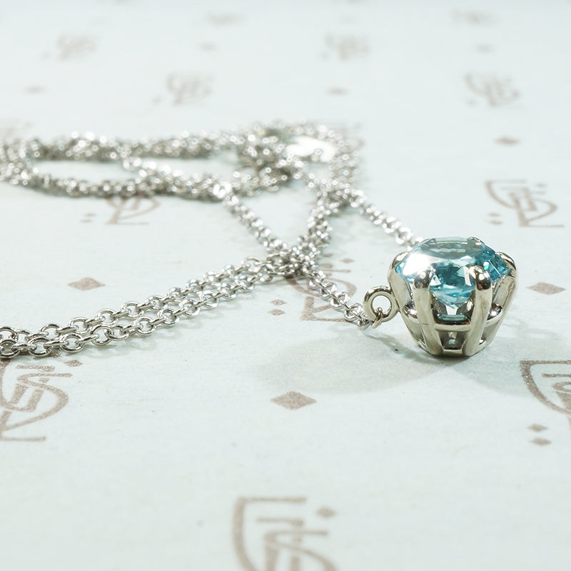 December’s Birthstone. Natural blue zircons have a high refractive index and bounce light around like crazy, resulting in a fabulous sparkle. Making this a nice alternative to a diamond pendant.