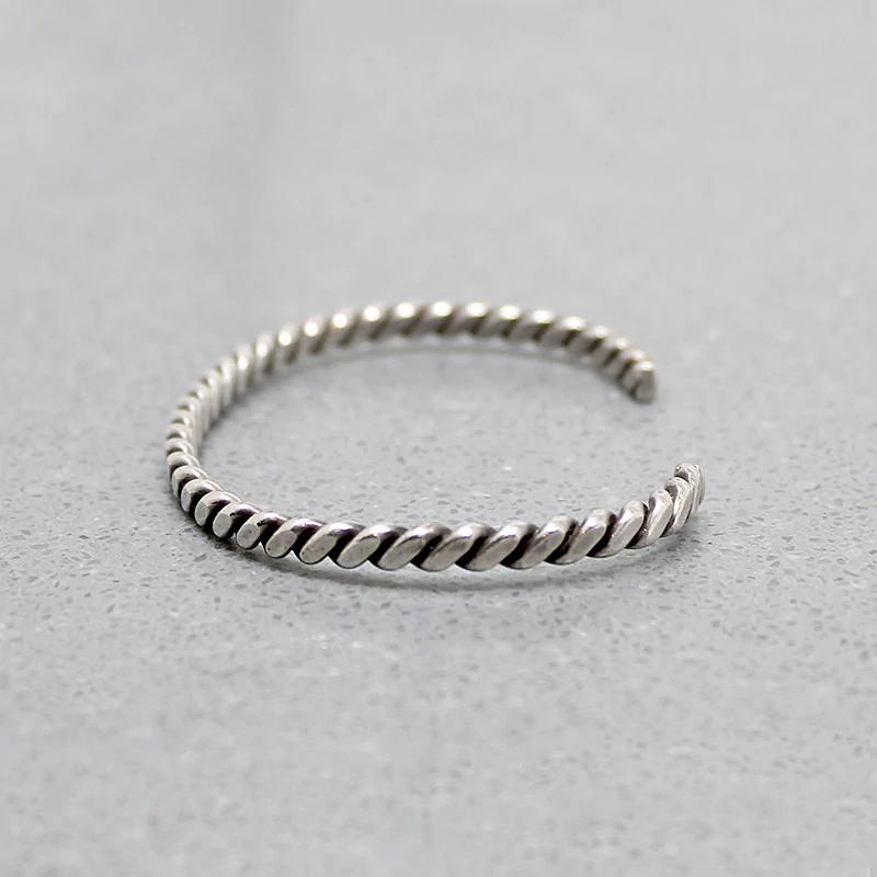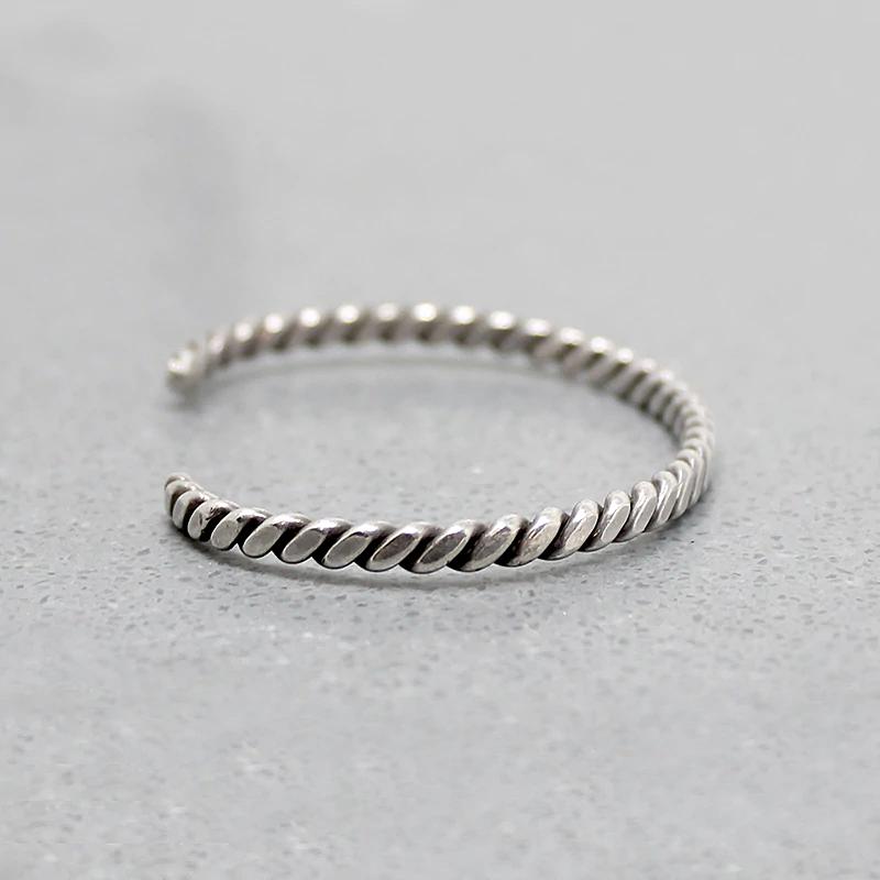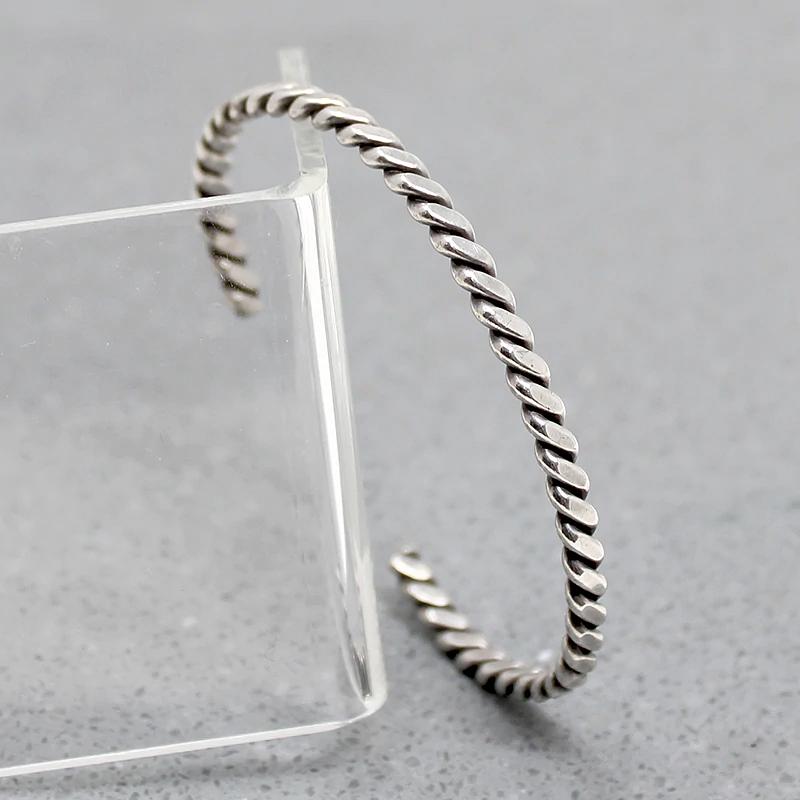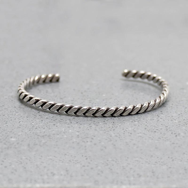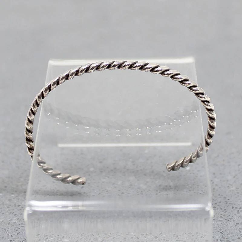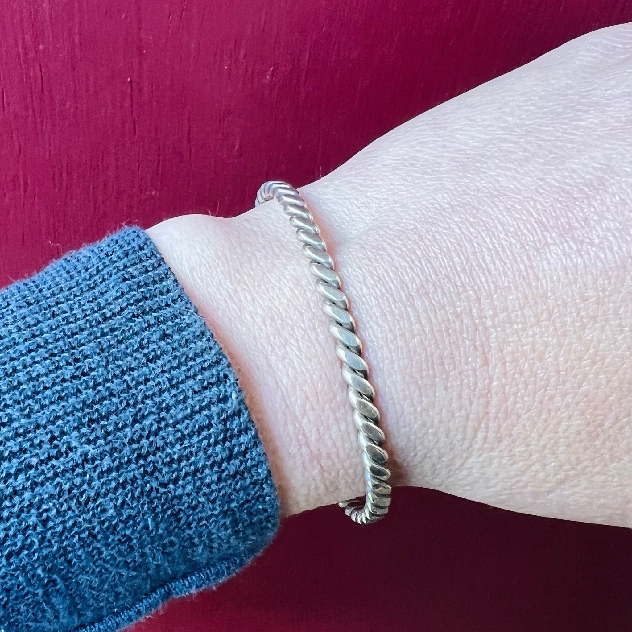 This twisted flattened sterling silver cuff is a lighter weight version of the classic style. Bright, shiny high points and dark oxidized low points create attractive visual interest. Great worn on its own or layered with other bracelets. Circa 1970.