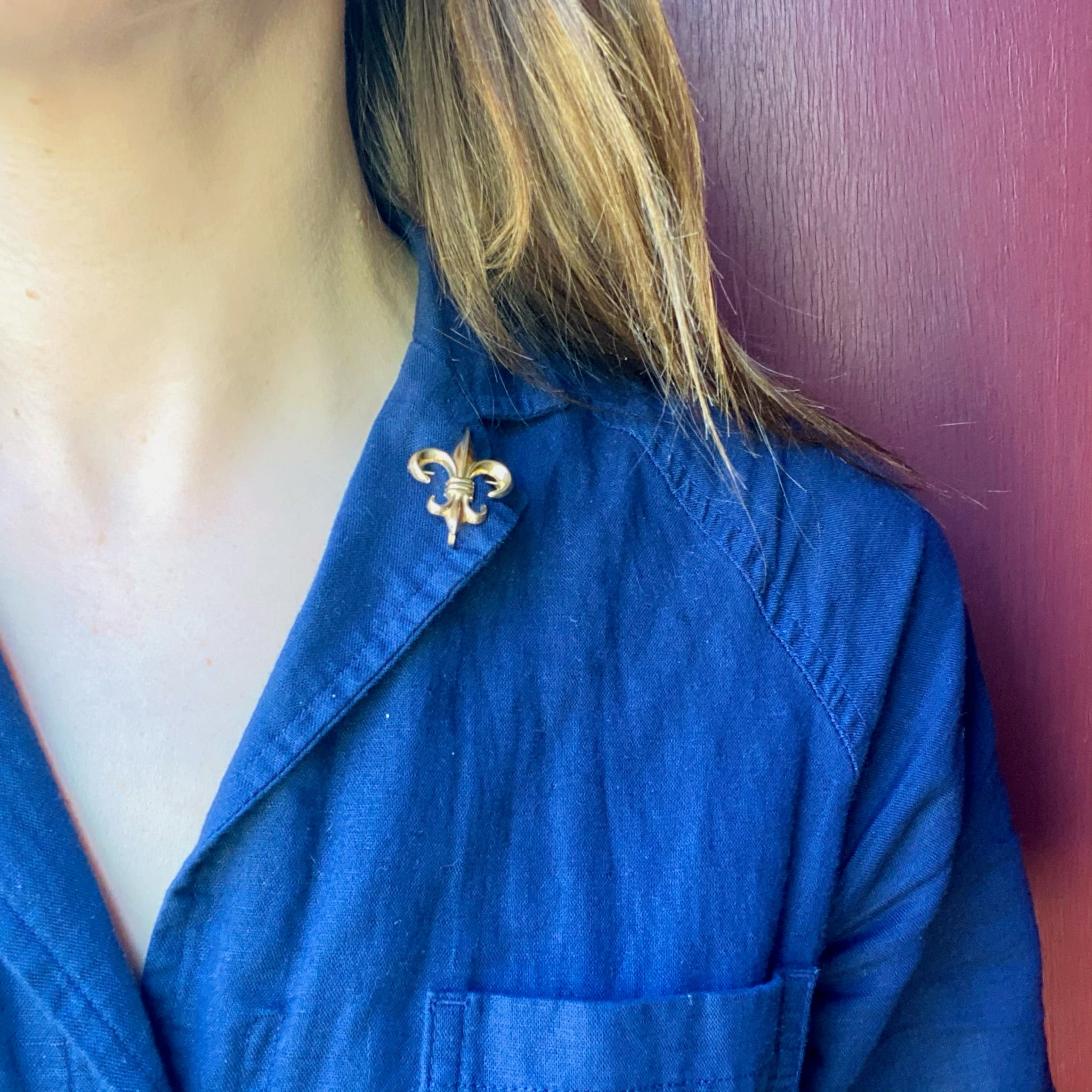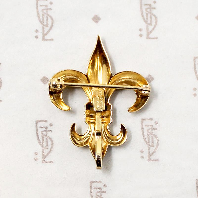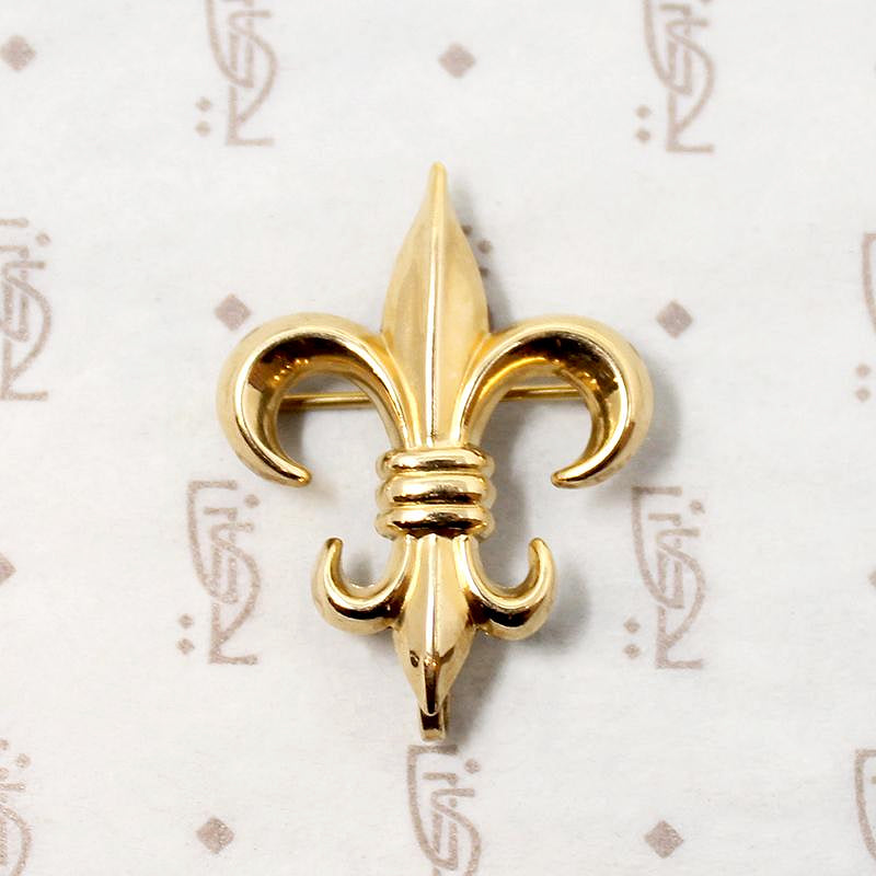 An elegant fleur de lis brooch sculpted with an almost architectural stateliness. This Victorian Revival brooch is made of, and marked for, bright, shiny 1/20 12k gold filled metal. The back has a safety clasp closure and a chatelaine hook meant for hanging a tiny watch or locket. The back is signed CA shot through with an arrow, the mark for Carl-Art Company. Circa 1940.
