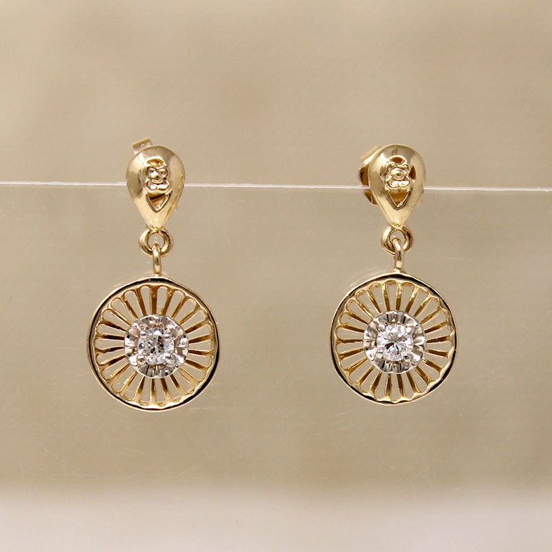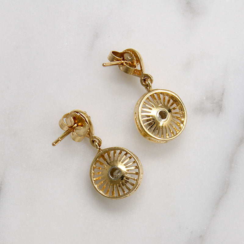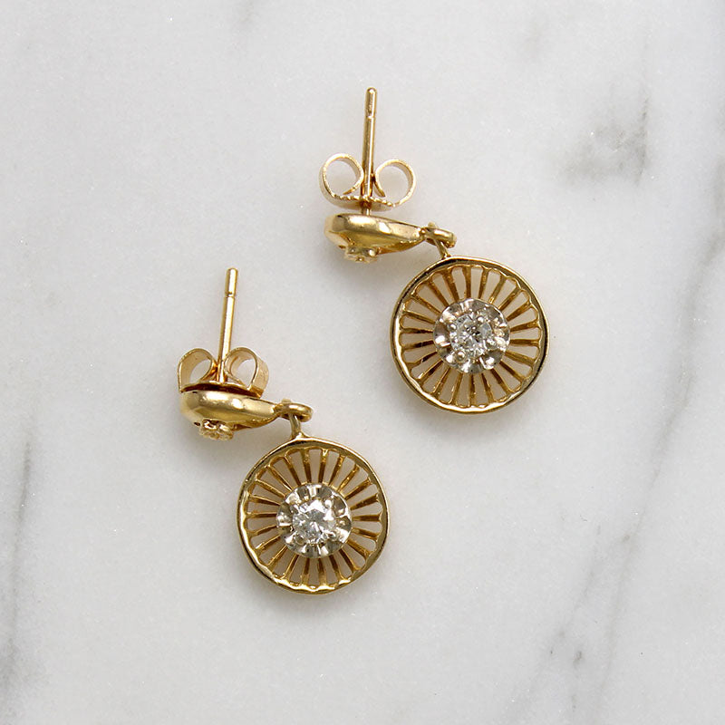 Sweet little Retro earbobs. Spoked 14k yellow gold discs dangle from inverted tear drop tops. A wee diamond sits at the center of each disc, sparkling away in a white gold buttercup setting. The earring tops are adorned with sculpted flowers. These darling bobs are lightweight and comfortable post earrings for pierced ears. Fun and flirty, daily wear favorites for certain. Circa 1940.