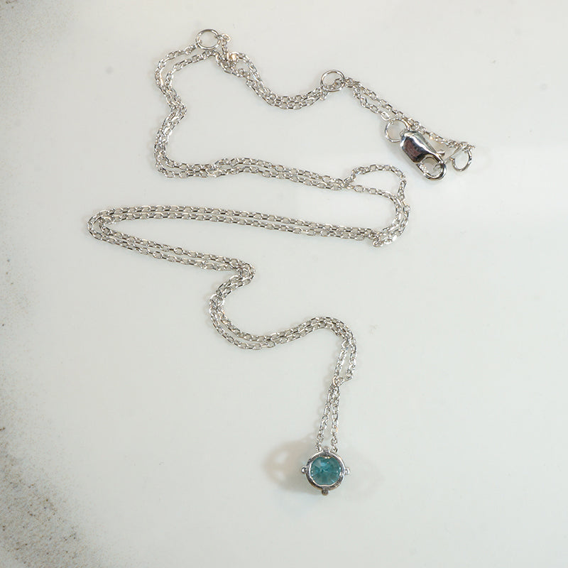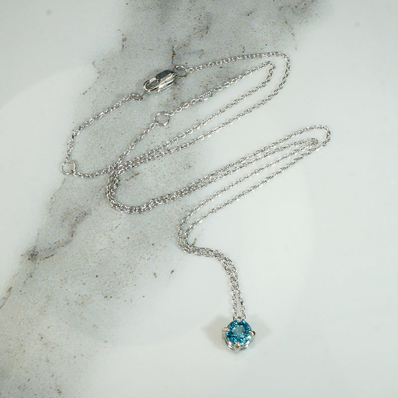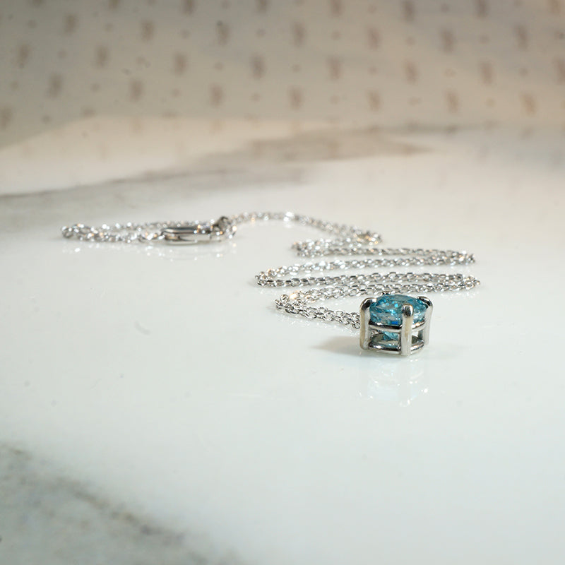 This floating zircon necklace is dazzling; the color and sparkle of a natural blue zircon are incomparable. Natural blue zircon has a very high refractive index of 1.93-1.98. The higher the refractive index of a gem, the more it sparkles. This 1.03ct zircon is displayed in a four-prong basket setting of 14k white gold. The basket moves freely on a 14k white gold cable chain. The faceted and adjustable chain finishes with a sturdy lobster claw. The vintage gemstone is from our collection, and the gold is sourced from a green-certified refinery.