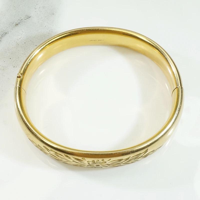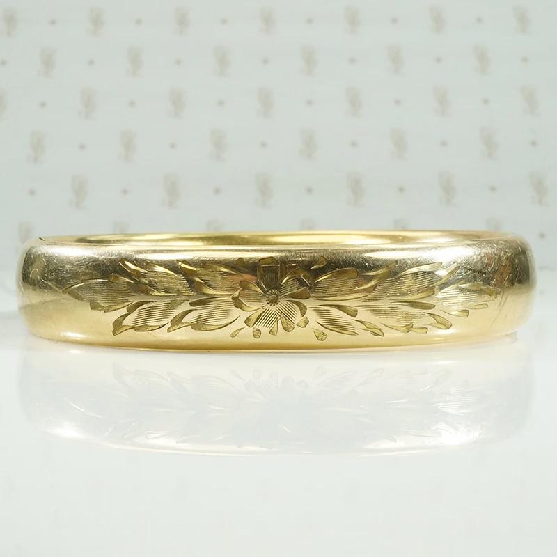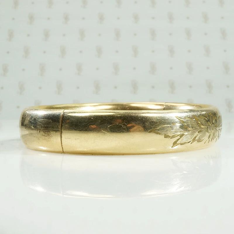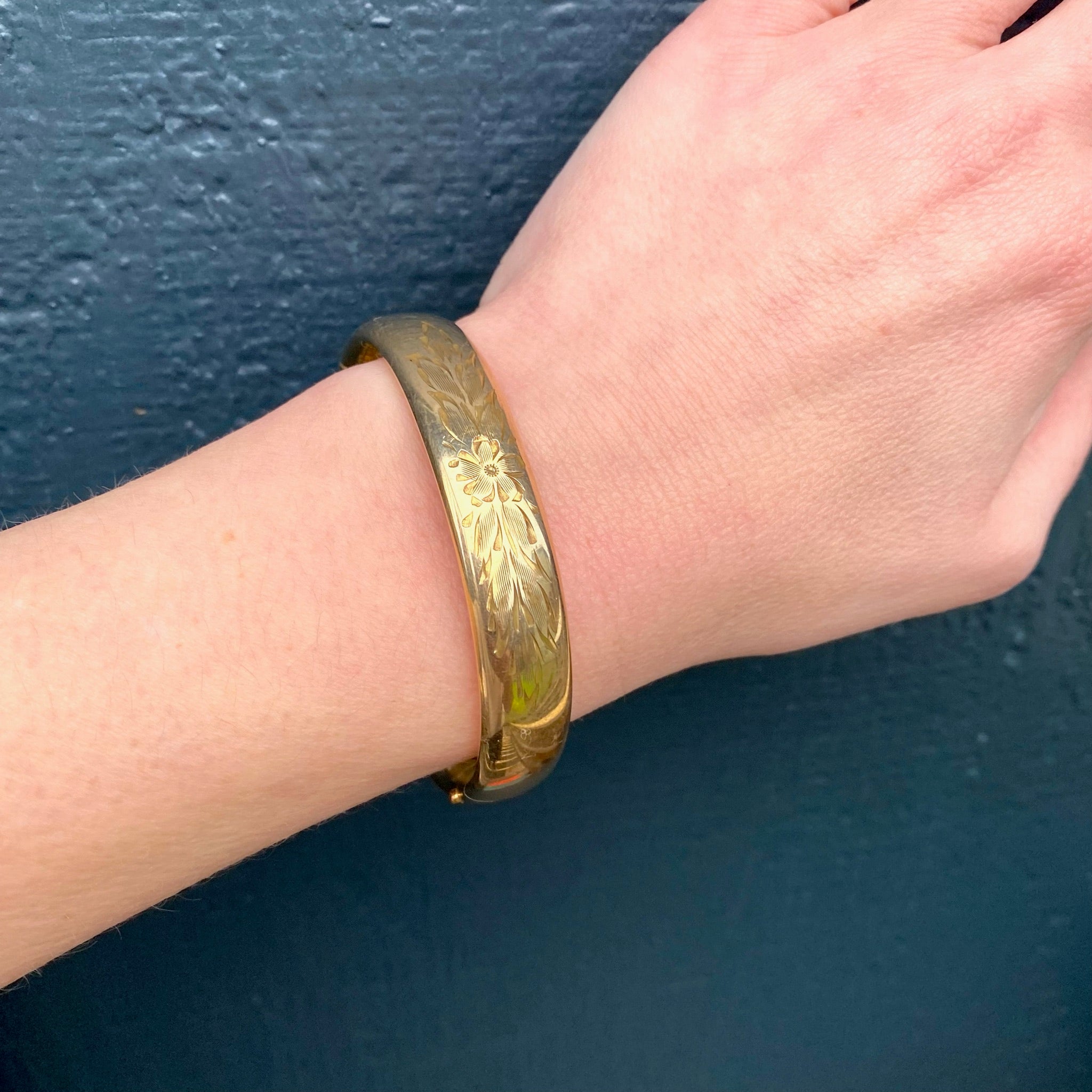 This Victorian Revival bangle bracelet is charming. An oval bangle of rich yellow gold-filled metal is engraved with a leafy forget me not flower. This is a popular design recurring frequently throughout the last 100 years. The engraving is crisp and pretty. The clasp and hinge are both in good working order. Circa 1920.
