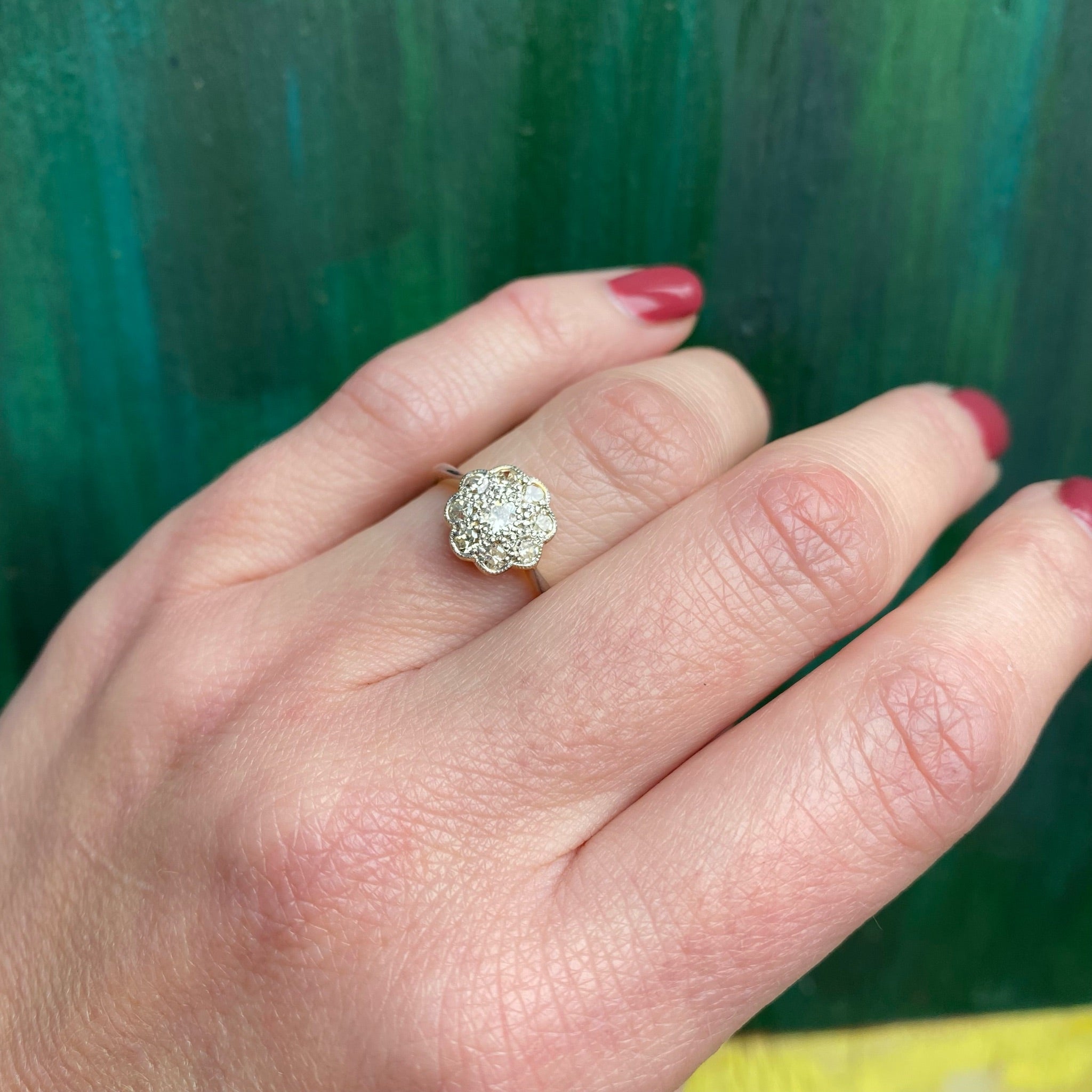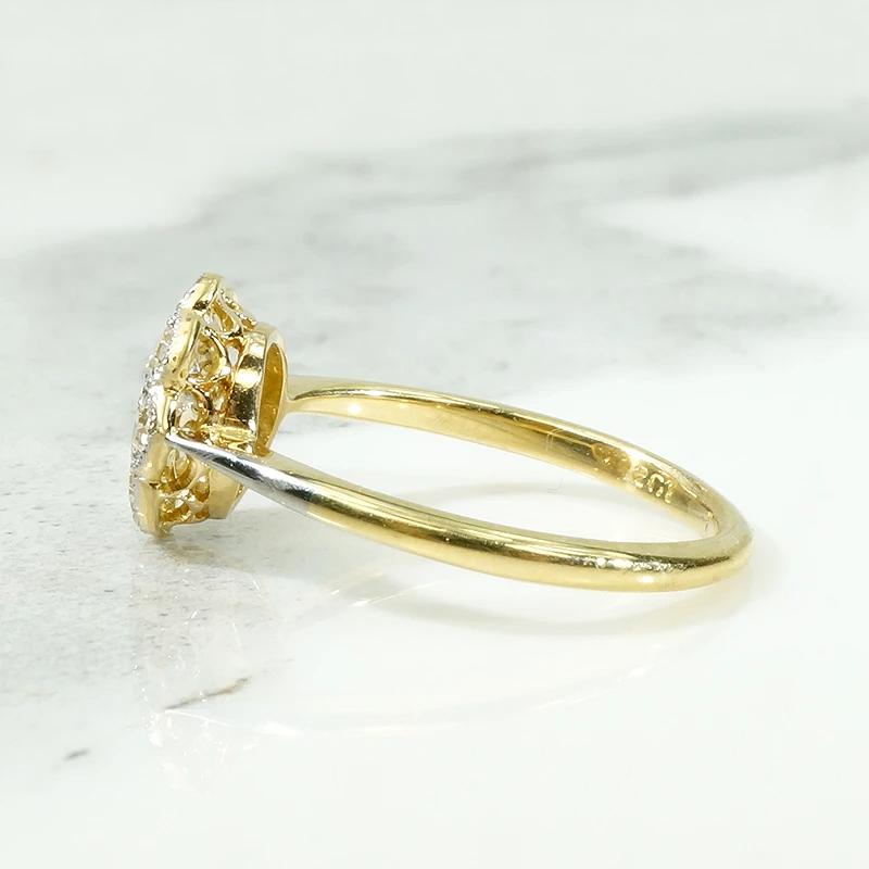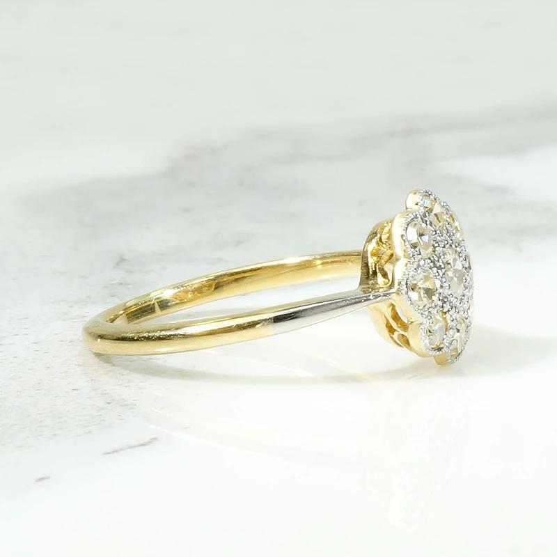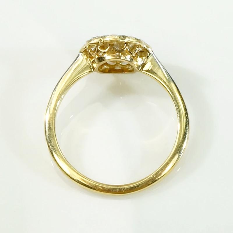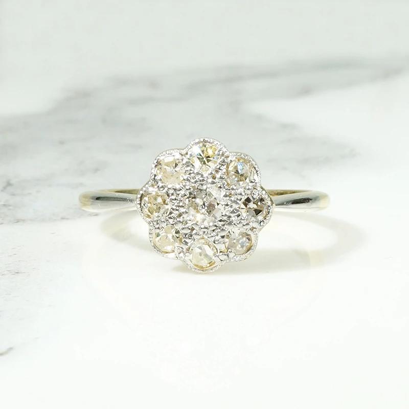 Fresh from London...our latest batch of enchanting jewels from Across the Pond. We love the luxurious Edwardian technique of layering diamond-spangled platinum over rich 18ct yellow gold. This delightful diamond cluster ring resembles a cheerful, many-petaled flower. A 0.50tcw cluster of diamonds sparkle in scalloped platinum settings, with delicate milgrain engraving surrounding the stones. The decorative top is layered over a pretty openwork 18ct gold gallery, and a layer of platinum covers the slim pinched shoulders. Such a sunny piece, this beauty will make you smile every time you look at it. Circa 1930.