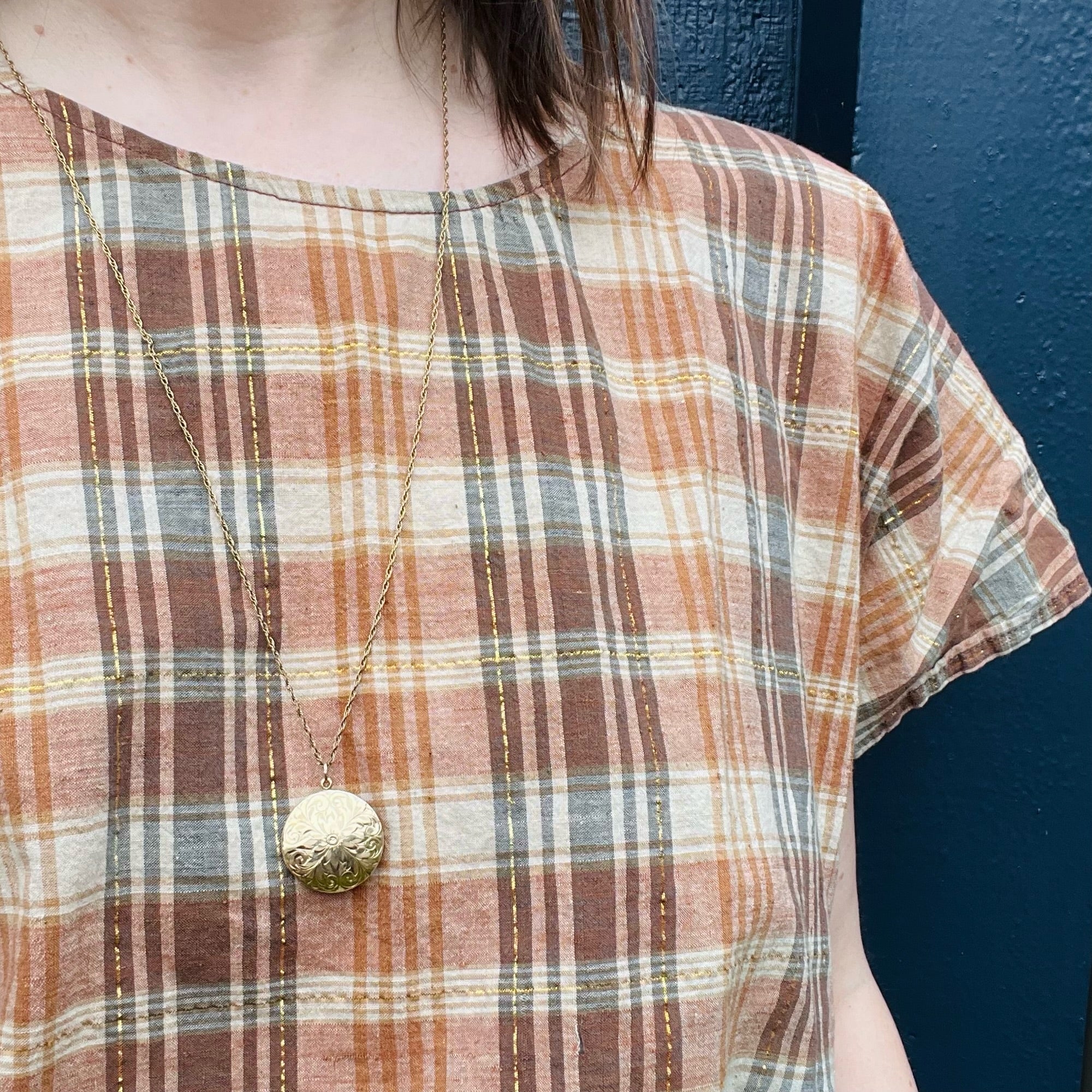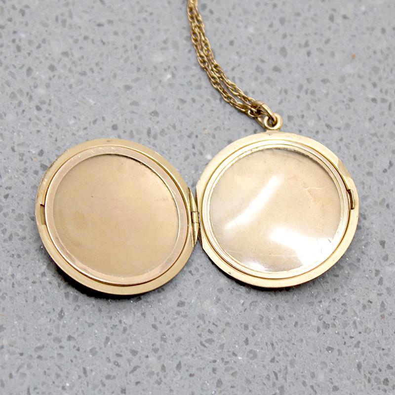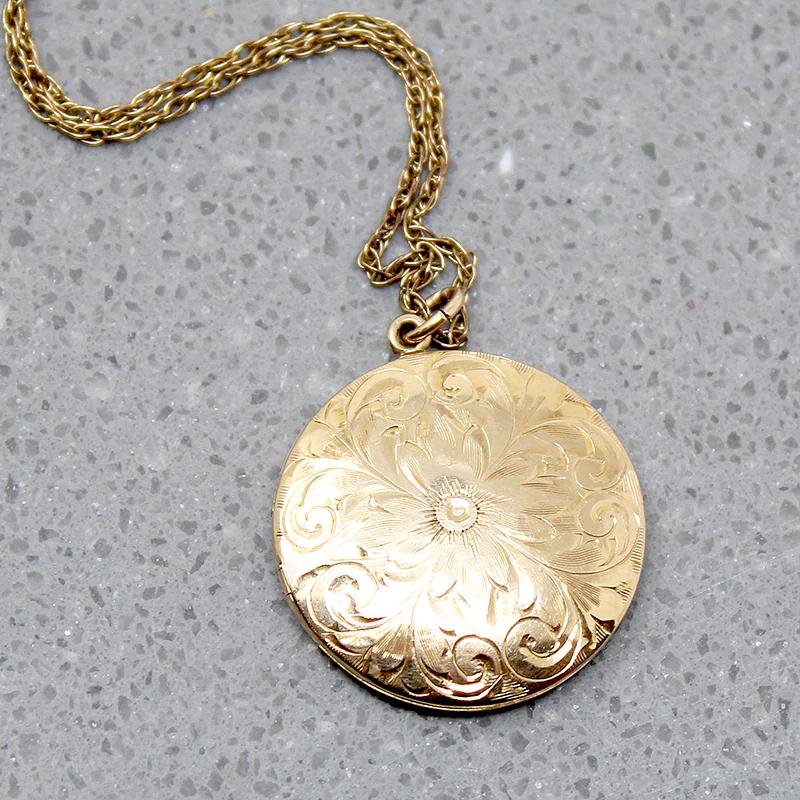 A delightful Edwardian locket of beautifully engraved 10k yellow gold. The locket's front is hand engraved with an exquisite flower. The back is highly polished. The interior is very clean, with intact glass and frames on both sides. This pretty locket hangs on a vintage gold filled rope chain. The perfect Mother's Day gift; it's just the right size for modern daily wear. Circa 1910.