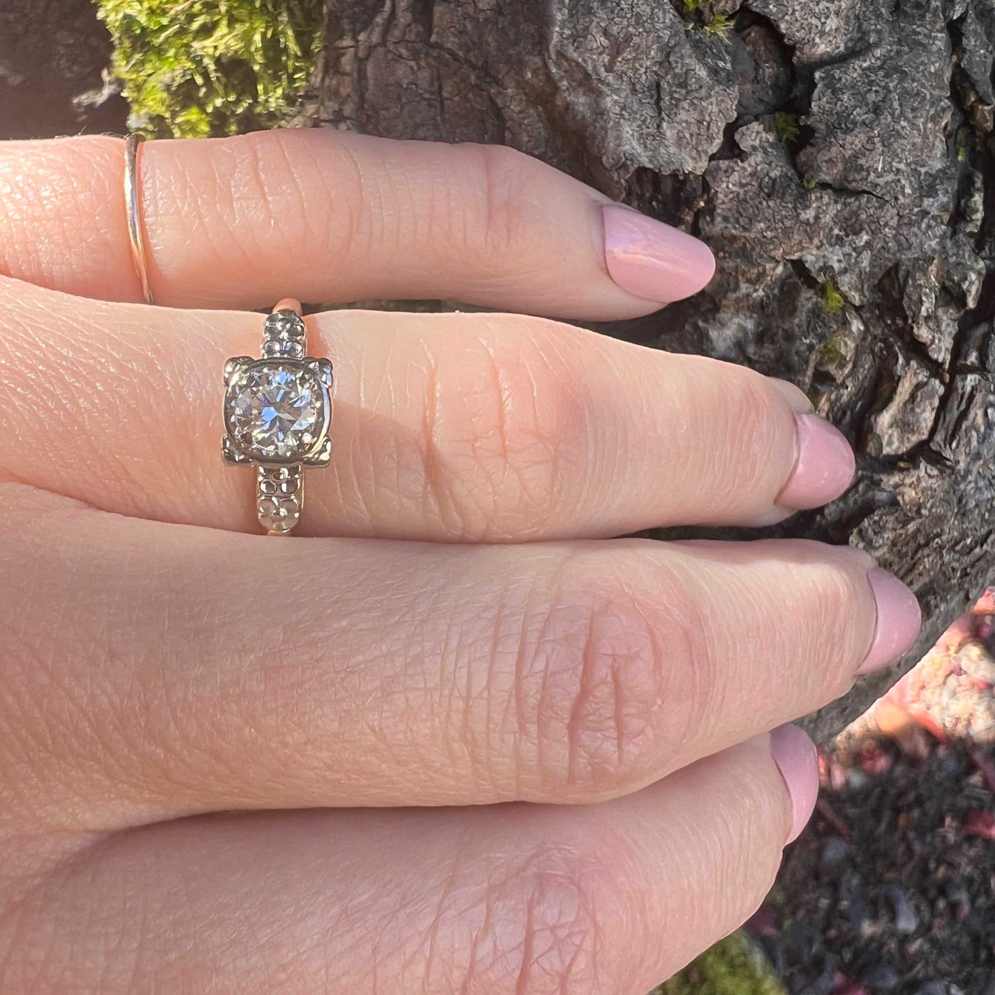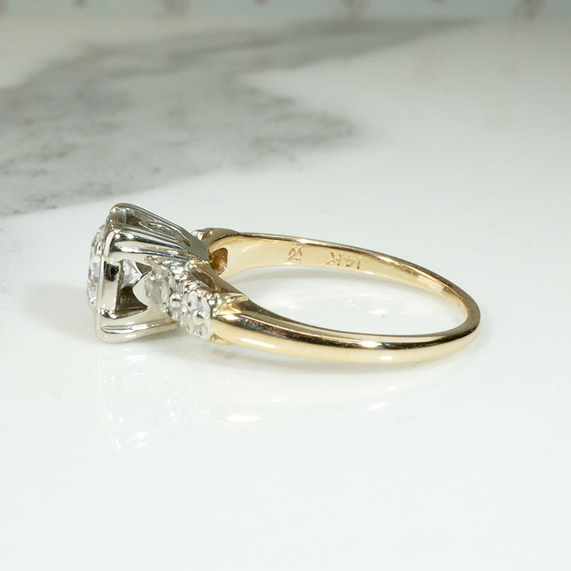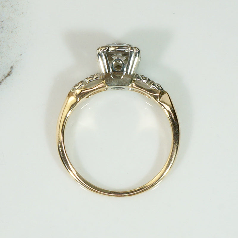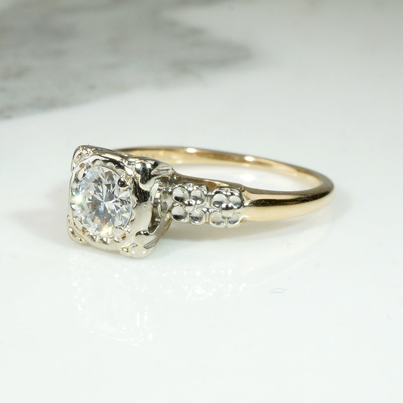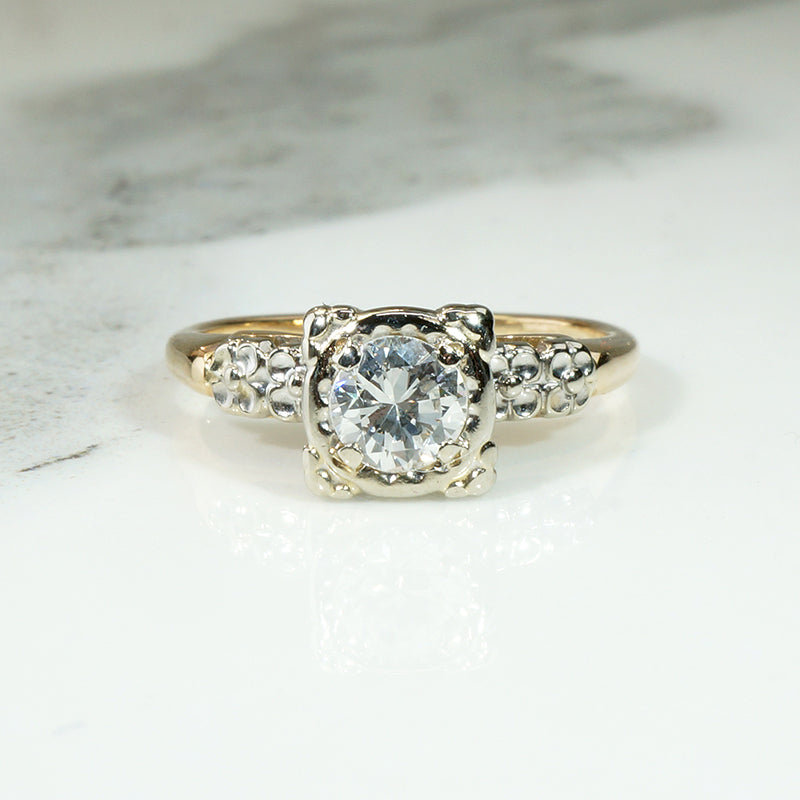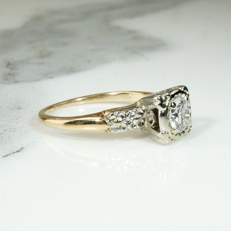 The shoulders of this darling 14k two-tone diamond engagement ring are engraved with tiny forget-me-not flowers. A sparkling diamond of approximately 0.40ct is held by fancy prongs in a pretty round white gold head. The white gold forget-me-not shoulders are set in the yellow gold body of the elegantly tapered ring. The interior of the slender band is signed "Trad." This sweet engagement ring is versatile: it will pair nicely with a band of either white or yellow gold. Circa 1940.