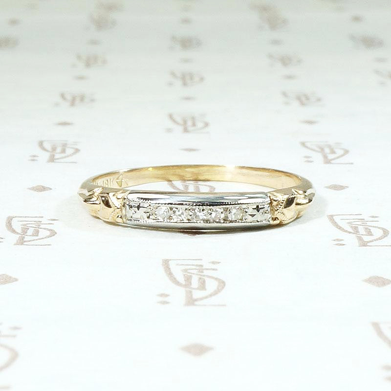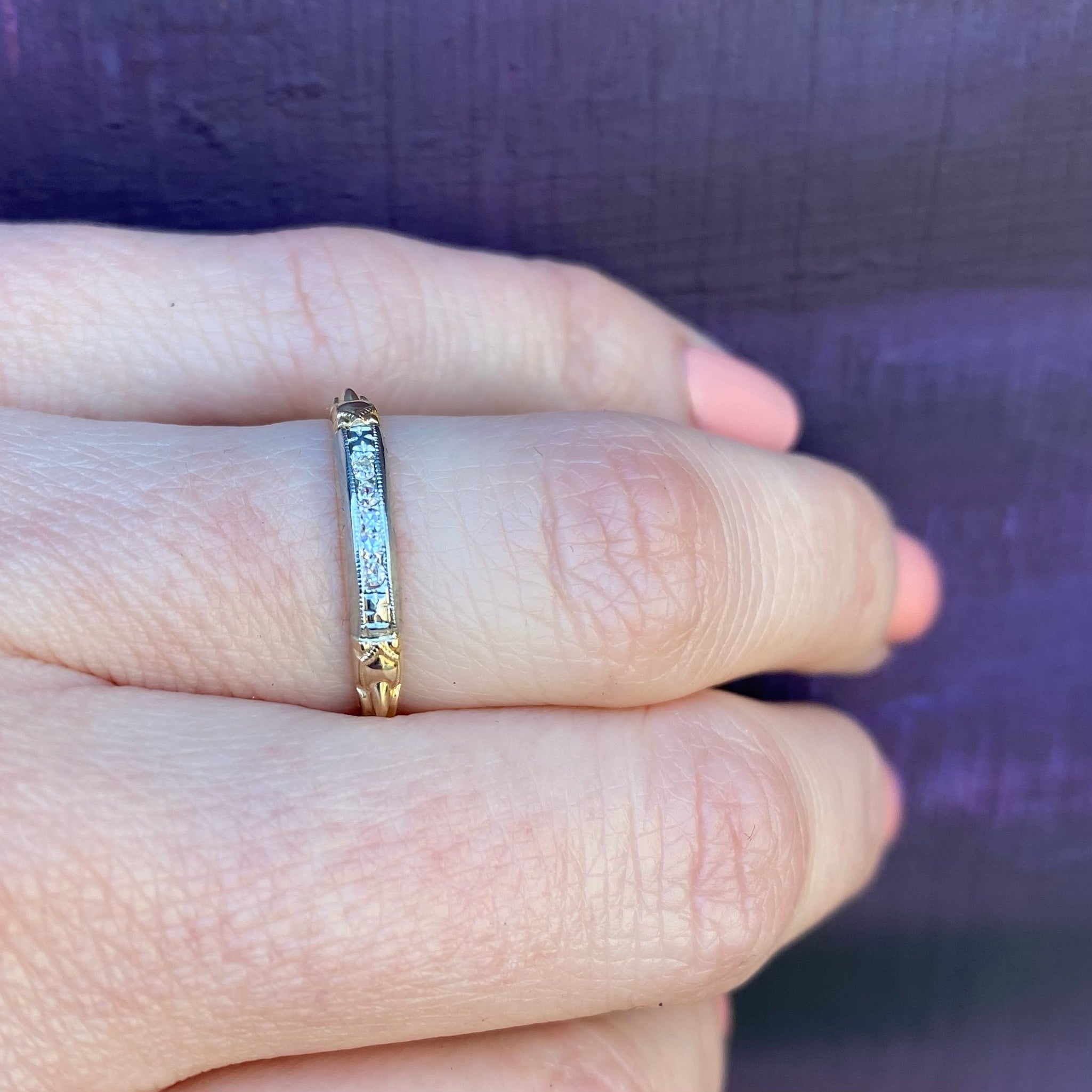 This lovely vintage wedding band is in immaculate condition. A delicate two tone band, crafted in 14k and 18k gold, has five little diamonds set in a white gold bar across the top. The bar is edged with milgrain beading, and tiny forget me not flowers are engraved at each end of the row of stones. The body of the ring is yellow gold, with sculpted buckle details at the shoulders and a gently tapered band. A versatile wedding band with sweet details. Circa 1940.