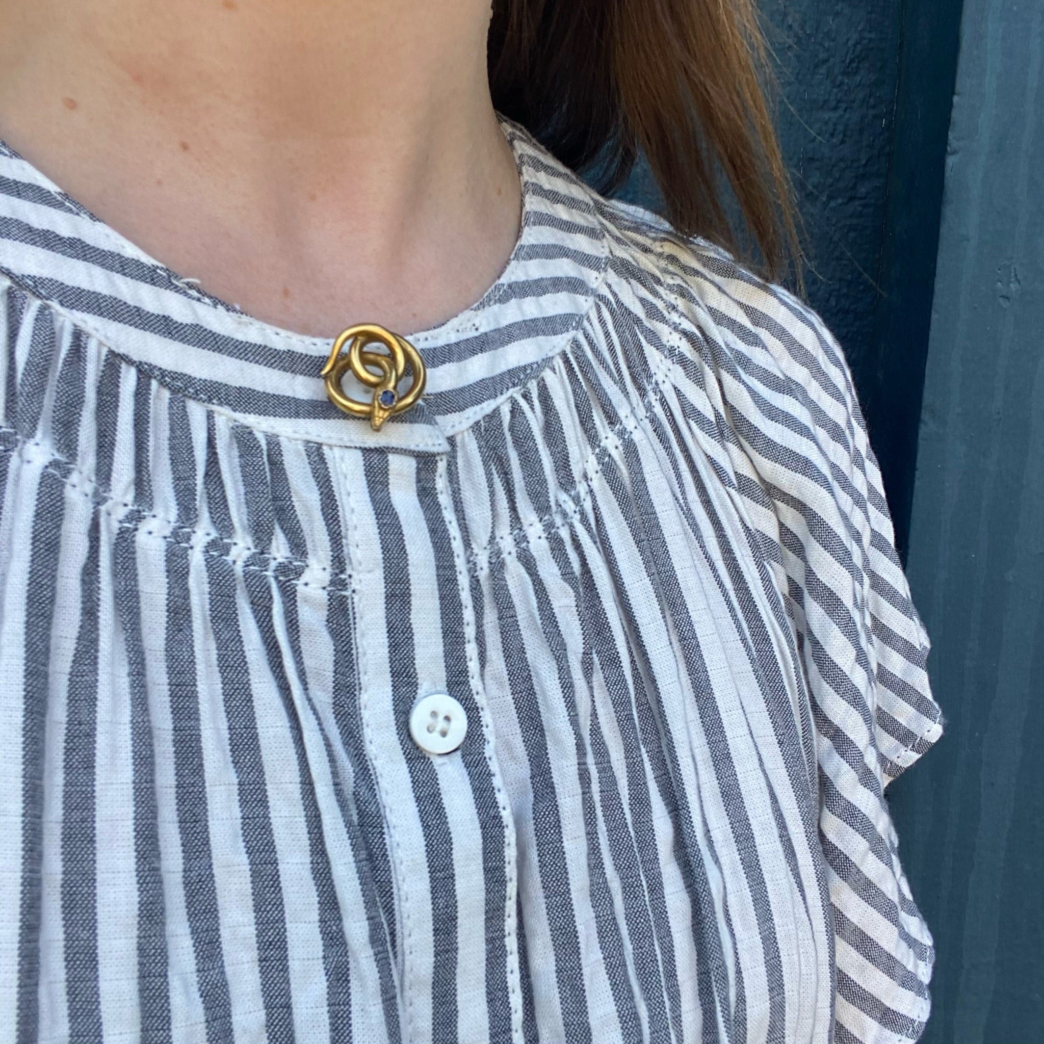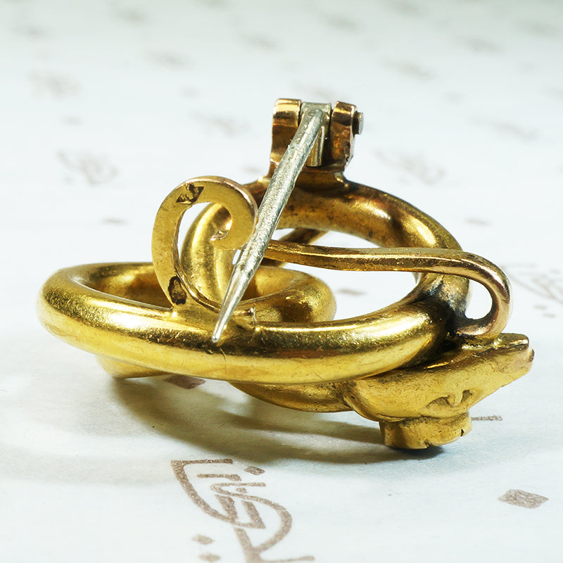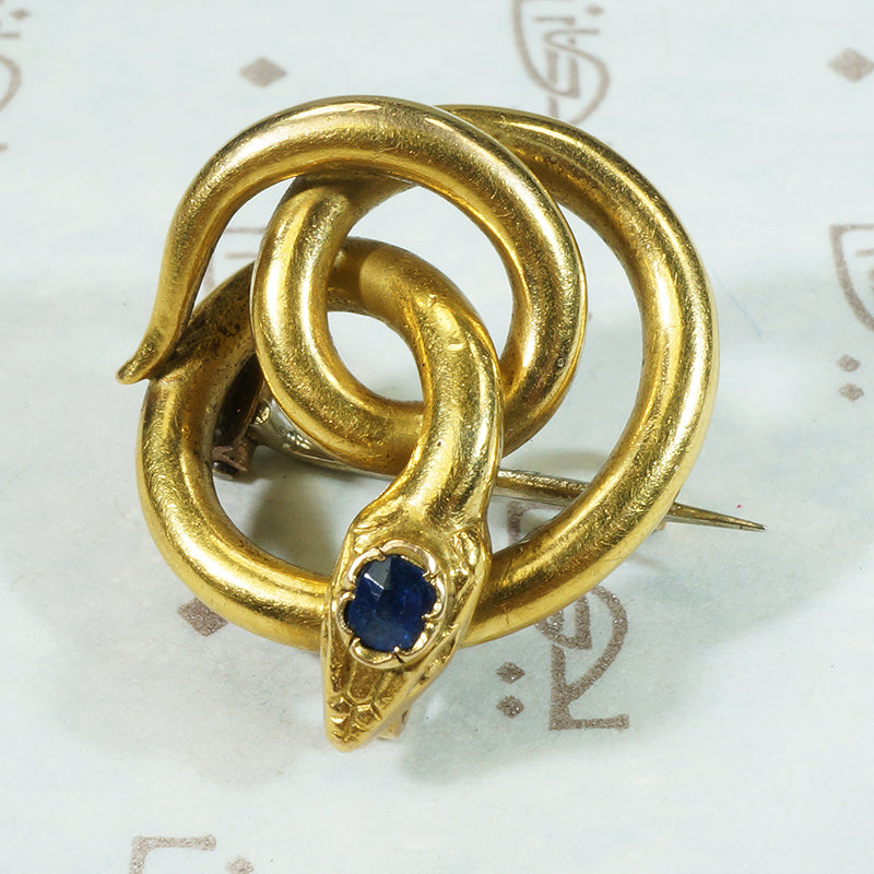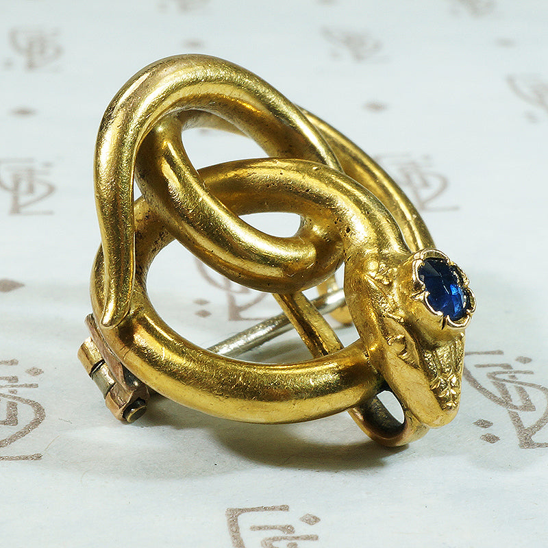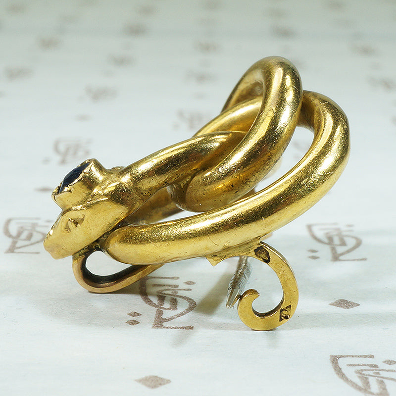 Snake jewels were often given as love tokens in the 19th century, and this beauty would have been quite the gift. The 18k yellow gold snake winds and curves into the shape of a love knot and is set with a deep blue cushion cut natural sapphire. The clasp is fully hallmarked with the French mark for 18k gold fineness and a makers mark and the back has a hook from which to suspend a locket, fob, or charm. Circa 1860.