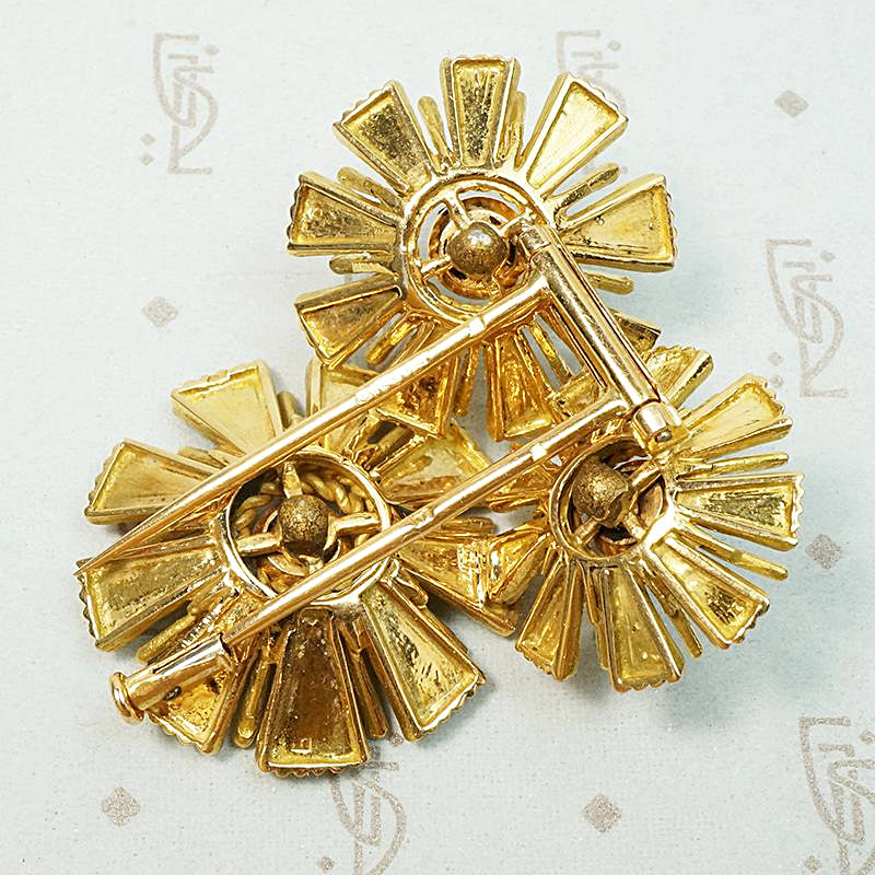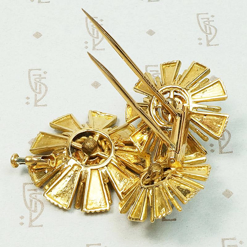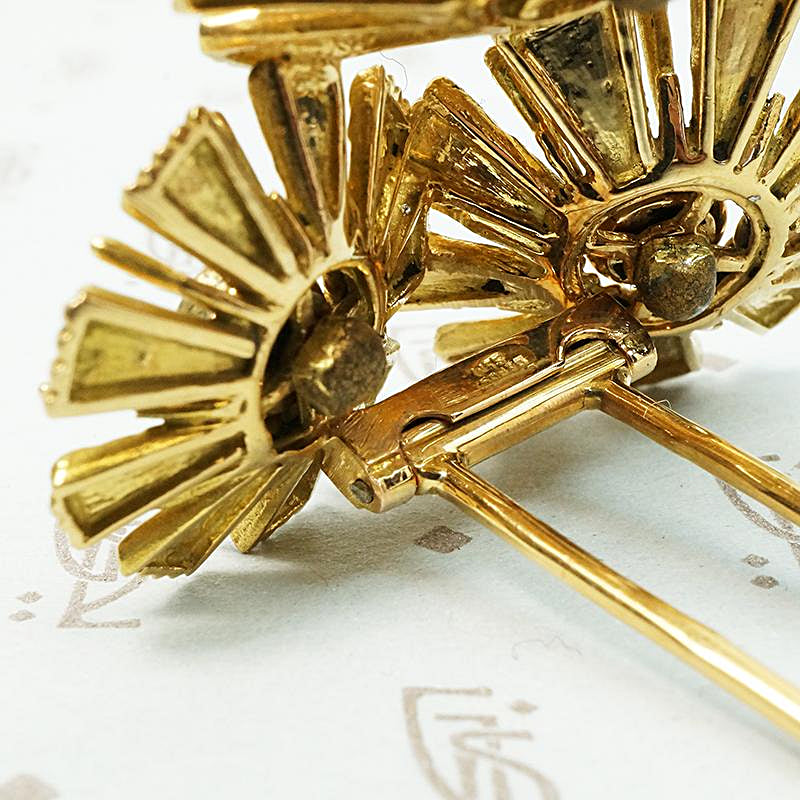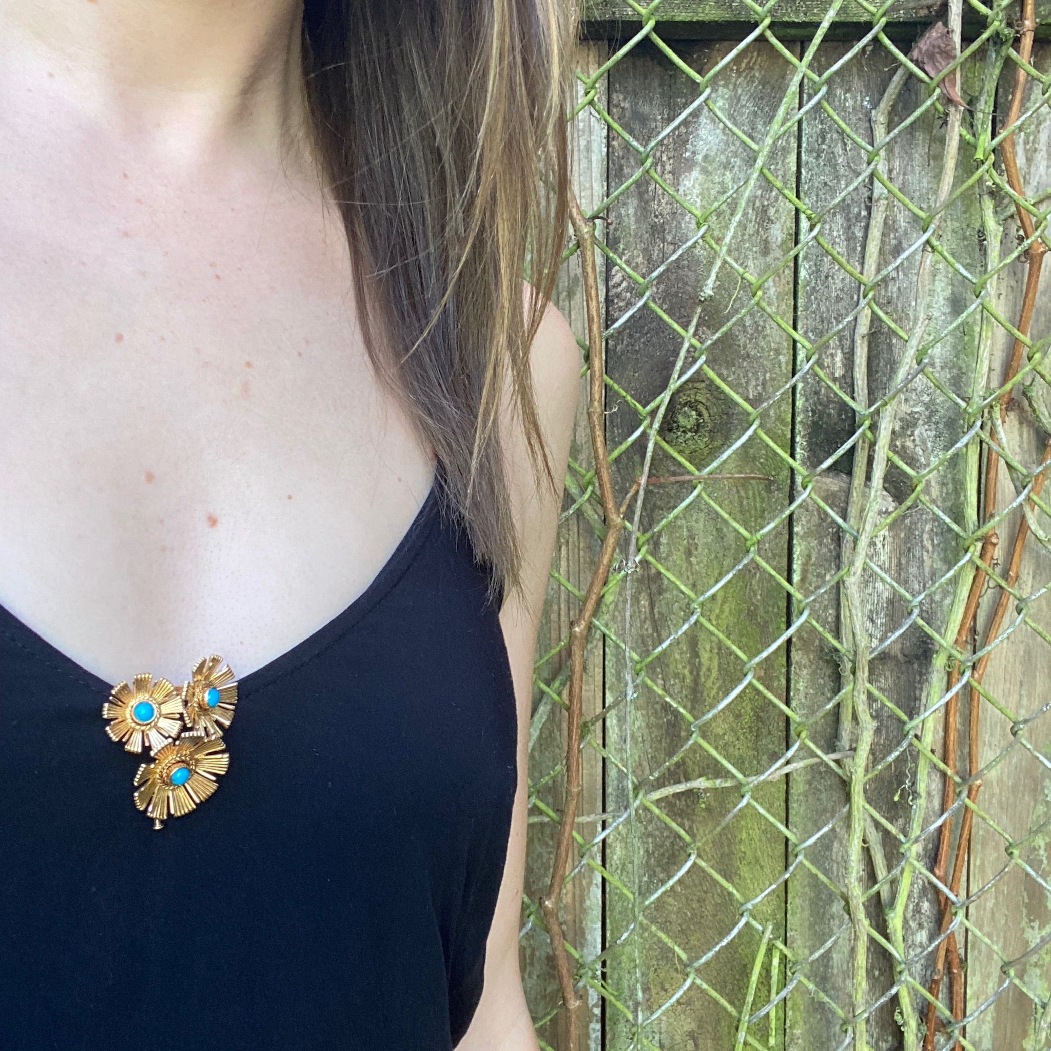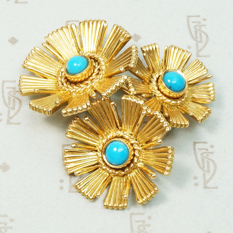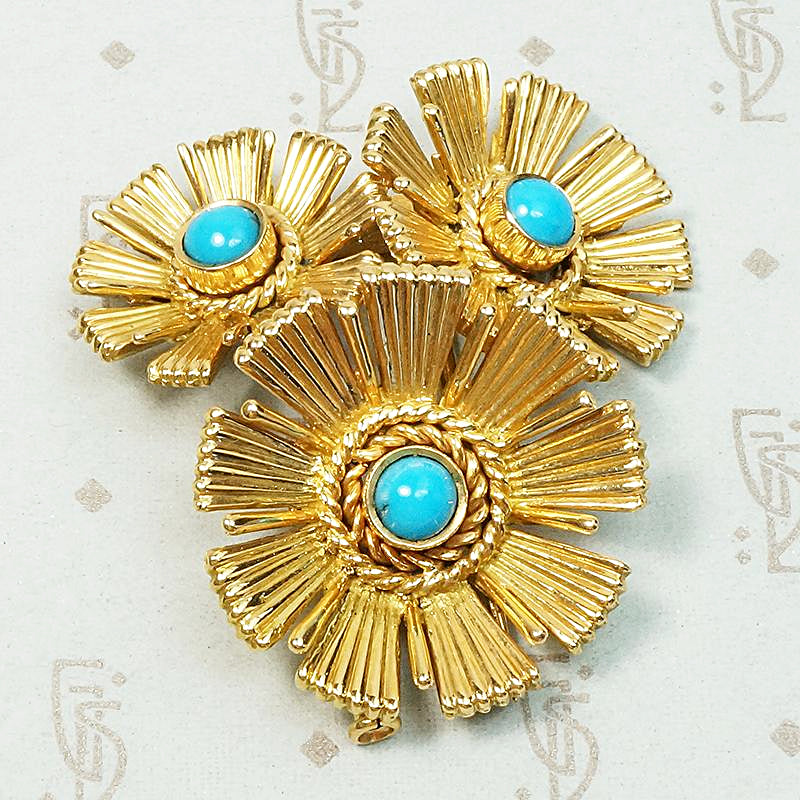 This fun European brooch evokes Pop Art glamour. Persian turquoise and luxurious 18k yellow gold is such a vibrant combination. Three stylized gold flowers have turquoise cabochon centers. The gemstones are bezel set and framed in gold rope detail.  The long double-pronged clip on the back is marked Déposé SSM. The clip is also marked with the French export Mercury's head hallmark. The hallmark for date is illegible, but the piece dates to 1960-70. A playful piece that gets serious with the quality of its materials and construction.