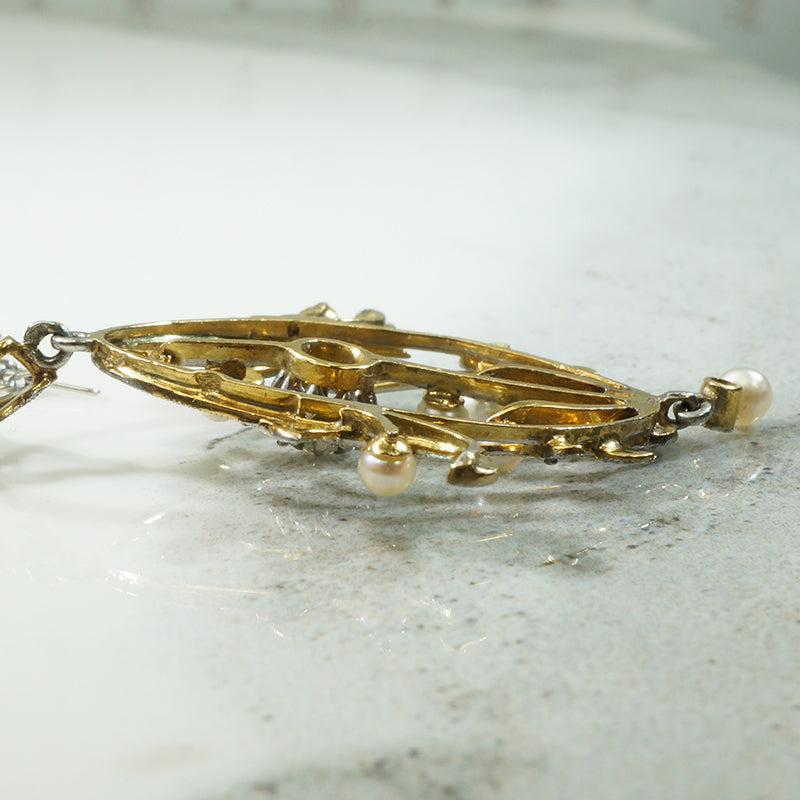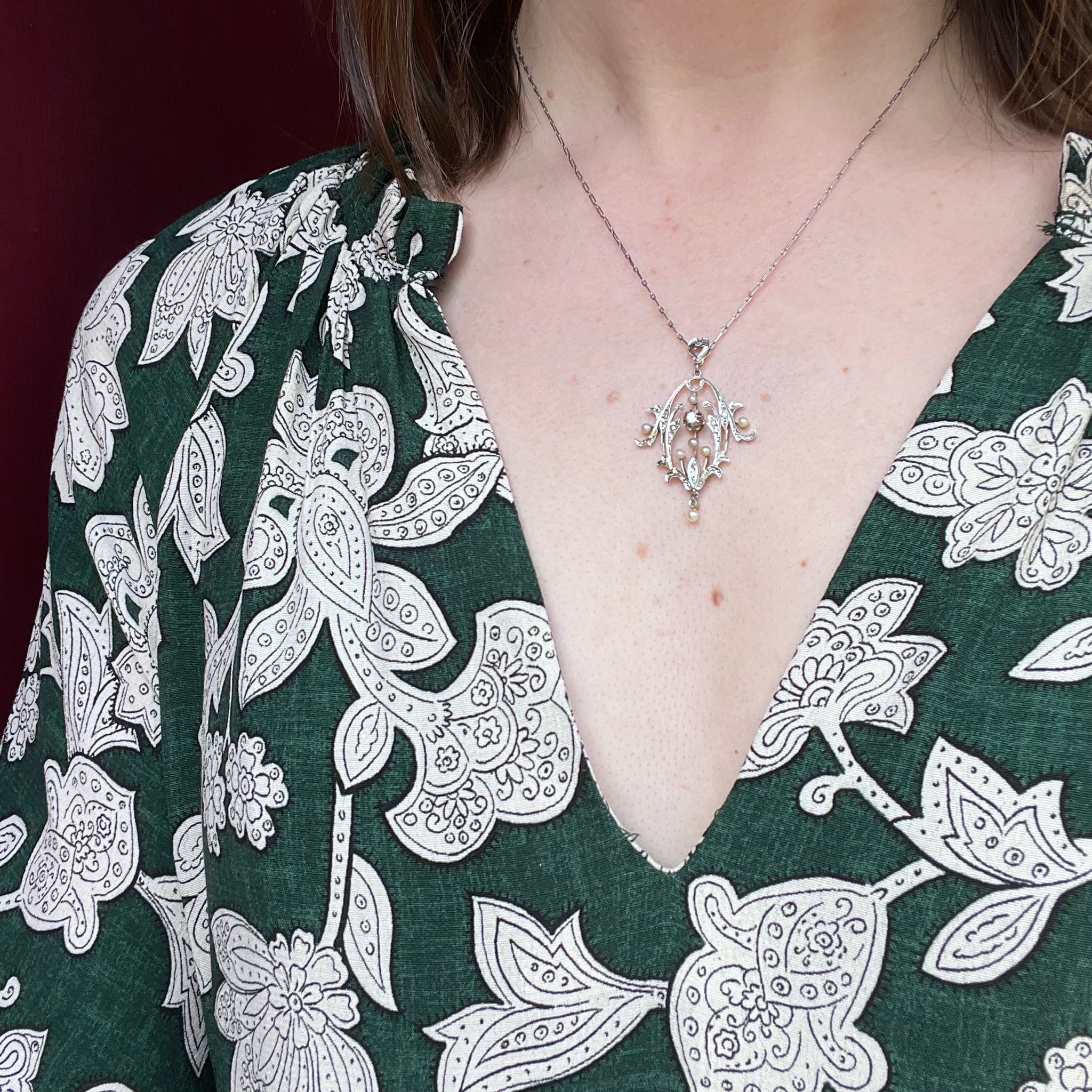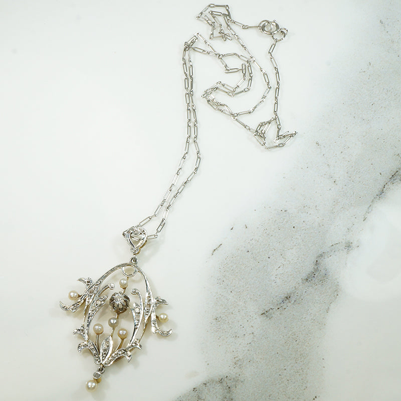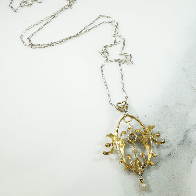 Art Nouveau and Edwardian meet beautifully in this French 18k gold and Platinum pendant. The swirling design is studded with rose cut diamonds and creamy pearls and the center holds a sparkling round diamond. The pendant is crowned with a pretty engraved bale and finished with a suspended rose cut diamond & pearl. The chain is an antique platinum paper clip link. This would be a perfect wedding necklace. Circa 1910.