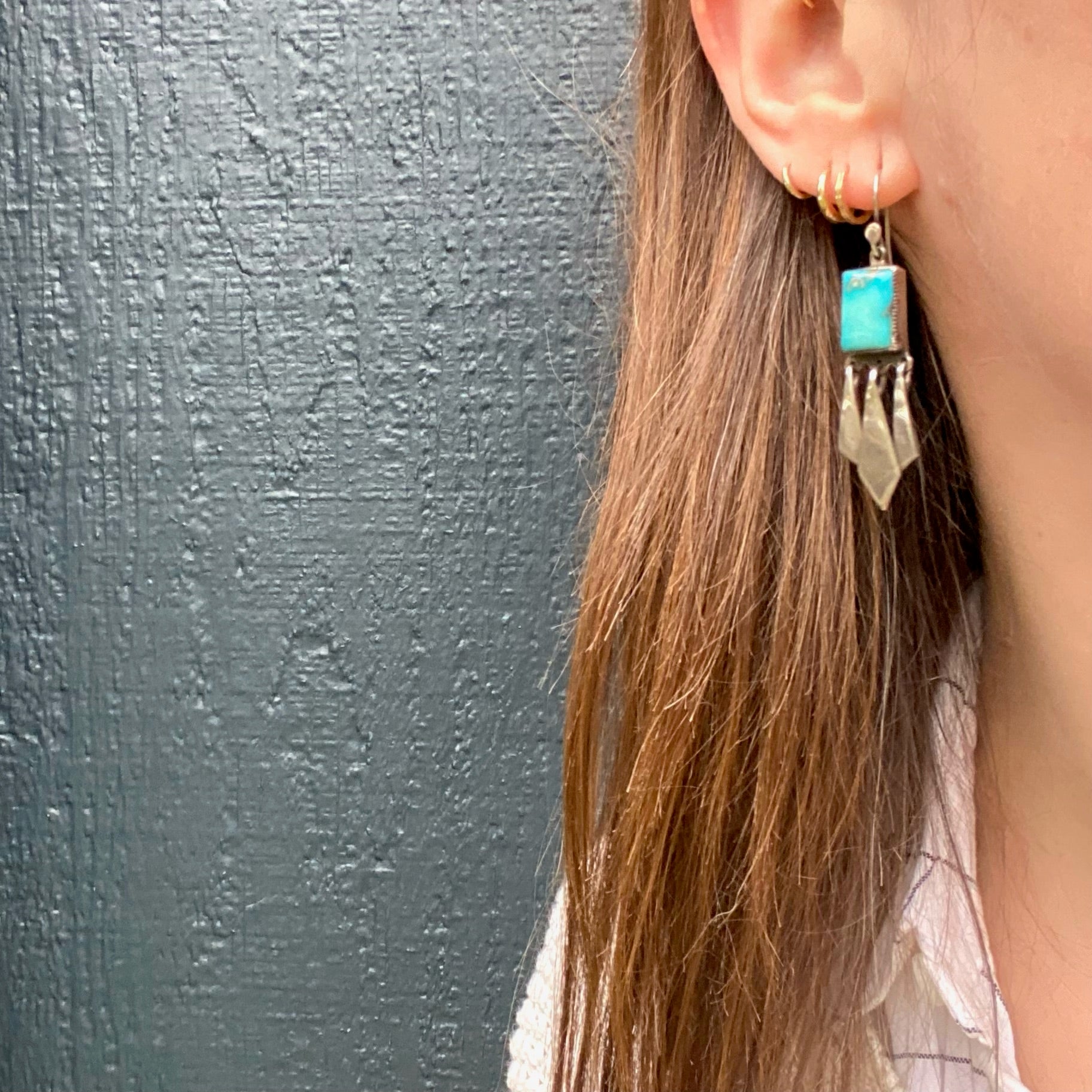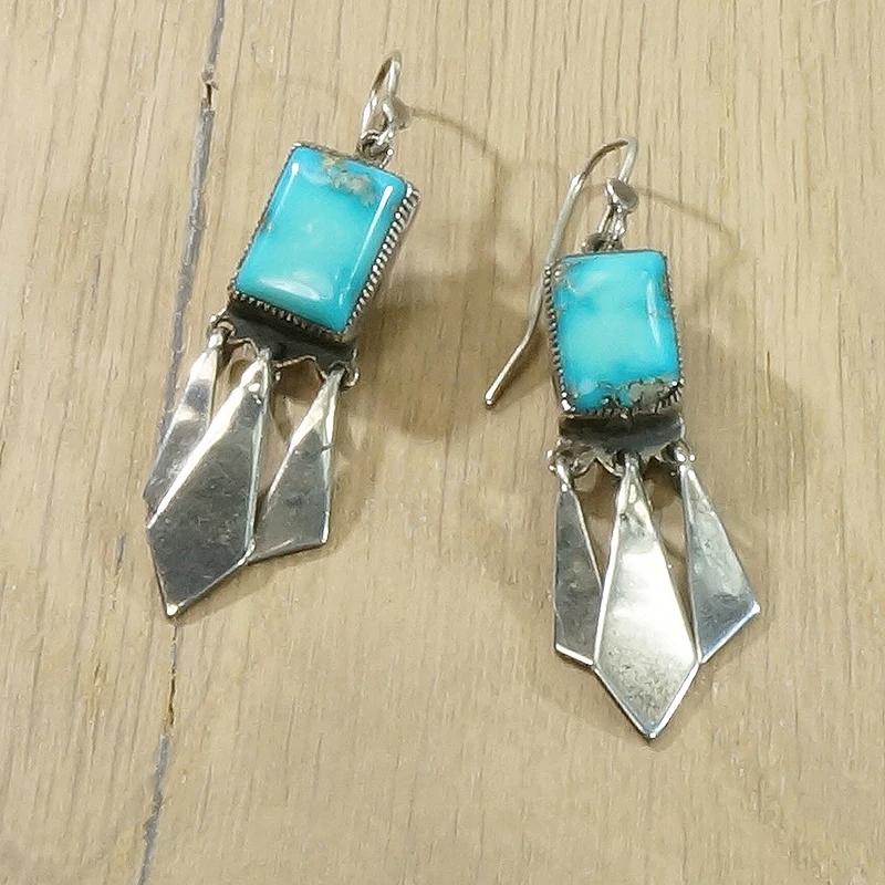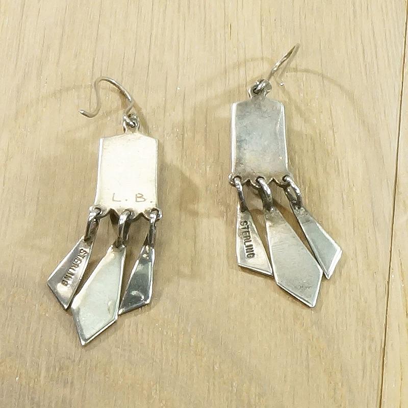 These long and lovely sterling silver earrings are set with turquoise and fringed with silver dangles. The earring tops are rectangles of vivid blue turquoise set in hand cut bezels. A fringe of three blade-like silver dangles hang from the turquoise. These earrings are bold and beautiful, with graceful movement. They hang on sterling silver French ear wires. The back of the earrings are signed "L.B" and one dangle on each earring is marked "Sterling." Circa 1970.