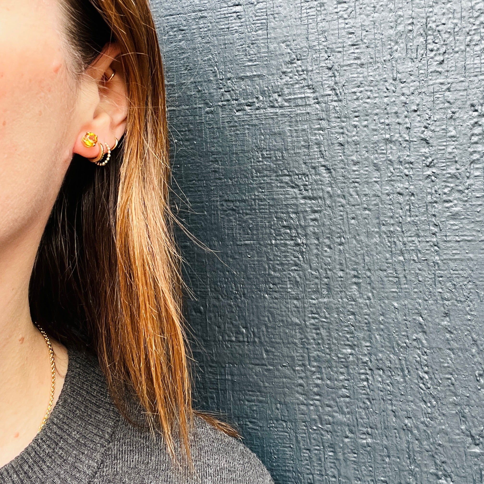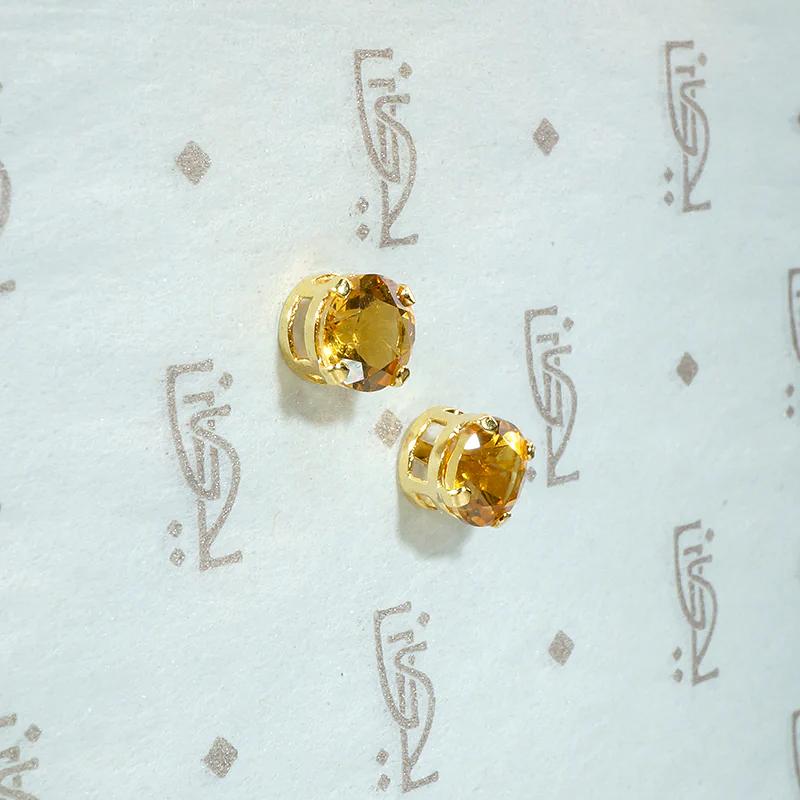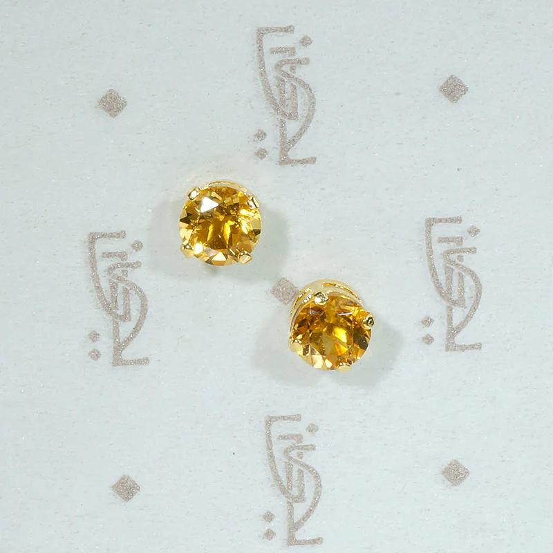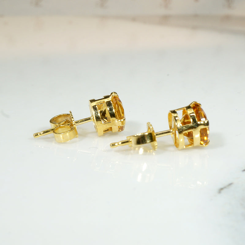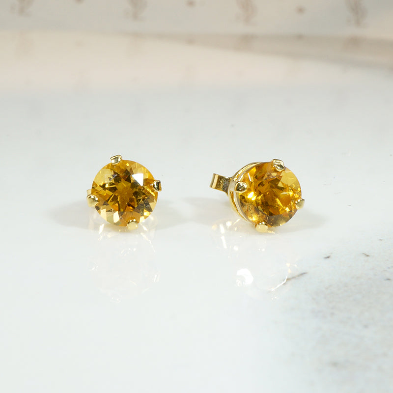These vintage stud earrings feature warm and wonderful citrine gemstones, like frozen honey. The round vintage gems sit in 14k yellow gold four-prong basket settings, with friction posts and tension backs. These studs are comfortable and easy to wear, great for every day. Citrine is November's birthstone and is the gem associated with the zodiac sign Leo.